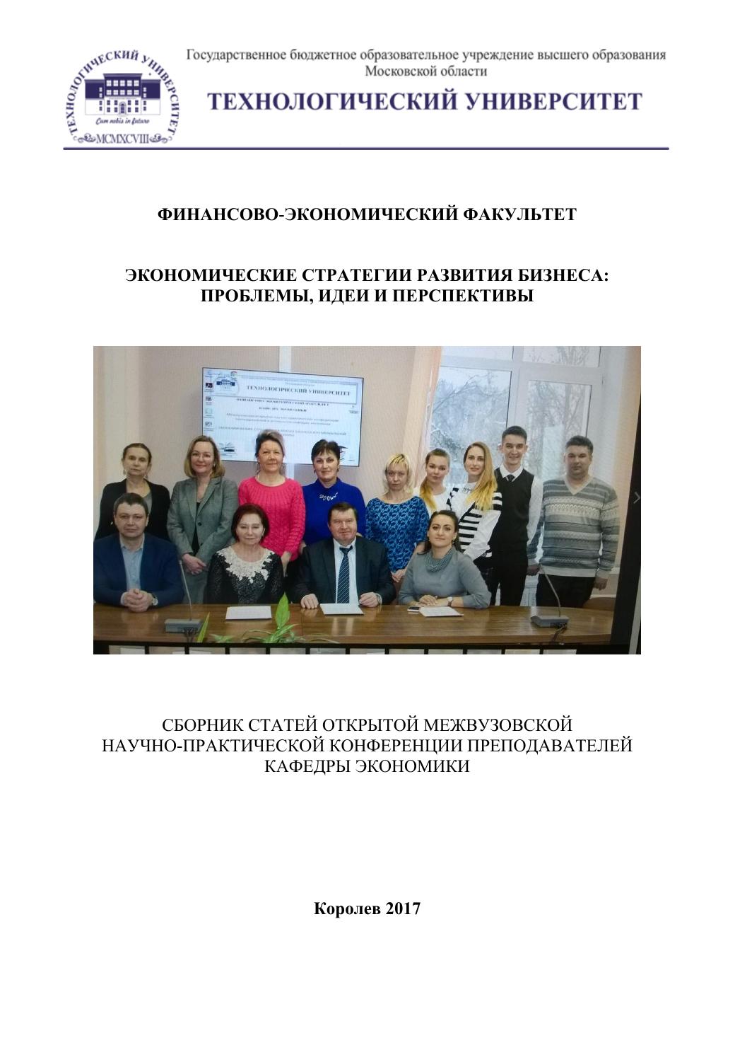 Сборник статей включает научные труды преподавателей, аспирантов, магистрантов кафедры экономики и других вузов и практических специалистов-участников открытой межвузовской научно-практической конференции, которая была проведена 19 января 2017 года в рамках МГОТУ. Проведение таких конференций стало хорошей традицией кафедры экономики. Регулярный характер конференции позволяет отслеживать появление новых теоретических разработок и ход реализации сформулированных предложений, а также выявлять общие тенденции в сфере развития бизнеса. Издание предназначено для студентов, аспирантов, преподавателей и широкому кругу читателей. Авторы сборника выражают глубокую благодарность магистрантке 1 курса Симоновой М.С. за помощь в подготовке сборника к публикации.