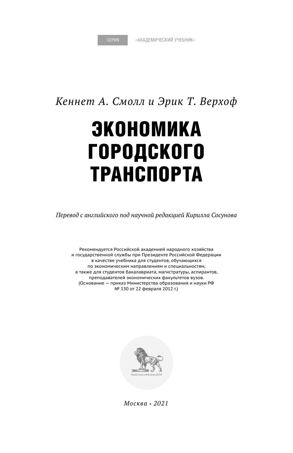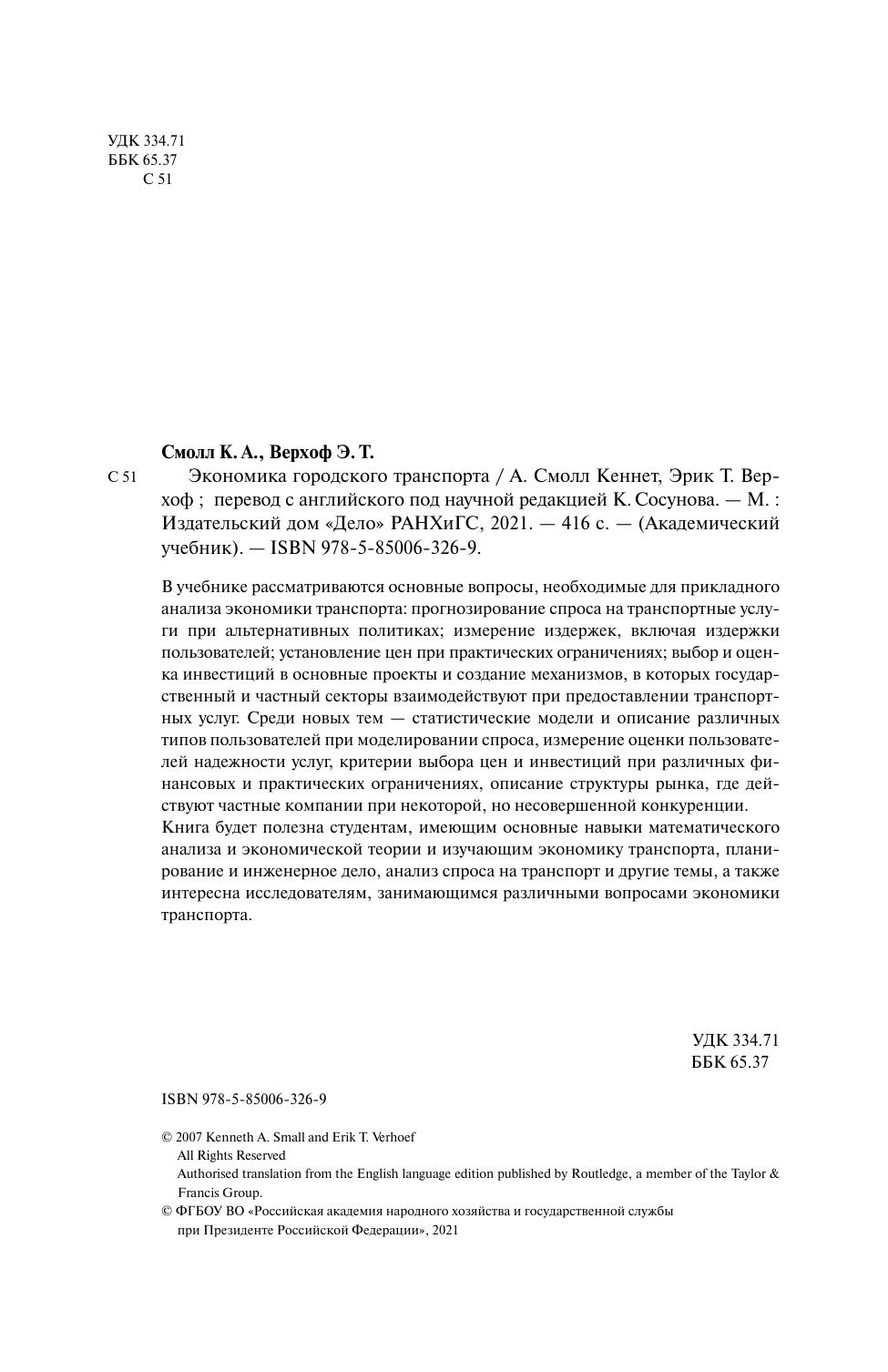 В учебнике рассматриваются основные вопросы, необходимые для прикладного анализа экономики транспорта: прогнозирование спроса на транспортные услуги при альтернативных политиках; измерение издержек, включая издержки пользователей; установление цен при практических ограничениях; выбор и оценка инвестиций в основные проекты и создание механизмов, в которых государственный и частный секторы взаимодействуют при предоставлении транспортных услуг. Среди новых тем — статистические модели и описание различных типов пользователей при моделировании спроса, измерение оценки пользователей надежности услуг, критерии выбора цен и инвестиций при различных финансовых и практических ограничениях, описание структуры рынка, где действуют частные компании при некоторой, но несовершенной конку ренции. Книга будет полезна студентам, имеющим основные навыки математического анализа и экономической теории и изучающим экономику транспорта, планирование и инженерное дело, анализ спроса на транспорт и другие темы, а также интересна исследователям, занимающимся различными вопросами экономики транспорта.