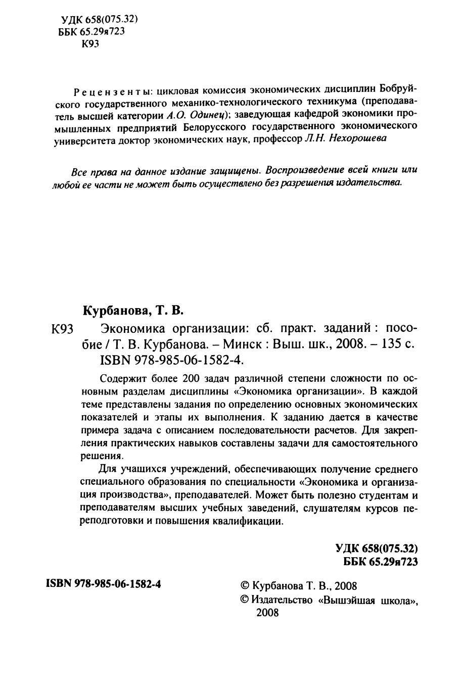 Содержит более 200 задач различной степени сложности по основным разделам дисциплины "Экономика организации". В каждой теме представлены задания по определению основных экономических показателей и этапы их выполнения. К заданию дается в качестве примера задача с описанием последовательности расчетов. Для закрепления практических навыков составлены задачи для самостоятельного решения. Для учащихся ССУЗов по специальности "Экономика и организация производства", преподавателей. Может быть полезно студентам и преподавателям вузов, слушателям курсов переподготовки и повышения квалификации.