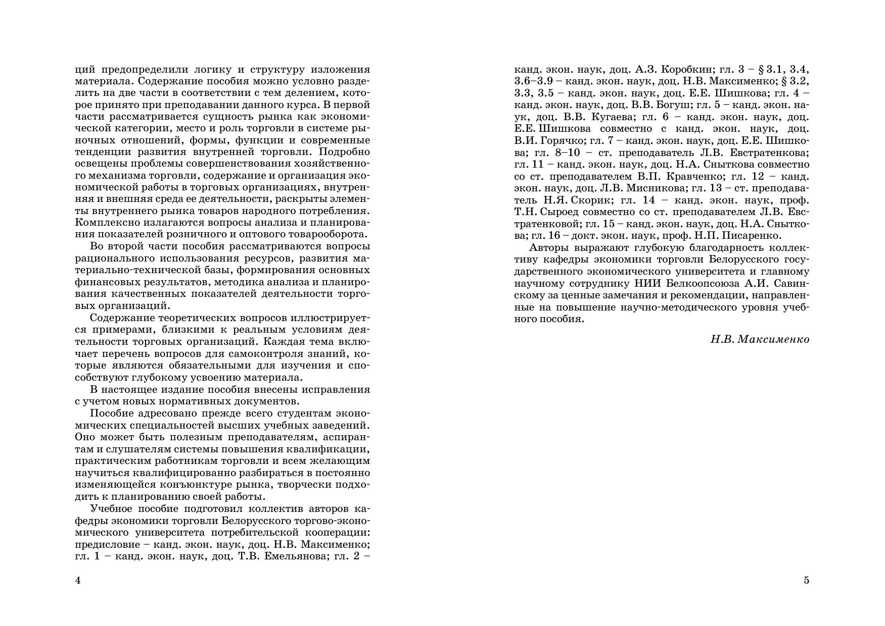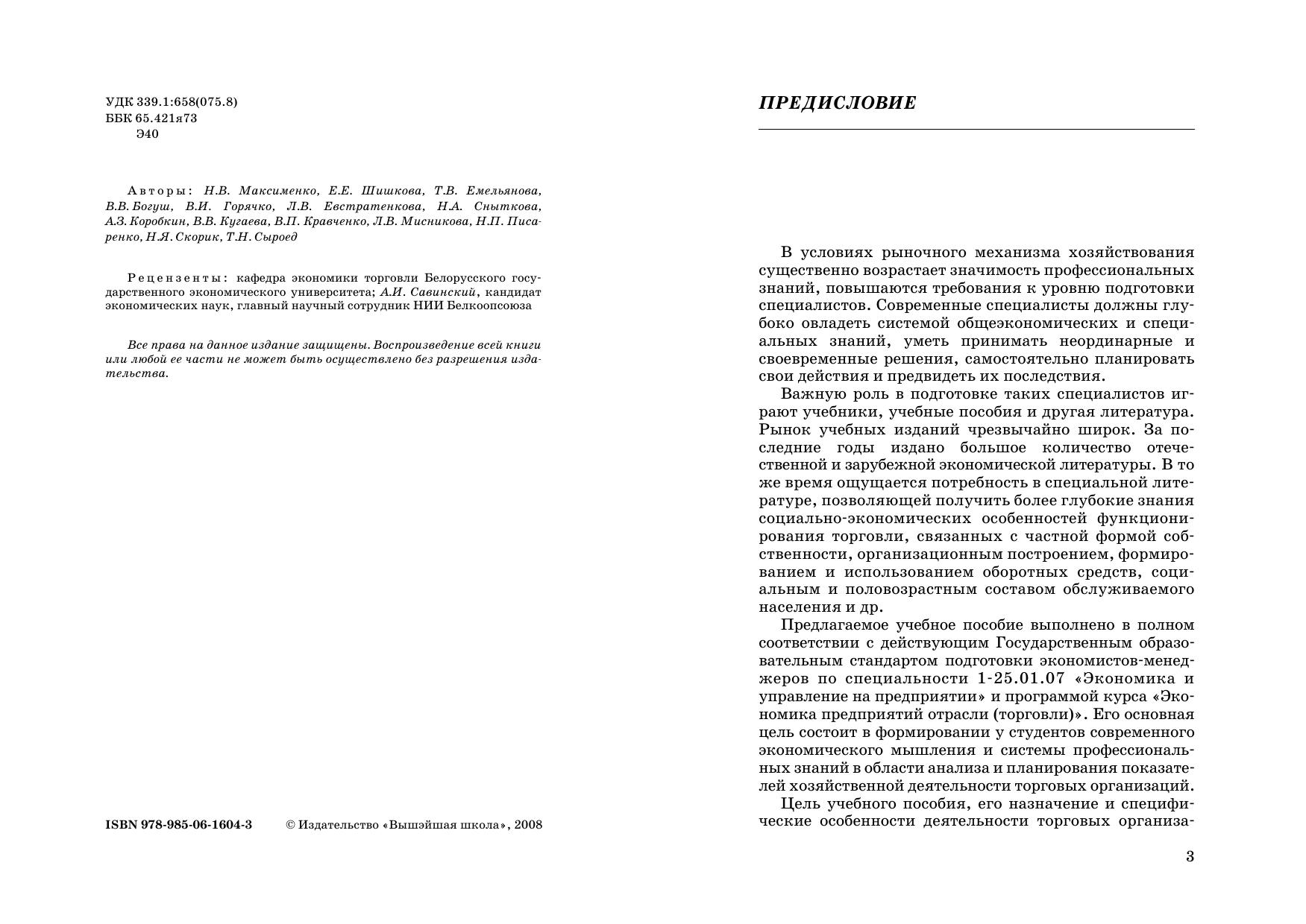 Рассматриваются вопросы экономики торговых предприятий (организаций) всех форм собственности, показана специфика кооперативной торговли. Наряду с теоретическим материалом на практических примерах излагаются методики анализа и планирования показателей деятельности торговли в условиях рыночной конкуренции. Внесены изменения с учетом новых нормативных документов. Для студентов экономических специальностей вузов. Может быть полезно преподавателям, аспирантам, слушателям системы повышения квалификации, практическим работникам.