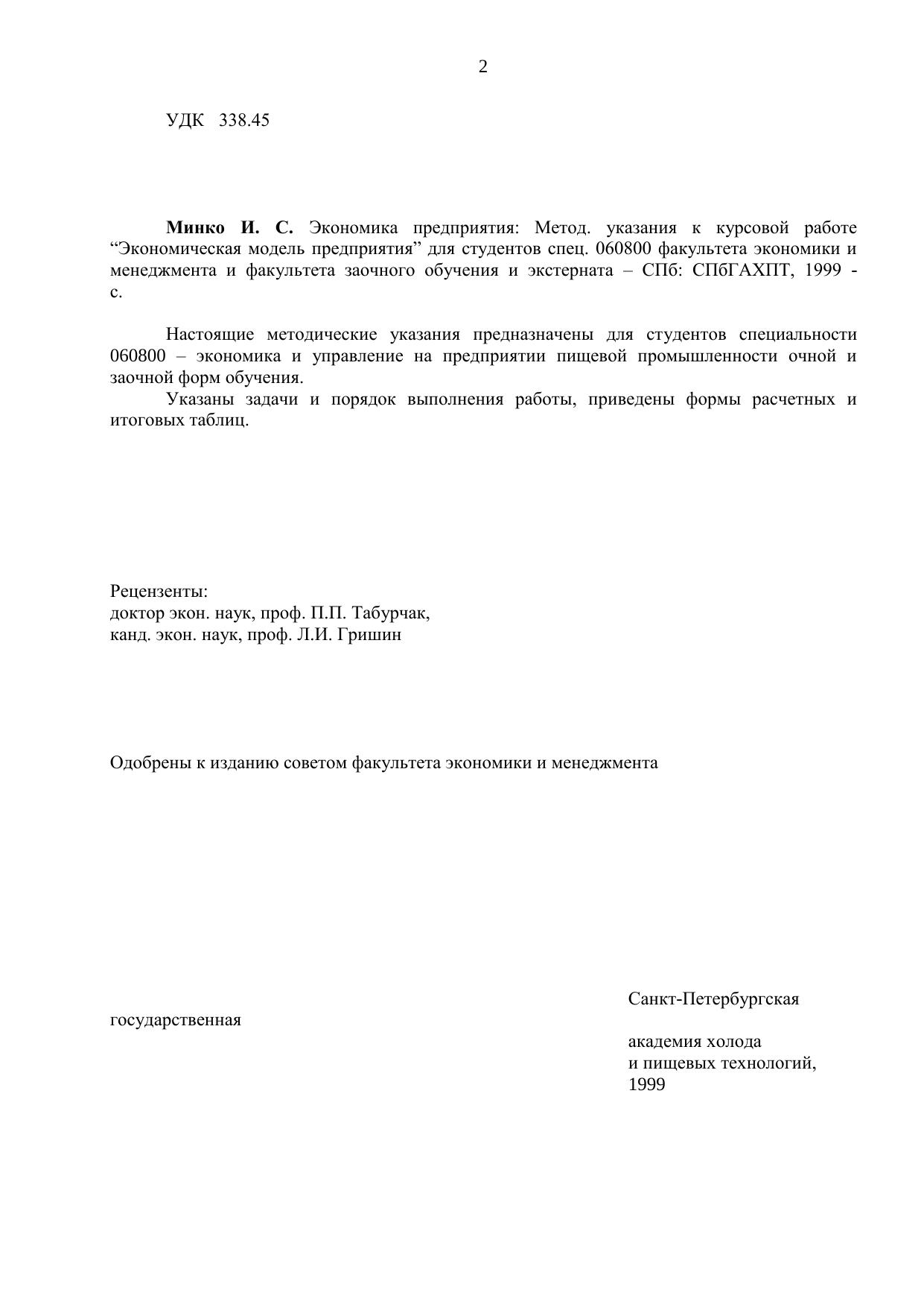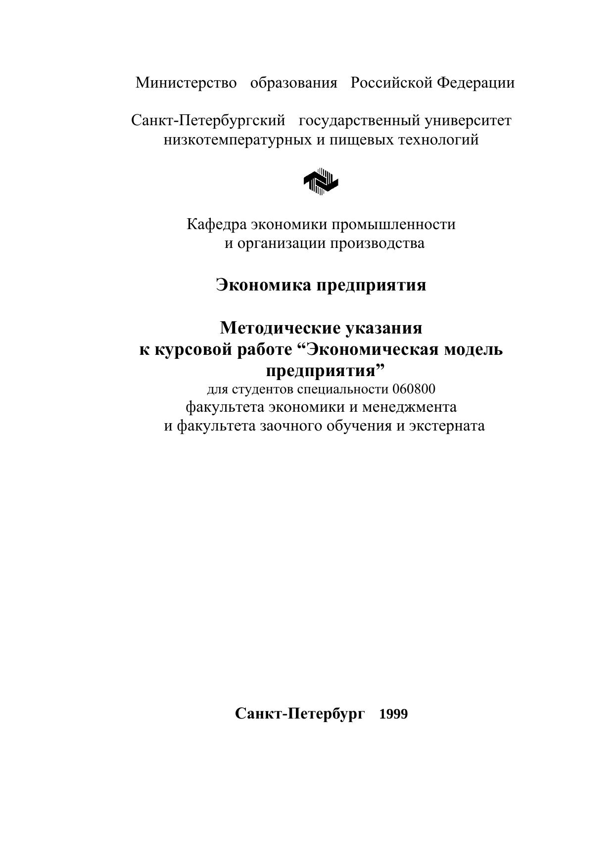 Экономика предприятия: Метод. указания к курсовой работе "Экономическая модель предприятия" для студентов спец. 060800 факультета экономики и менеджмента и факультета заочного обучения и экстерната