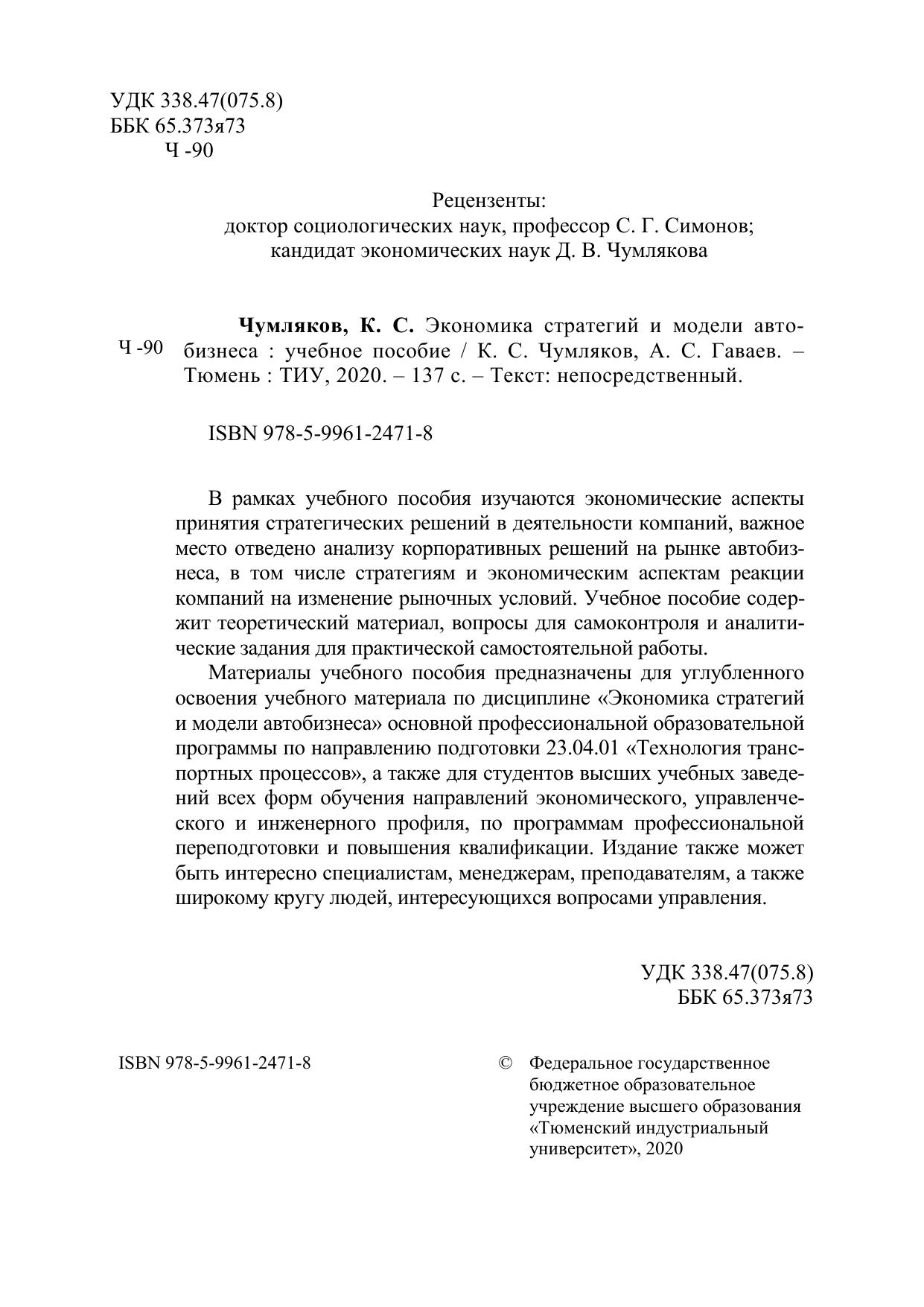 В рамках учебного пособия изучаются экономические аспекты принятия стратегических решений в деятельности компаний, важное место отведено анализу корпоративных решений на рынке автобизнеса, в том числе стратегиям и экономическим аспектам реакции компаний на изменение рыночных условий. Учебное пособие содержит теоретический материал, вопросы для самоконтроля и аналитические задания для практической самостоятельной работы. Материалы учебного пособия предназначены для углубленного освоения учебного материала по дисциплине «Экономика стратегий и модели автобизнеса» основной профессиональной образовательной программы по направлению подготовки 23.04.01 «Технология транспортных процессов», а также для студентов высших учебных заведений всех форм обучения направлений экономического, управленческого и инженерного профиля, по программам профессиональной переподготовки и повышения квалификации. Издание также может быть интересно специалистам, менеджерам, преподавателям, а также широкому кругу людей, интересующихся вопросами управления