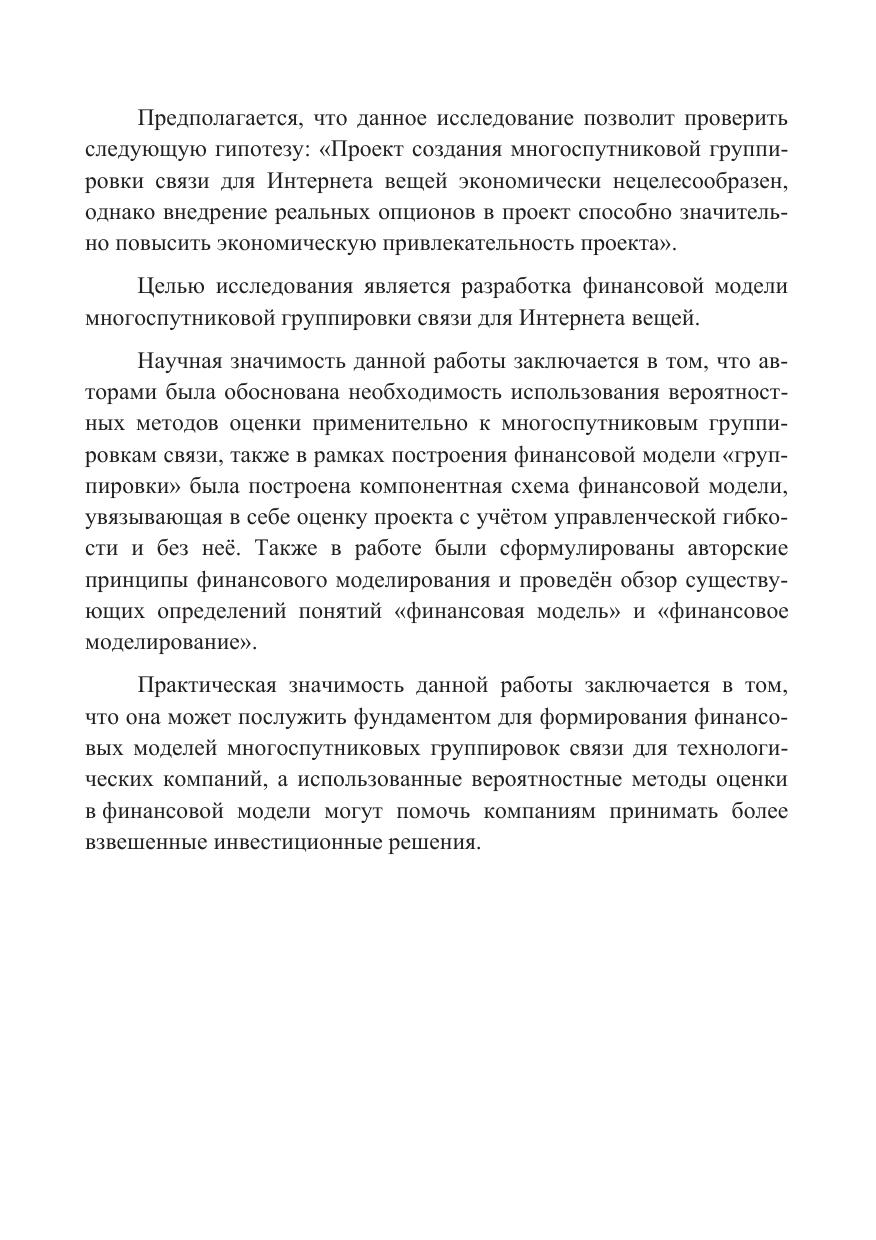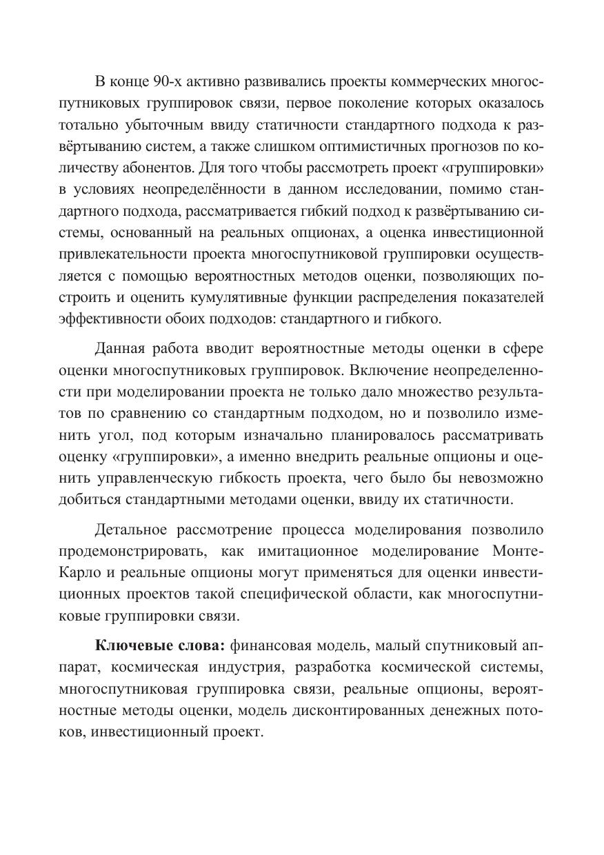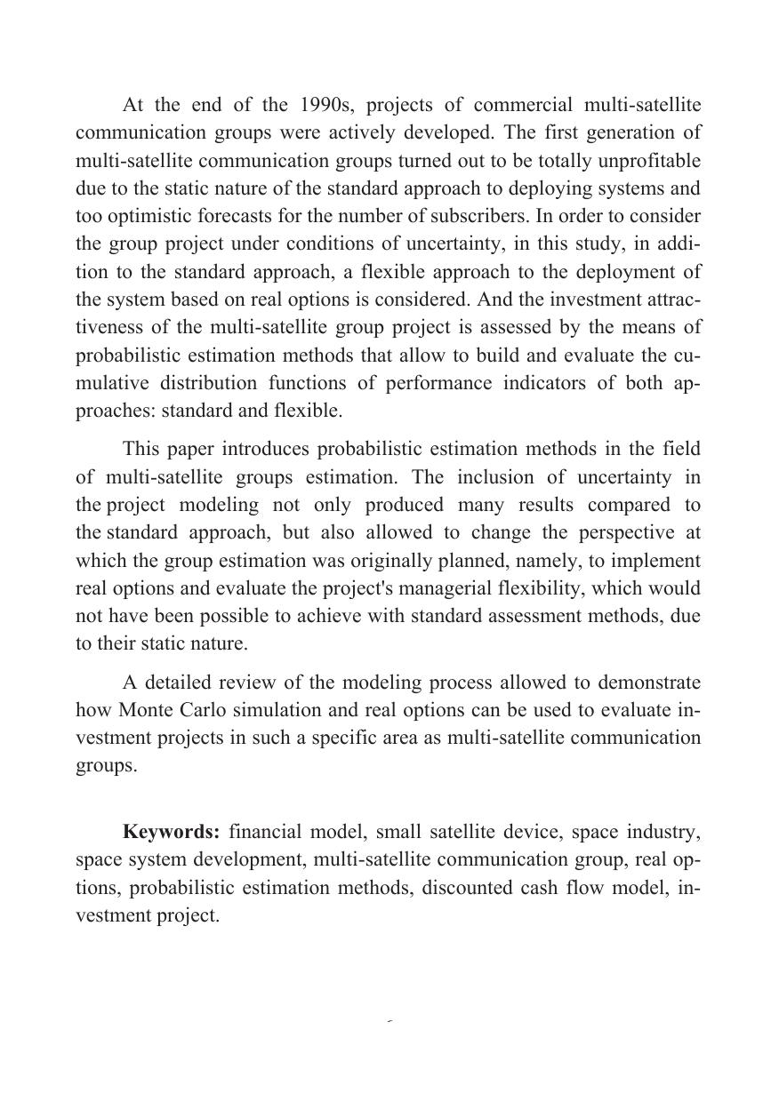 В конце 90-х активно развивались проекты коммерческих многоспутниковых группировок связи, первое поколение которых оказалось тотально убыточным ввиду статичности стандартного подхода к развёртыванию систем, а также слишком оптимистичных прогнозов по количеству абонентов. Для того чтобы рассмотреть проект «группировки» в условиях неопределённости в данном исследовании, по-мимо стандартного подхода, рассматривается гибкий подход к развёртыванию системы, основанный на реальных опционах, а оценка инвестиционной привлекательности проекта многоспутниковой группировки осуществляется с помощью вероятностных методов оценки, позволяющих построить и оценить кумулятивные функции распределения показателей эффективности обоих подходов: стандартного и гибкого. Данная работа вводит вероятностные методы оценки в сфере оценки многоспутниковых группировок. Включение неопределенно-сти при моделировании проекта не только дало множество результатов по сравнению со стандартным подходом, но и позволило изменить угол, под которым изначально планировалось рассматривать оценку «группировки», а именно внедрить реальные опционы и оценить управленческую гибкость проекта, чего было бы невозможно добиться стандартными методами оценки, ввиду их статичности. Детальное рассмотрение процесса моделирования позволило продемонстрировать, как имитационное моделирование Монте-Карло и реальные опционы могут применяться для оценки инвестиционных проектов такой специфической области, как многоспутниковые группировки связи.