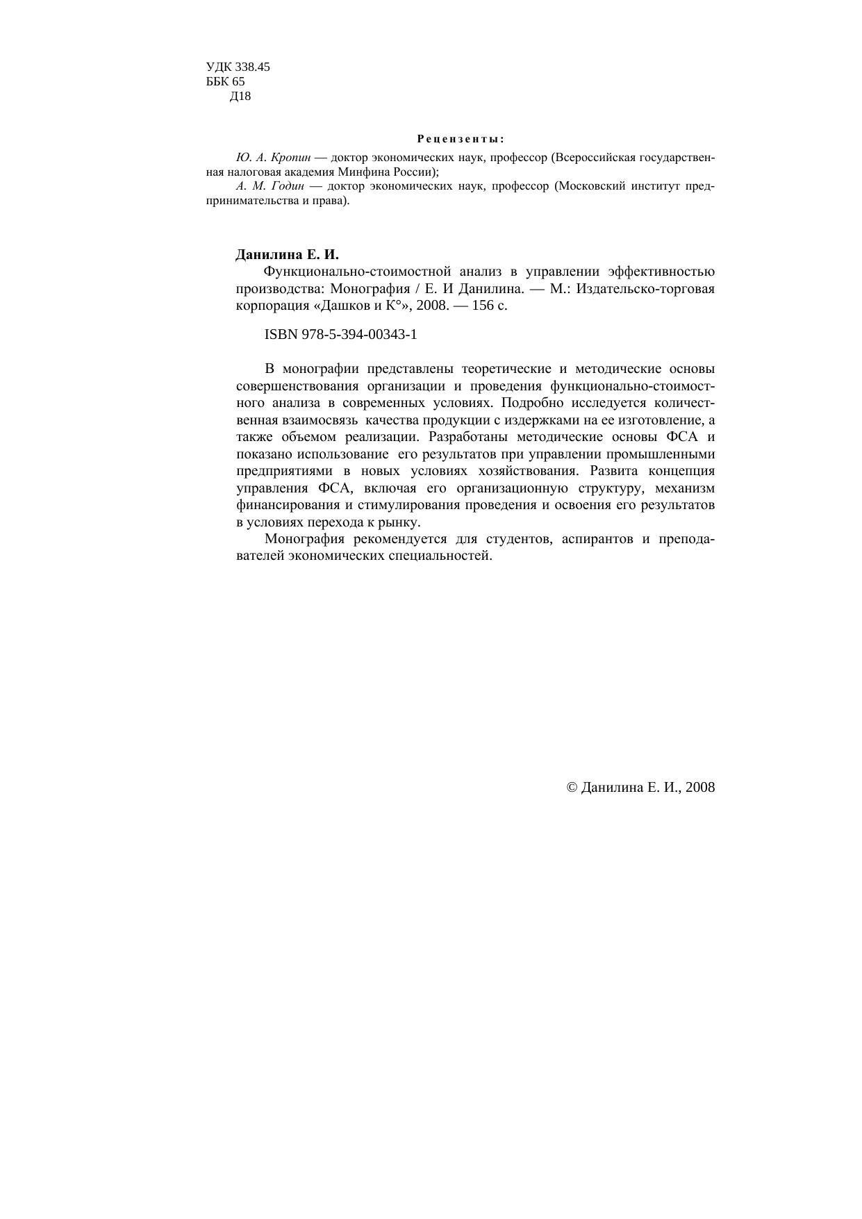 В монографии представлены теоретические и методические основы совершенствования организации и проведения функционально-стоимостного анализа в современных условиях. Подробно исследуется количественная взаимосвязь качества продукции с издержками на ее изготовление, а также объемом реализации. Разработаны методические основы ФСА и показано использование его результатов при управлении промышленными предприятиями в новых условиях хозяйствования. Развита концепция управления ФСА, включая его организационную структуру, механизм финансирования и стимулирования проведения и освоения его результатов в условиях перехода к рынку. Монография рекомендуется для студентов, аспирантов и преподавателей экономических специальностей.