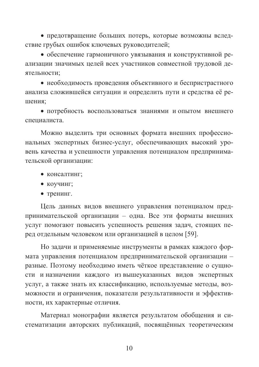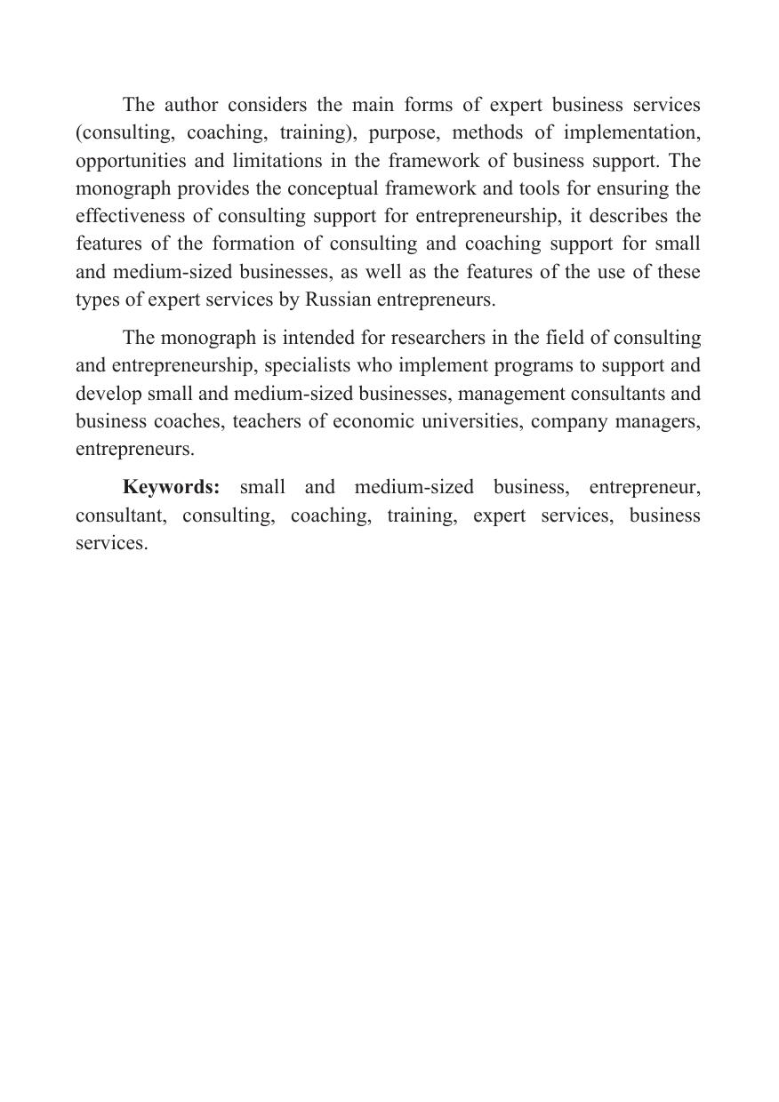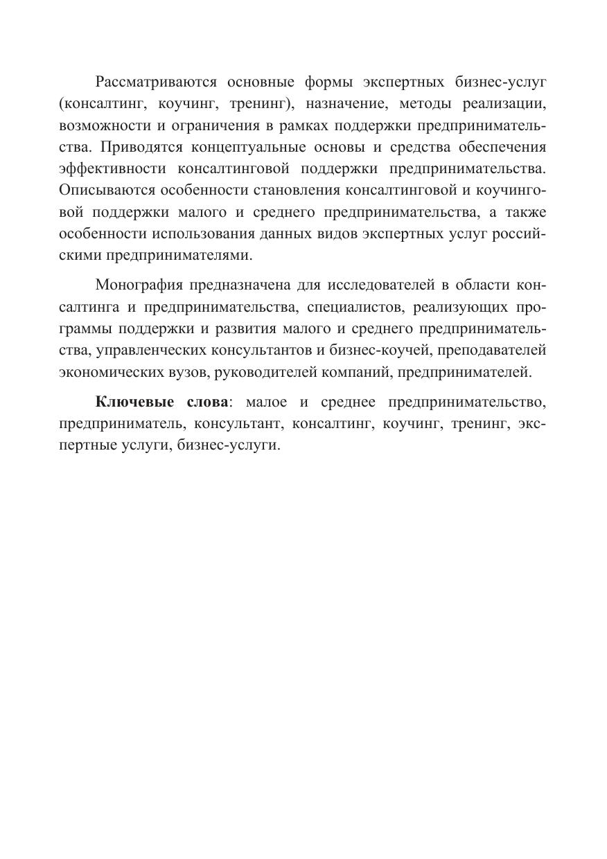 Рассматриваются основные формы экспертных бизнес-услуг (консал-тинг, коучинг, тренинг), назначение, методы реализации, возможности и ограничения в рамках поддержки предпринимательства. Приводятся концептуаль-ные основы и средства обеспечения эффективности консалтинговой поддержки предпринимательства. Описываются особенности становления консалтинговой и коучинговой поддержки малого и среднего предпринимательства, а также особенности использования данных видов экспертных услуг российскими предпринимателями.