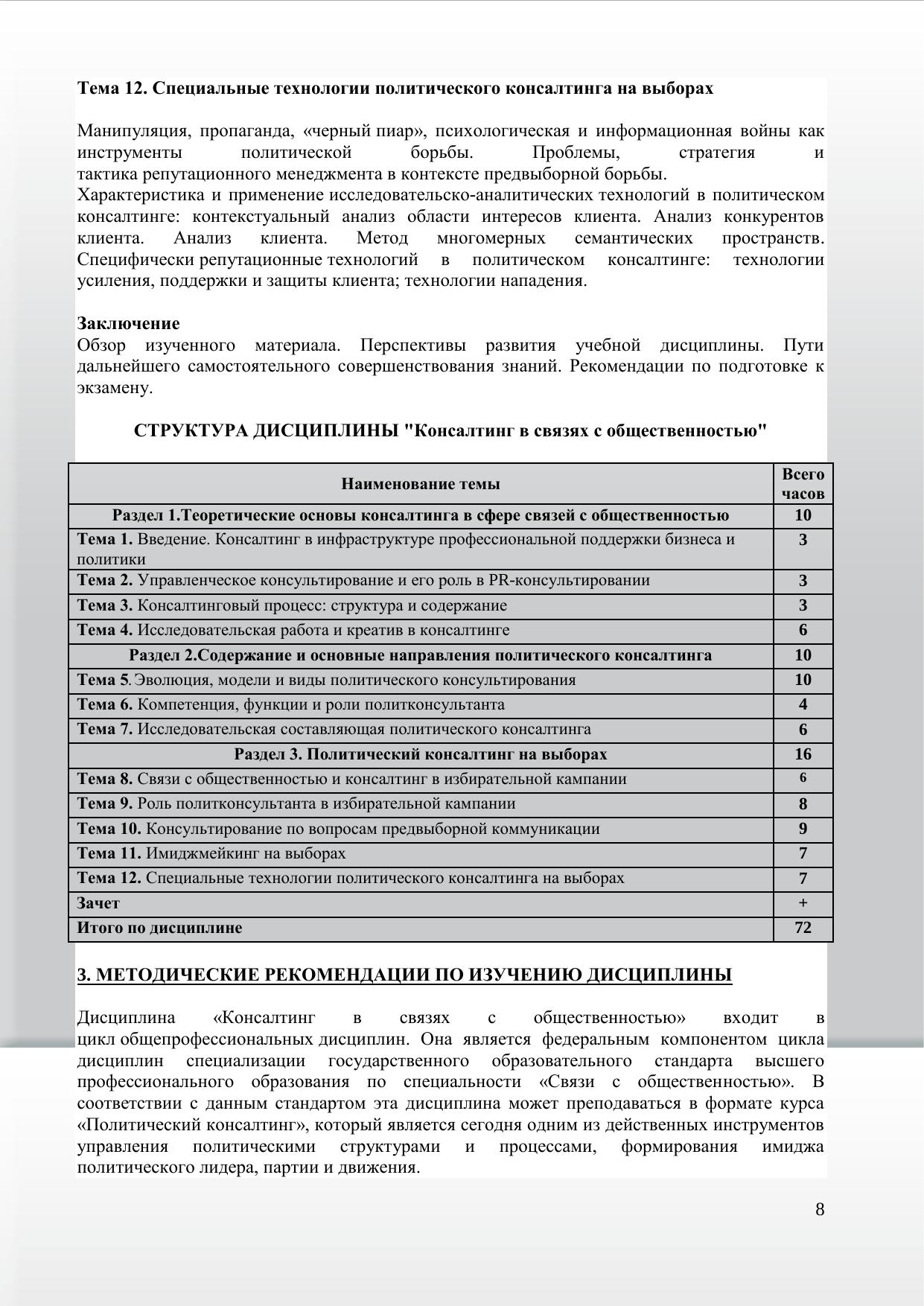В учебном пособии дано всестороннее представление о консалтинге в сфере связей с общественностью. В нем изложены теоретико-методологические, методические, организационные и коммуникационные аспекты консультирования раскрыты содержание, структура и особенности управленческого и политического консалтинга. Особое внимание уделено консультированию по вопросам организации и проведения избирательных кампаний в России, раскрытию функций и роли политконсультантов, исследовательской составляющей политического консалтинга, вопросам имиджмейкинга на выборах. Теоретические положения иллюстрируются схемами, примерами и материалами из практики консультирования, словарь специальных терминов помогает лучше усвоить учебный материал. Структура и содержание учебного пособия отвечают требованиям государственного стандарта высшего профессионального образования по специальности 350400 – «Связи с общественностью». Пособие предназначено для студентов, обучающихся по специальности «Связи с общественностью», а также преподавателей, ведущих курсы по данной специальности. Электронное учебное пособие для дистанционного обучения