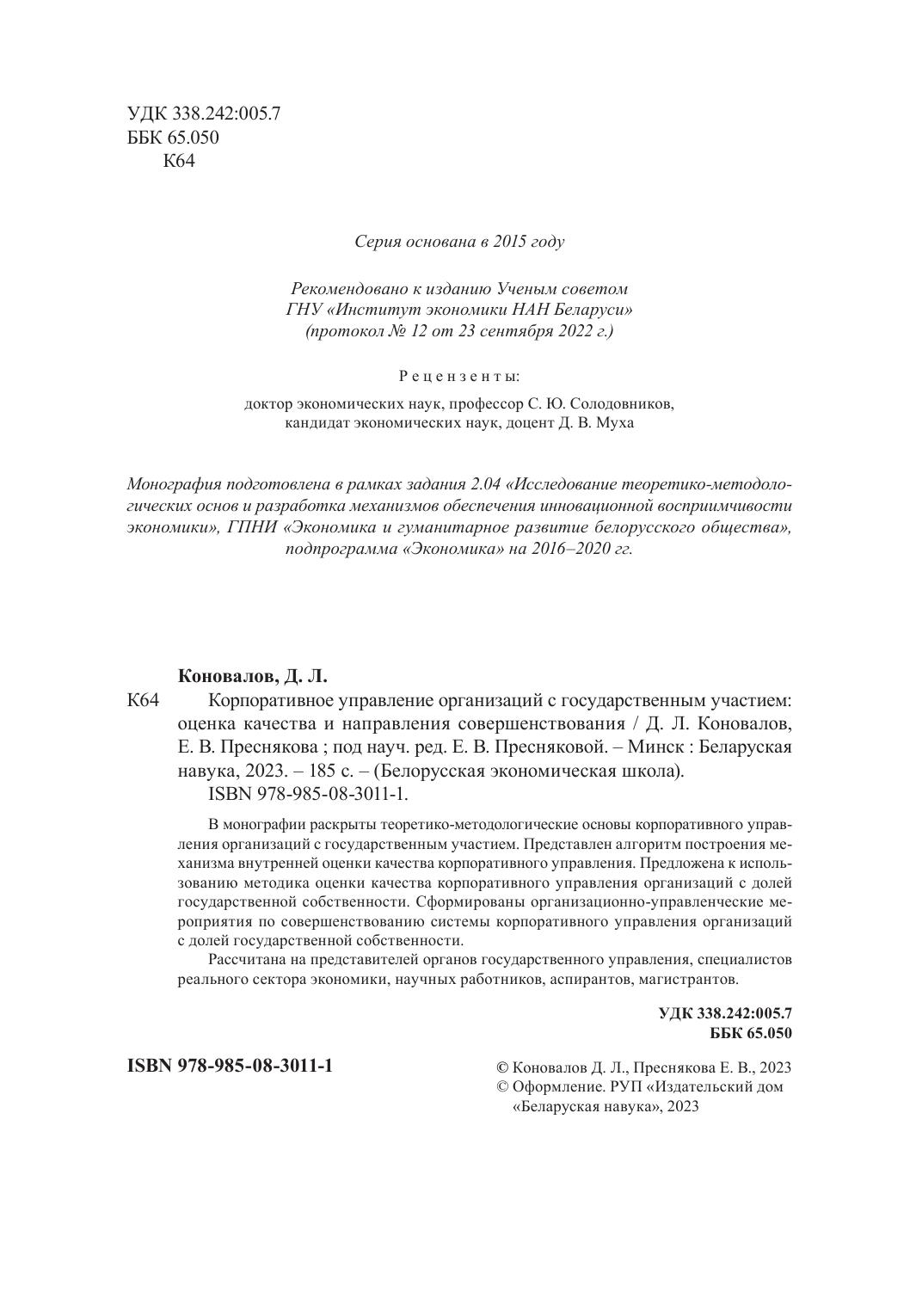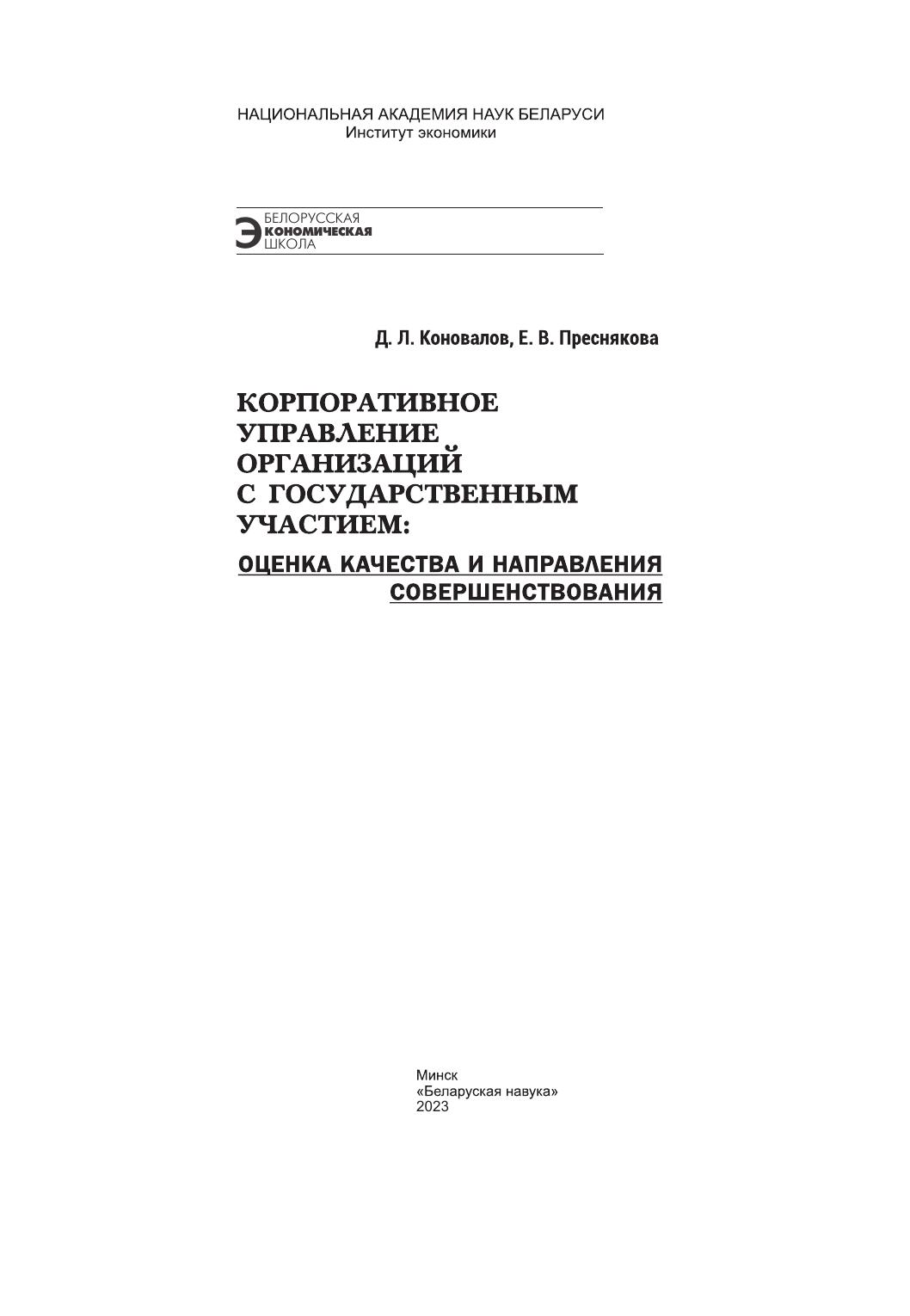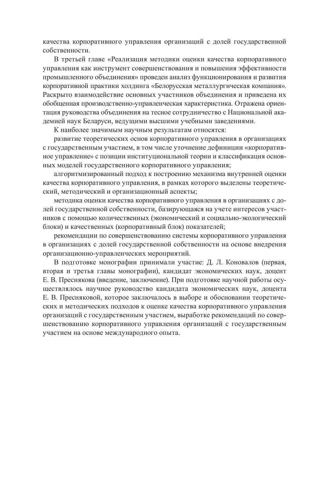 В монографии раскрыты теоретико-методологические основы корпоративного управления организаций с государственным участием. Представлен алгоритм построения механизма внутренней оценки качества корпоративного управления. Предложена к использованию методика оценки качества корпоративного управления организаций с долей государственной собственности. Сформированы организационно-управленческие мероприятия по совершенствованию системы корпоративного управления организаций с долей государственной собственности.