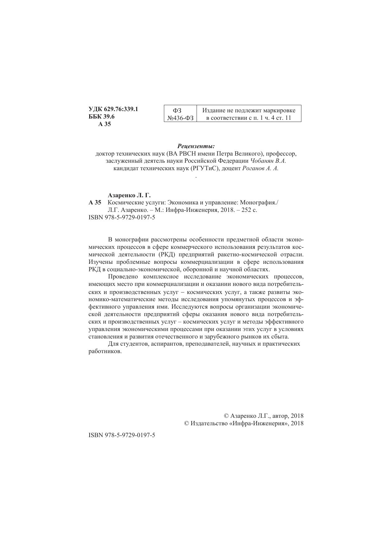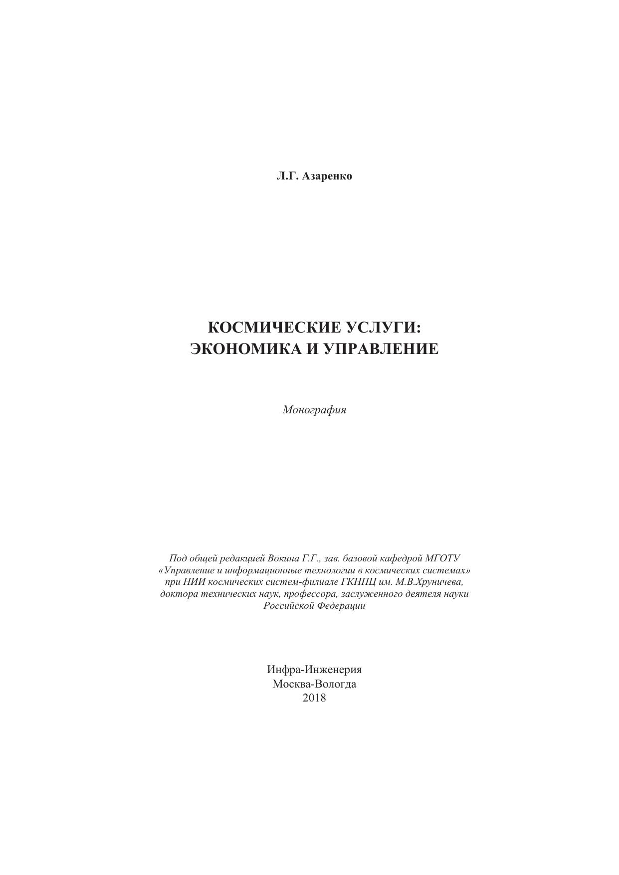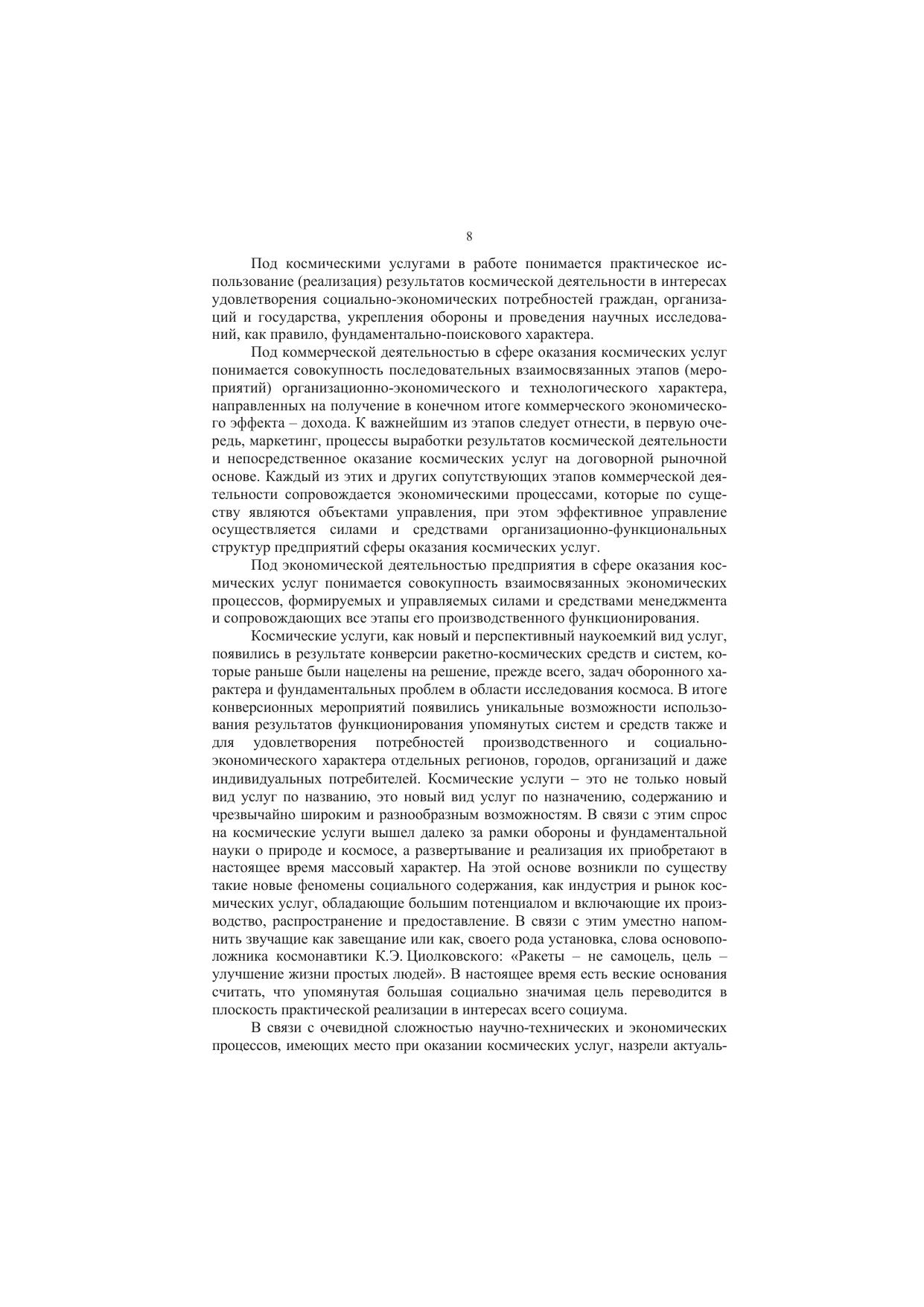 Проведено комплексное исследование экономических процессов, имеющих место при коммерциализации и оказании нового вида потребительских и производственных услуг - космических услуг, а также развиты экономико-математические методы исследования упомянутых процессов и эффективного управления ими. Исследуются вопросы организации экономической деятельности предприятий сферы оказания нового вида потребительских и производственных услуг – космических услуг и методы эффективного управления экономическими процессами при оказании этих услуг в условиях становления и развития отечественного и зарубежного рынков их сбыта.