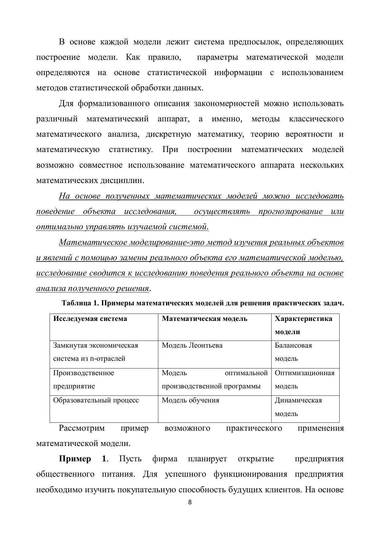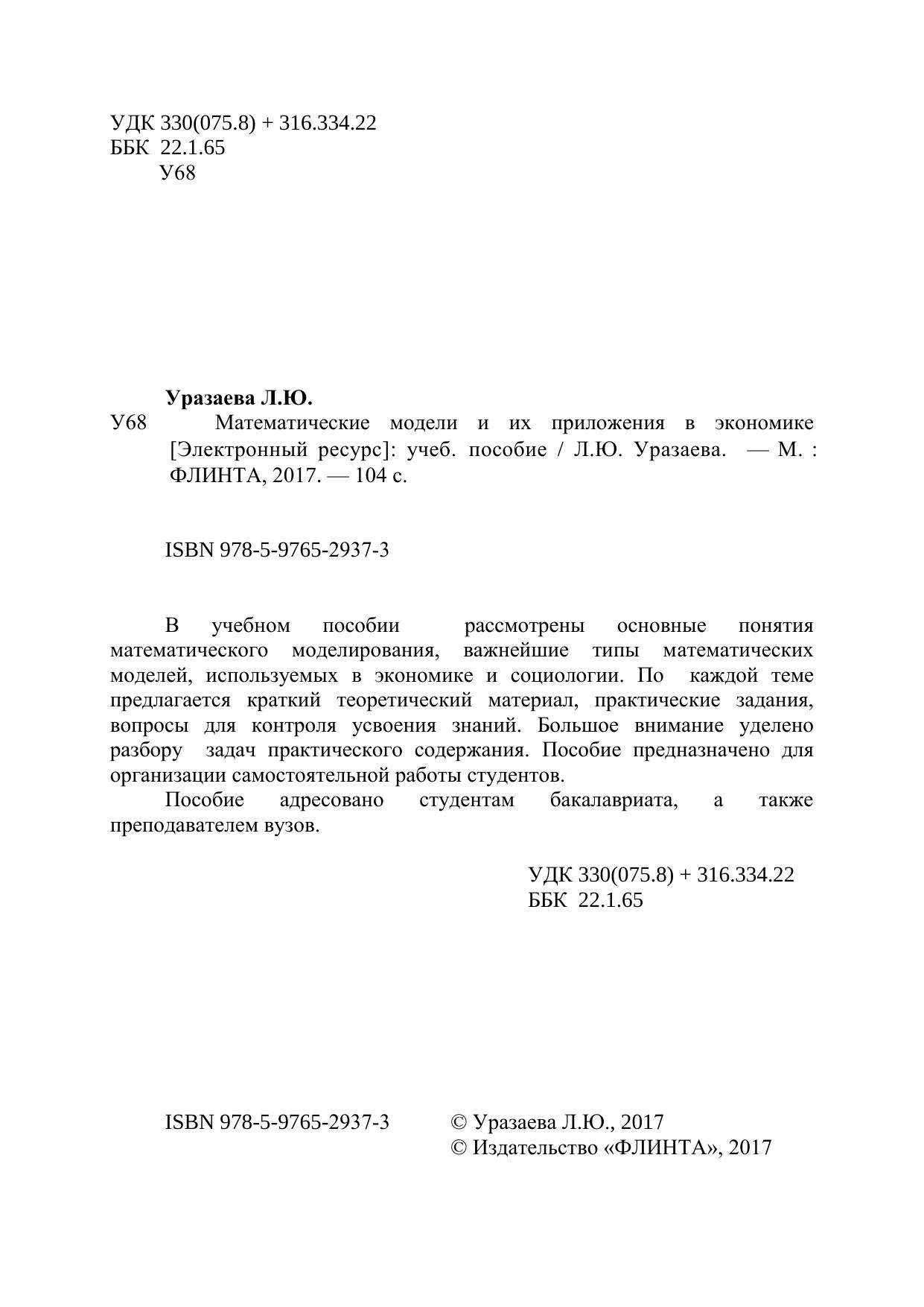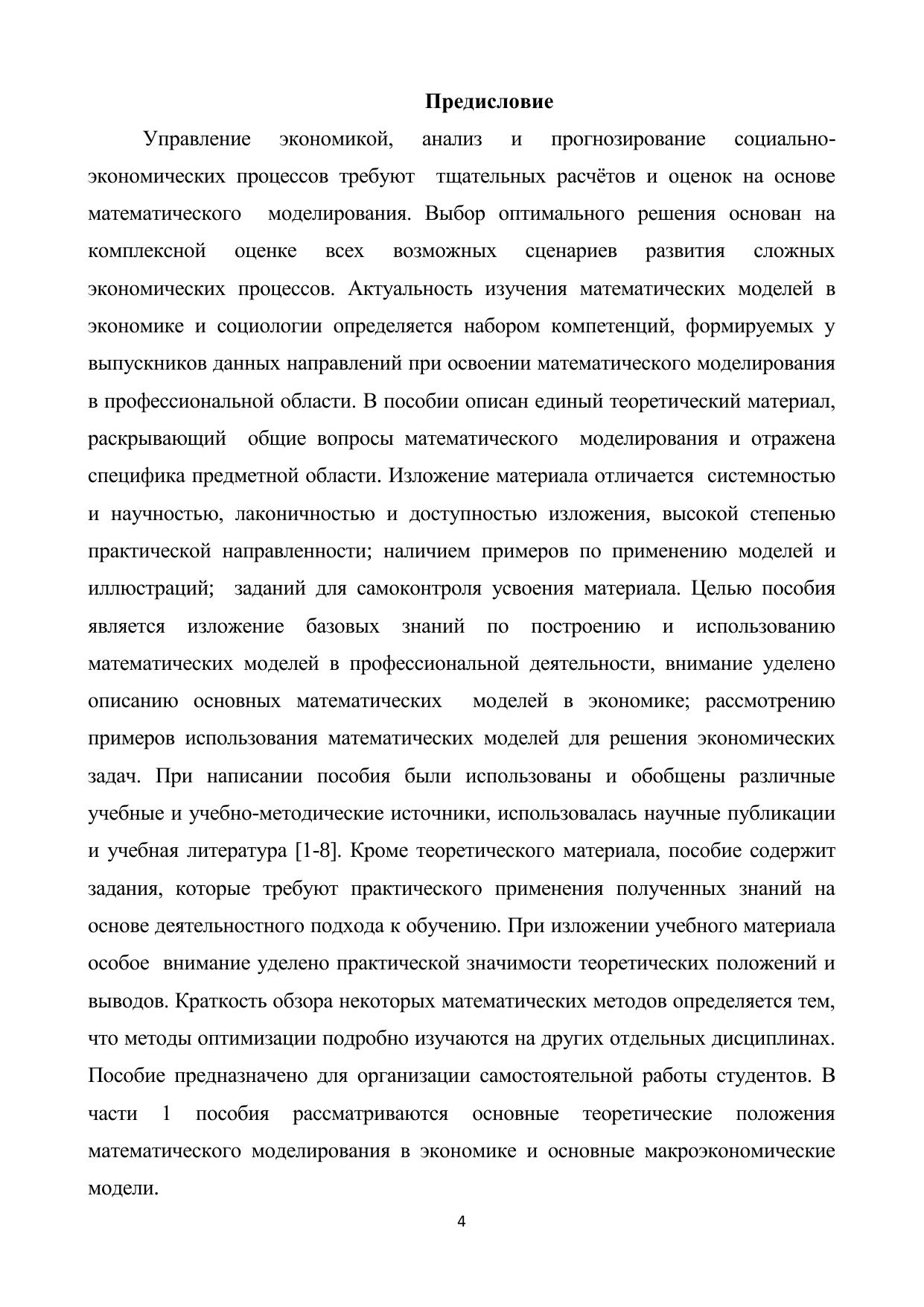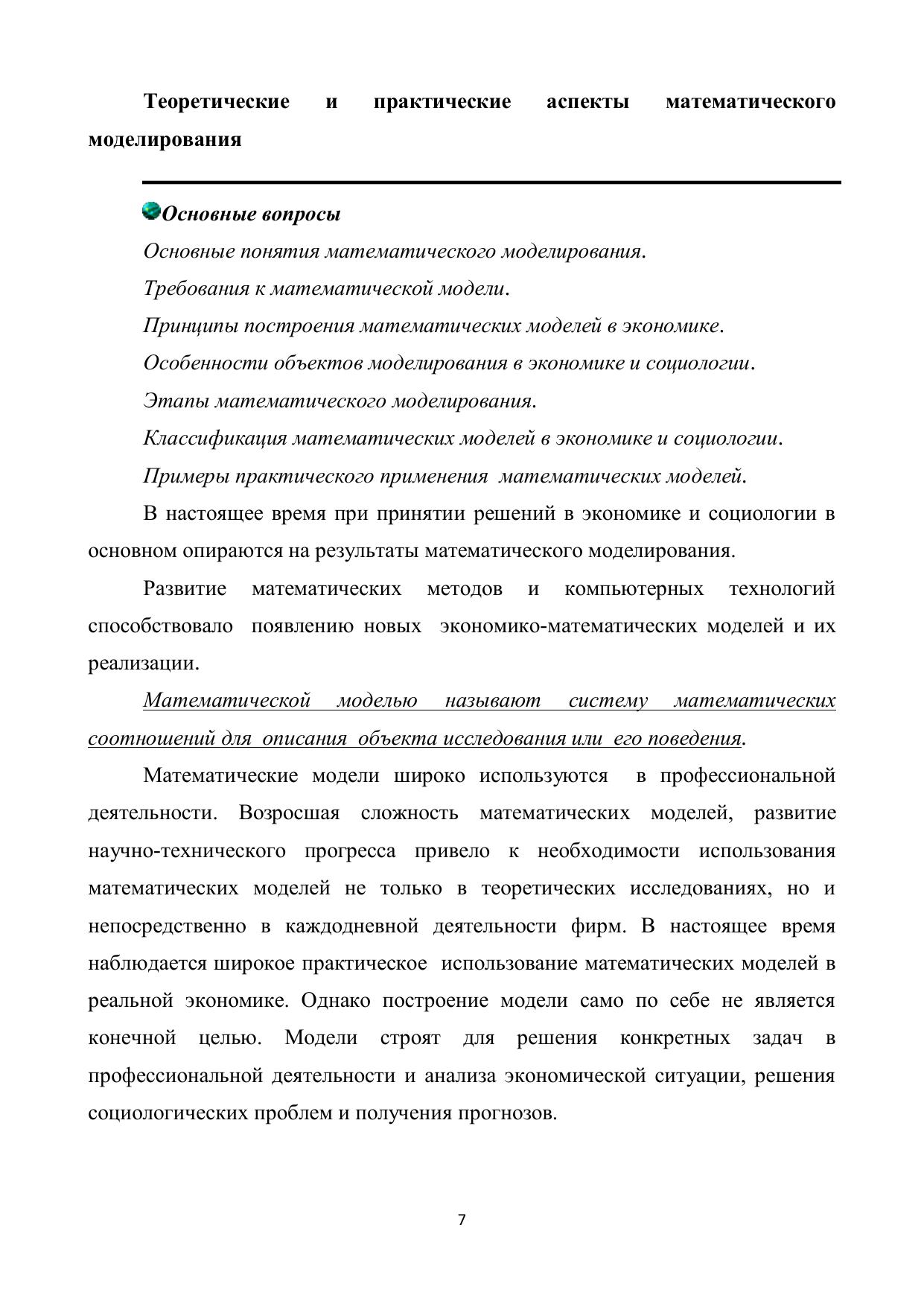 В учебном пособии рассмотрены основные понятия математического моделирования, важнейшие типы математических моделей, используемых в экономике и социологии. По каждой теме предлагается краткий теоретический материал, практические задания, вопросы для контроля усвоения знаний. Большое внимание уделено разбору задач практического содержания. Пособие предназначено для организации самостоятельной работы студентов. Пособие адресовано студентам бакалавриата, а также преподавателем вузов.