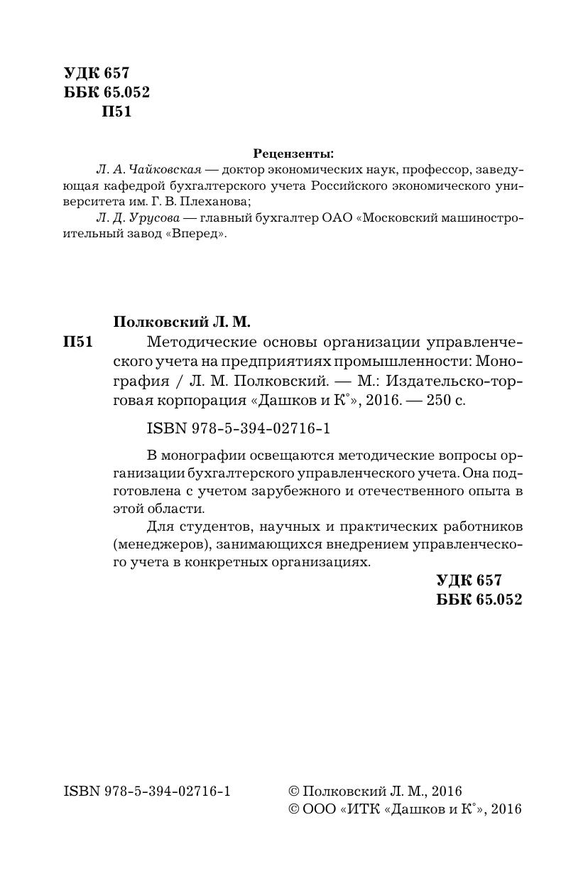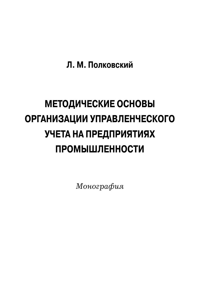 Методические основы организации управленческого учета на предприятиях промышленности: монография