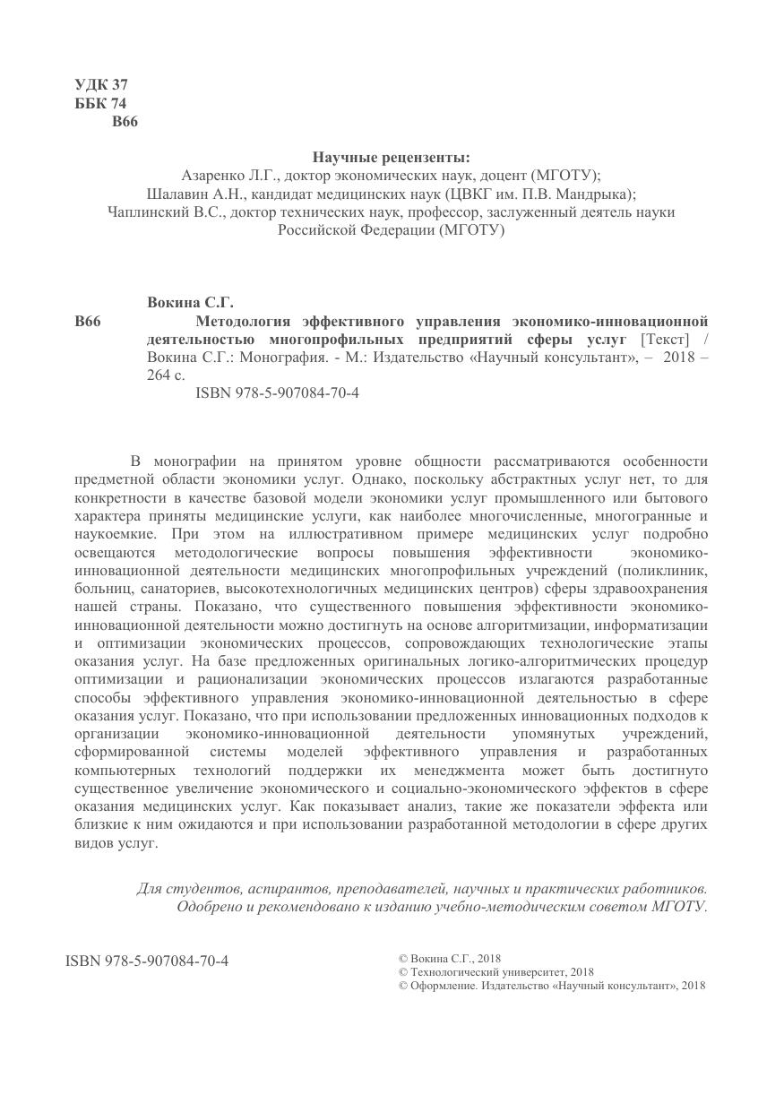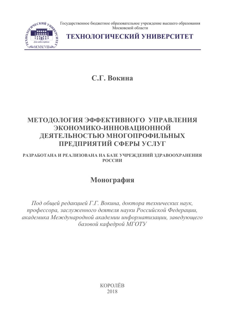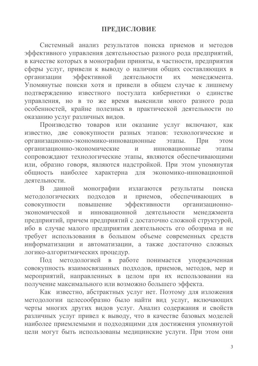 В монографии на принятом уровне общности рассматриваются особенности предметной области экономики услуг. Однако, поскольку абстрактных услуг нет, то для конкретности в качестве базовой модели экономики услуг промышленного или бытового характера приняты медицинские услуги, как наиболее многочисленные, многогранные и наукоемкие. При этом на иллюстративном примере медицинских услуг подробно освещаются методологические вопросы повышения эффективности экономико-инновационной деятельности медицинских многопрофильных учреждений (поликлиник, больниц, санаториев, высокотехнологичных медицинских центров) сферы здравоохранения нашей страны. Показано, что существенного повышения эффективности экономико-инновационной деятельности можно достигнуть на основе алгоритмизации, информатизации и оптимизации экономических процессов, сопровождающих технологические этапы оказания услуг. На базе предложенных оригинальных логико-алгоритмических процедур оптимизации и рационализации экономических процессов излагаются разработанные способы эффективного управления экономико-инновационной деятельностью в сфере оказания услуг. Показано, что при использовании предложенных инновационных подходов к организации экономико-инновационной деятельности упомянутых учреждений, сформированной системы моделей эффективного управления и разработанных компьютерных технологий поддержки их менеджмента может быть достигнуто существенное увеличение экономического и социально-экономического эффектов в сфере оказания медицинских услуг. Как показывает анализ, такие же показатели эффекта или близкие к ним ожидаются и при использовании разработанной методологии в сфере других видов услуг.