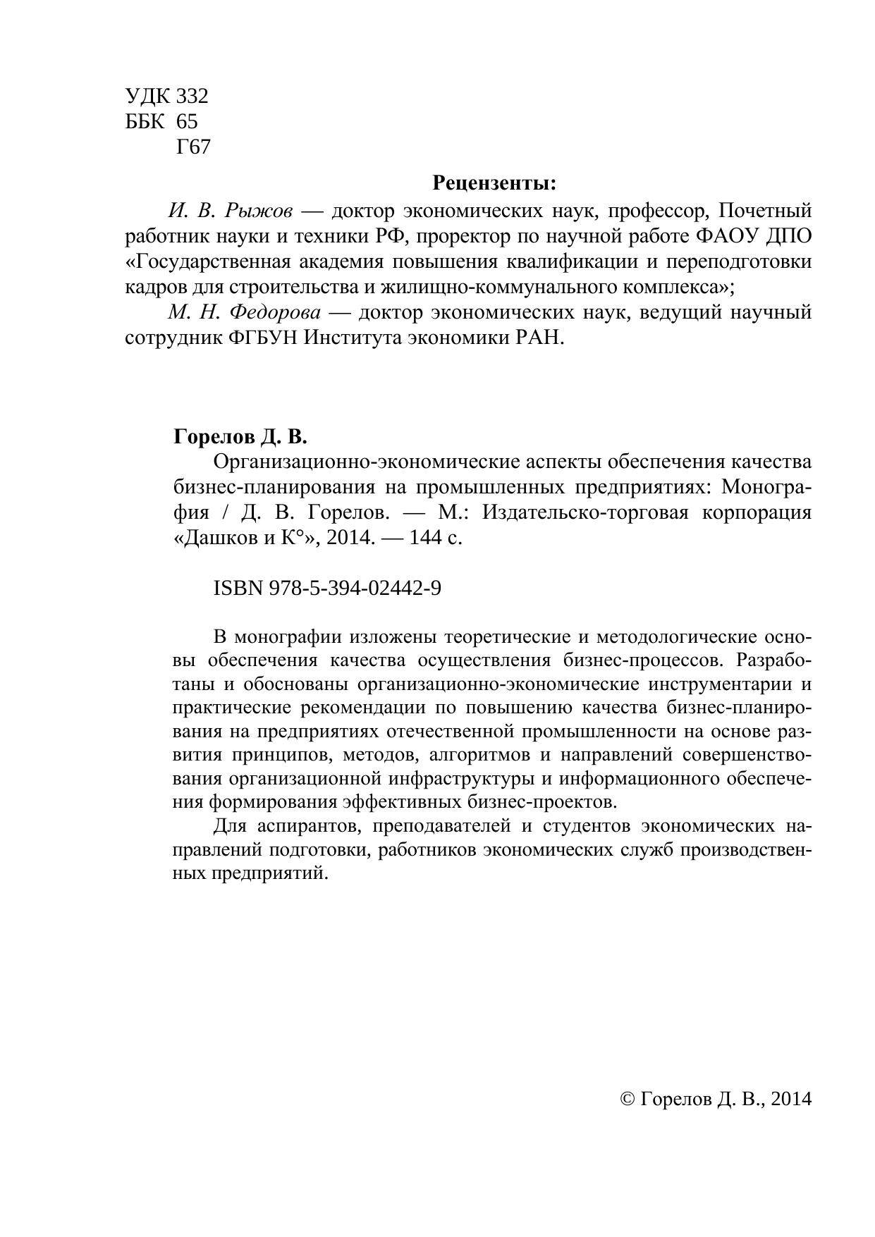 В монографии изложены теоретические и методологические основы обеспечения качества осуществления бизнес-процессов. Разработаны и обоснованы организационно-экономические инструментарии и практические рекомендации по повышению качества бизнес-планирования на предприятиях отечественной промышленности на основе развития принципов, методов, алгоритмов и направлений совершенствования организационной инфраструктуры и информационного обеспечения формирования эффективных бизнес-проектов. Для аспирантов, преподавателей и студентов экономических направлений подготовки, работников экономических служб производственных предприятий.