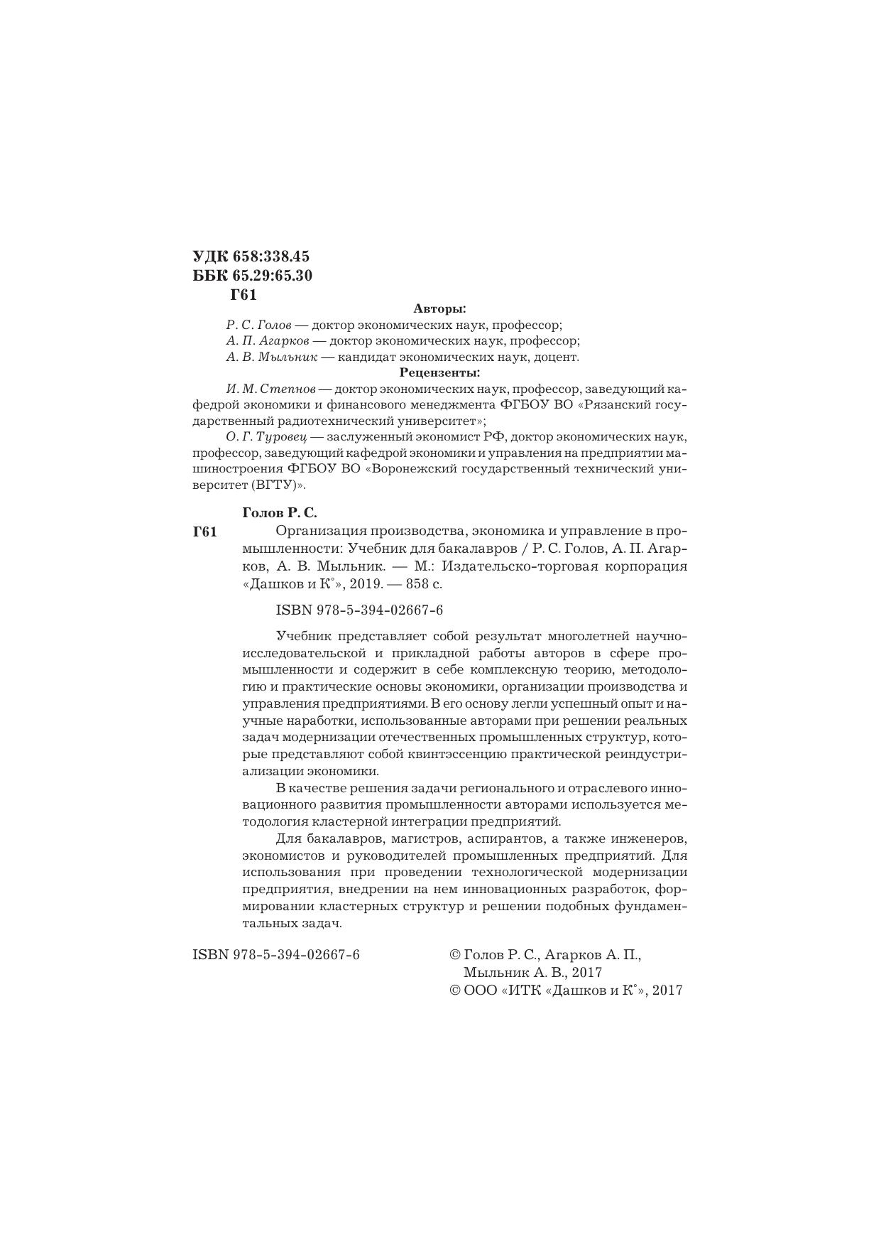Учебник представляет собой результат многолетней научно-исследовательской и прикладной работы авторов в сфере промышленности и содержит в себе комплексную теорию, методологию и практические основы экономики, организации производства и управления предприятиями. В его основу легли успешный опыт и научные наработки, использованные авторами при решении реальных задач модернизации отечественных промышленных структур, которые представляют собой квинтэссенцию практической реиндустриализации экономики. В качестве решения задачи регионального и отраслевого инновационного развития промышленности авторами используется методология кластерной интеграции предприятий. Для бакалавров, магистров, аспирантов, а также инженеров, экономистов и руководителей промышленных предприятий. Для использования при проведении технологической модернизации предприятия, внедрении на нем инновционных разработок, формировании кластерных структур и решении подобных фундаментальных задач.