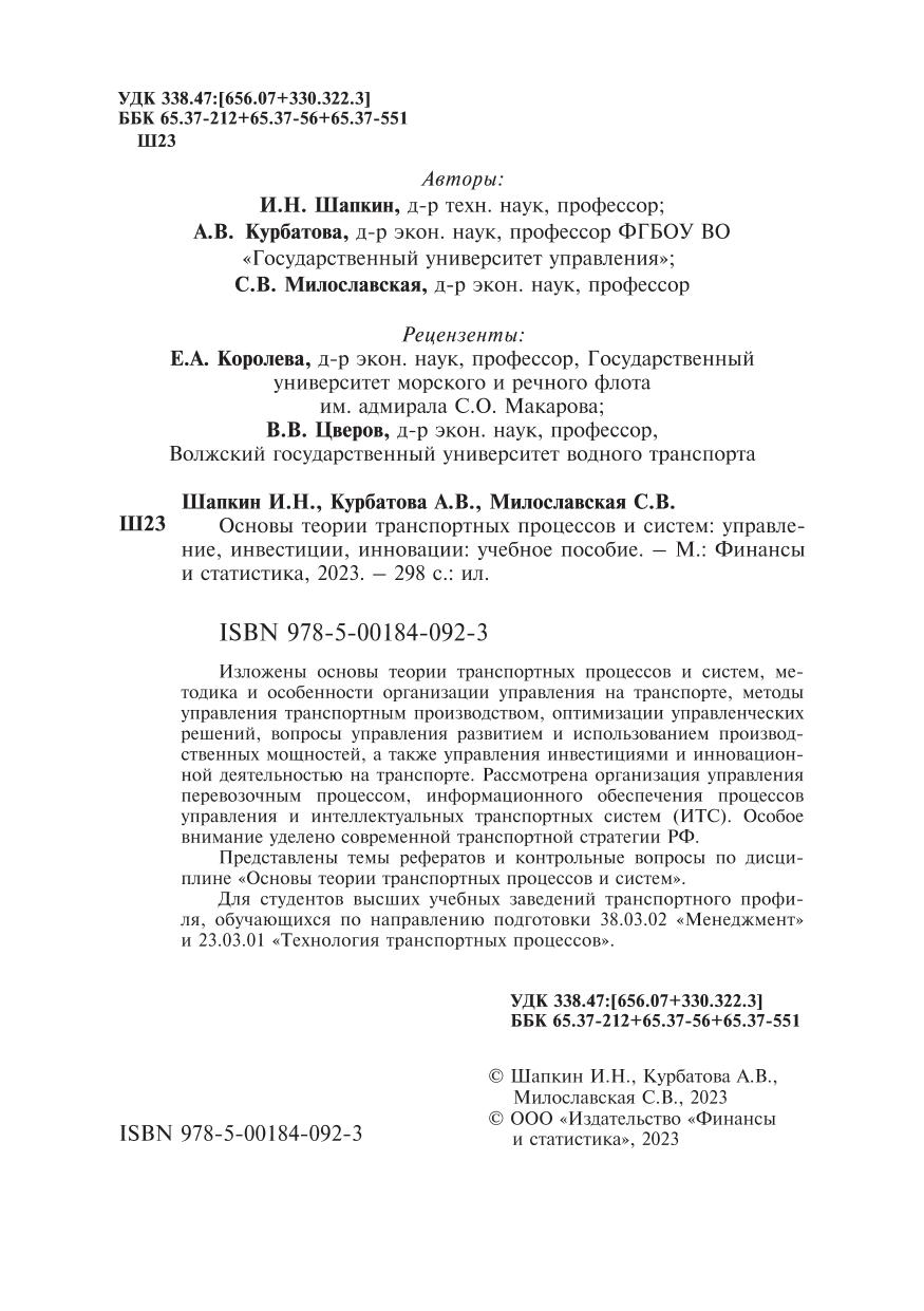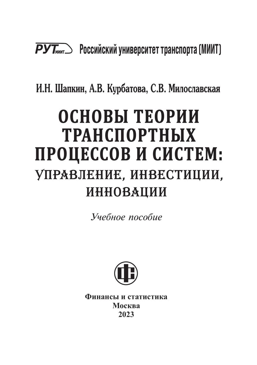 Изложены основы теории транспортных процессов и систем, методика и особенности организации управления на транспорте, методы управления транспортным производством, оптимизации управленческих решений, вопросы управления развитием и использованием производственных мощностей, а также управления инвестициями и инновационной деятельностью на транспорте. Рассмотрена организация управления перевозочным процессом, информационного обеспечения процессов управления и интеллектуальных транспортных систем (ИТС). Особое внимание уделено современной транспортной стратегии РФ. Представлены темы рефератов и контрольные вопросы по дисциплине «Основы теории транспортных процессов и систем». Для студентов высших учебных заведений транспортного профи- ля, обучающихся по направлению подготовки 38.03.02 «Менеджмент» и 23.03.01 «Технология транспортных процессов».