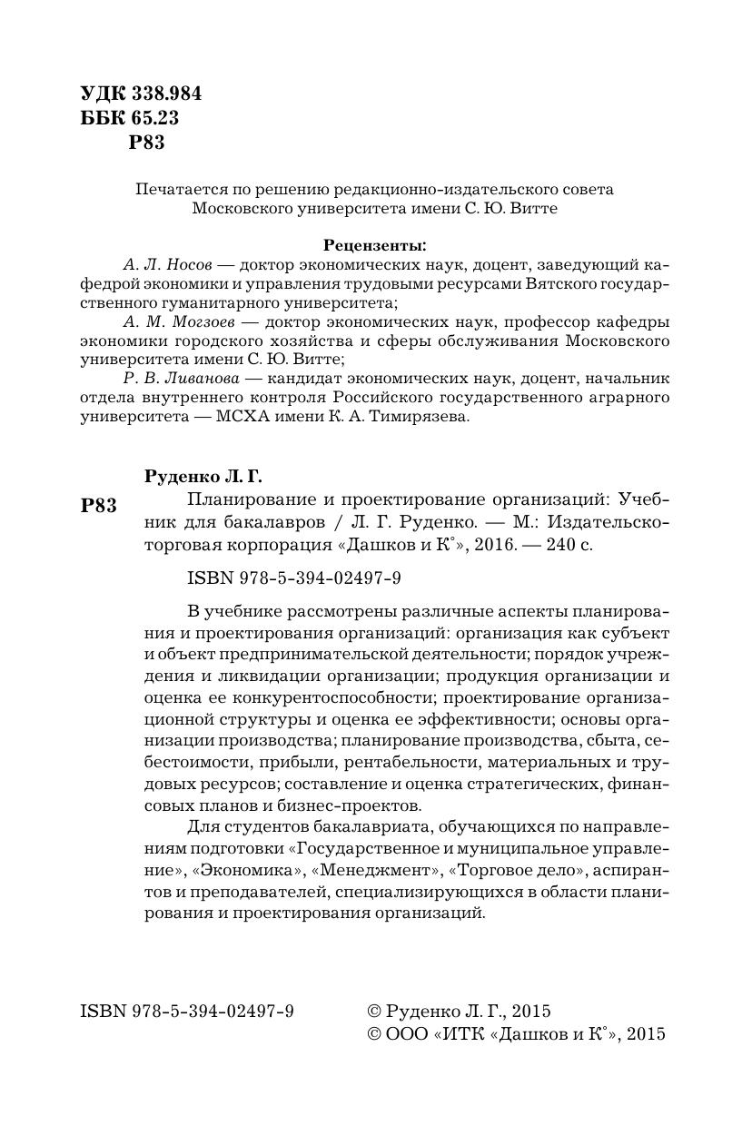 В учебнике рассмотрены различные аспекты планирования и проектирования организаций: организация как субъект и объект предпринимательской деятельности; порядок учреждения и ликвидации организации; продукция организации и оценка ее конкурентоспособности; проектирование организационной структуры и оценка ее эффективности; основы организации производства; планирование производства, сбыта, себестоимости, прибыли, рентабельности, материальных и трудовых ресурсов; составление и оценка стратегических, финансовых планов и бизнес-проектов. Для студентов бакалавриата, обучающихся по направлениям подготовки "Государственное и муниципальное управление", "Экономика", "Менеджмент", "Торговое дело", аспирантов и преподавателей, специализирующихся в области планирования и проектирования организаций.