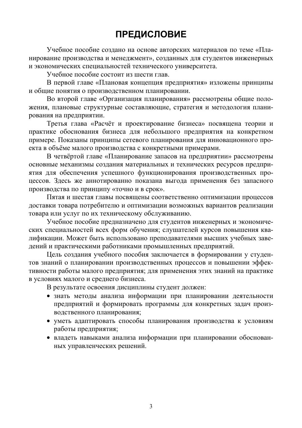 Учебное пособие создано на основе авторских материалов по данной теме. Оно состоит из шести глав, охватывающих все значимые аспекты планирования и управления работой предприятия. Цель учебного пособия заключается в передаче студентам знаний о планировании производственных процессов, повышающих эффективность работы предприятия, чтобы впоследствии применить эти знания на практике в условиях малого и среднего бизнеса. В результате обучения студент должен знать методы анализа информации при планировании деятельности предприятий, уметь адаптировать способы планирования к меняющимся условиям работы, владеть навыками обоснованных управленческих решений. Учебное пособие предназначено для студентов инженерных и экономических специальностей всех форм обучения и слушателей курсов повышения квалификации. Может использоваться преподавателями высших учебных заведений при подготовке и ведении занятий, а также практическими работниками промышленных предприятий.