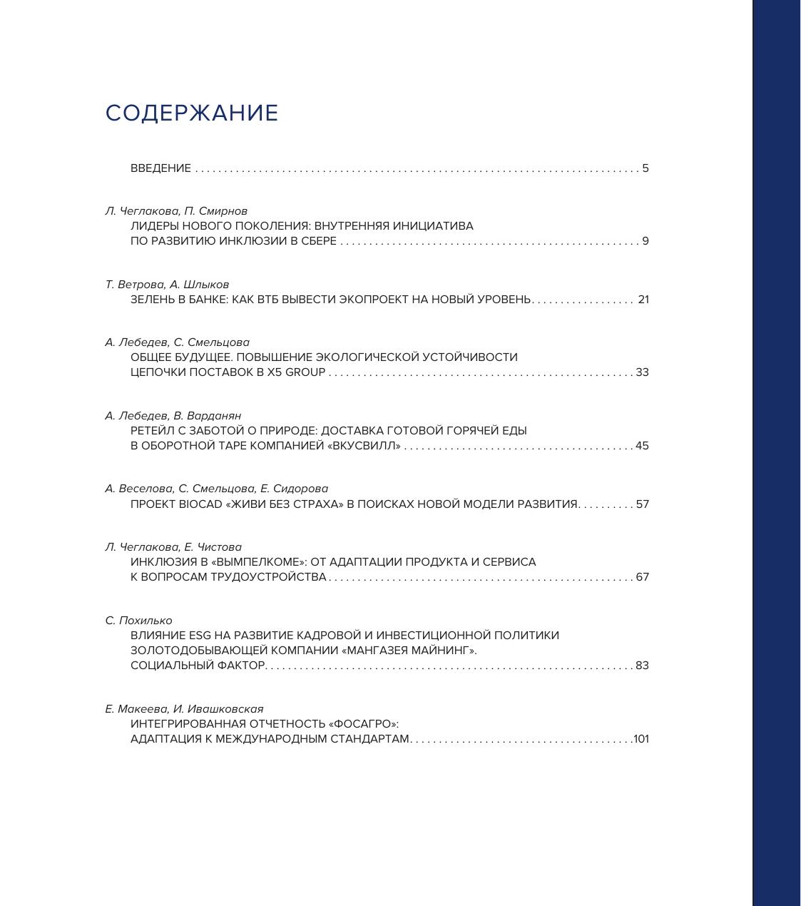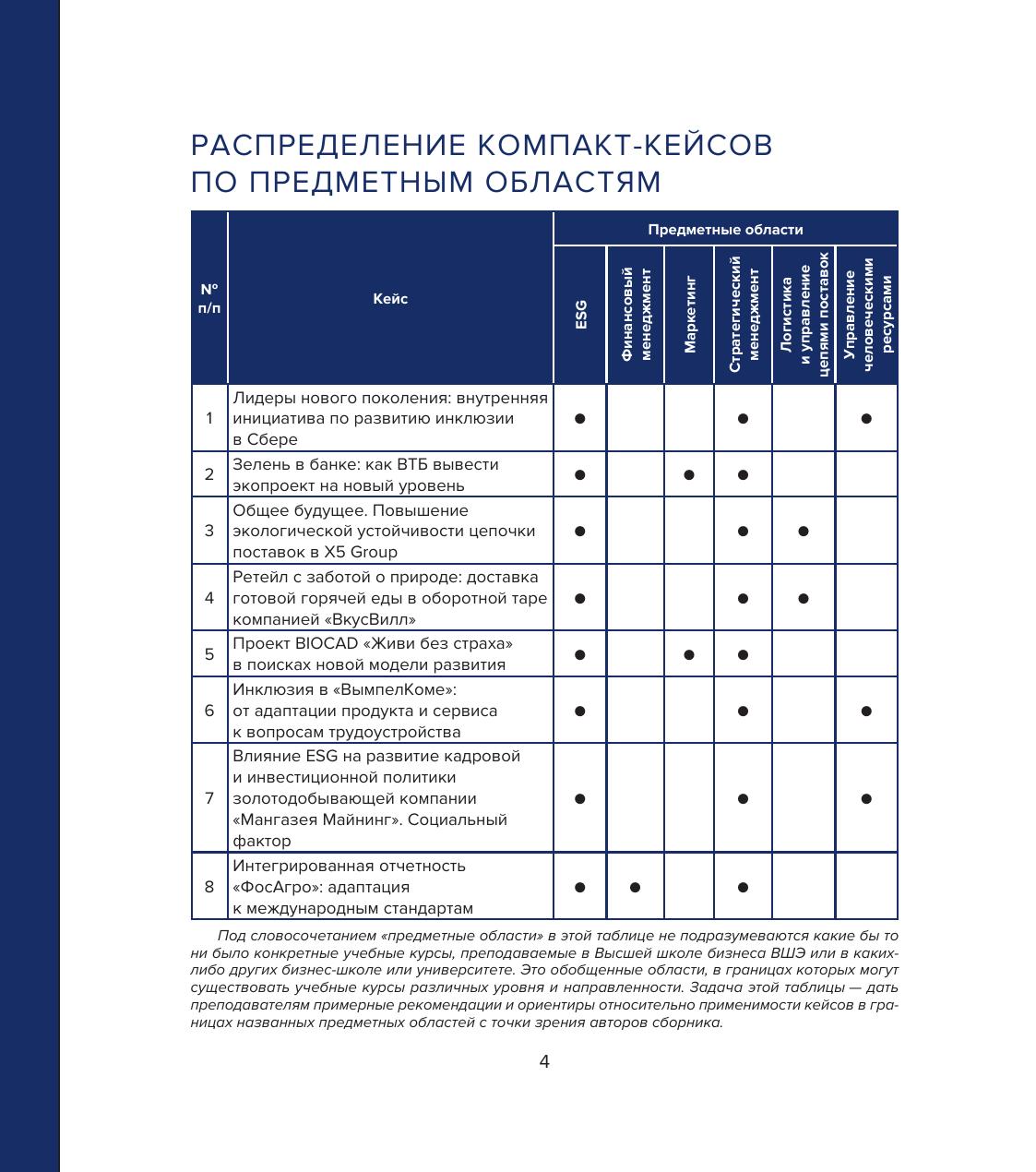 В сборник вошли 8 учебных кейсов, созданных преподавателями Высшей школы бизнеса ВШЭ в сотрудничестве с такими компаниями, как СберБанк, Банк ВТБ, Х5 Group, «ВкусВилл», BIOCAD, «Билайн», ГК «Мангазея» и «ФосАгро». Все кейсы основаны на реальных бизнес-ситуациях в области устойчивого развития и позволяют студентам подготовиться к реализации ESG-трансформации в российских компаниях. Ситуации рассматриваются в контексте одного из трех измерений ESG: окружающая среда (environment), общество (social), корпоративное управление (governance).