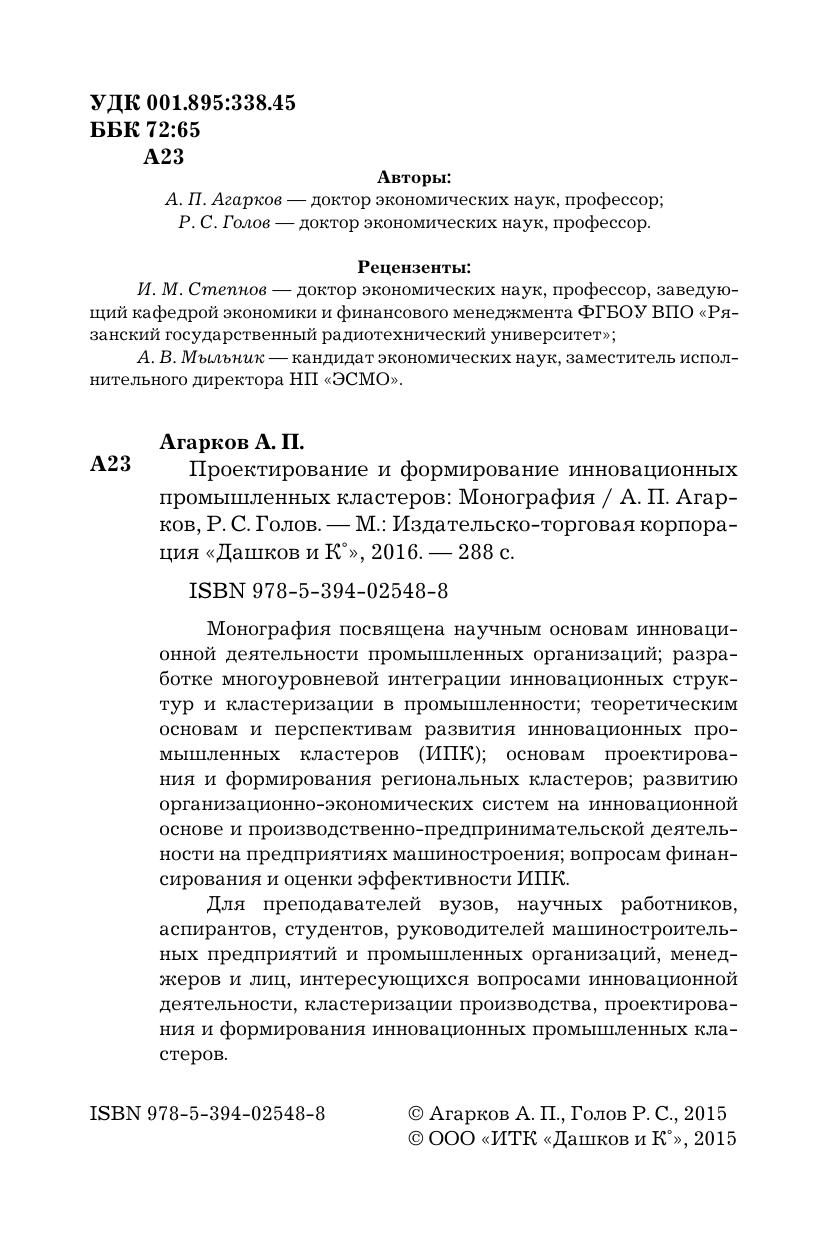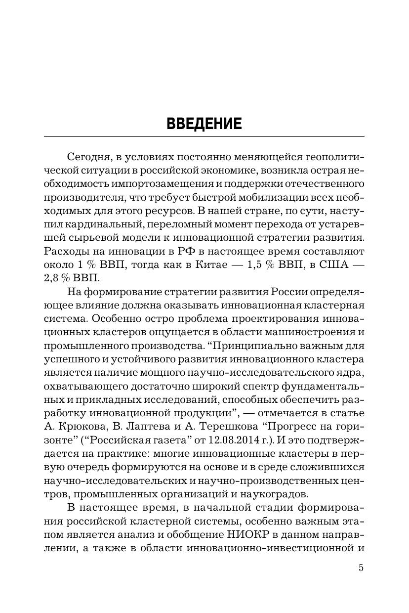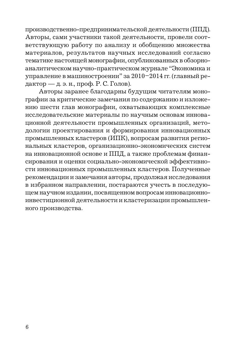 Монография посвящена научным основам инновационной деятельности промышленных организаций; разработке многоуровневой интеграции инновационных структур и кластеризации в промышленности; теоретическим основам и перспективам развития инновационных промышленных кластеров (ИПК); основам проектирования и формирования региональных кластеров; развитию организационно-экономических систем на инновационной основе и производственно-предпринимательской деятельности на предприятиях машиностроения; вопросам финансирования и оценки эффективности ИПК. Для преподавателей вузов, научных работников, аспирантов, студентов, руководителей машиностроительных предприятий и промышленных организаций, менеджеров и лиц, интересующихся вопросами инновационной деятельности, кластеризации производства, проектирования и формирования инновационных промышленных кластеров.