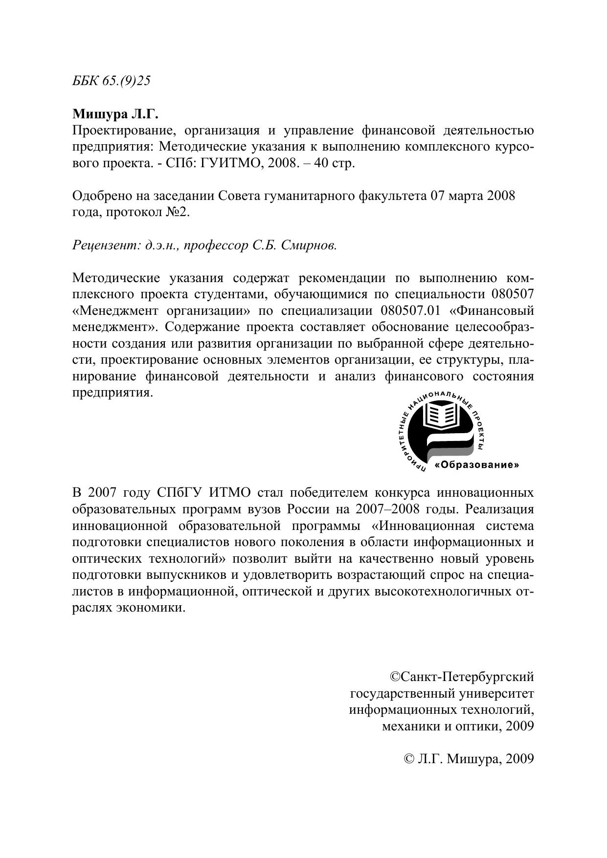 Методические указания содержат рекомендации по выполнению комплексного проекта студентами, обучающимися по специальности 080507 «Менеджмент организации» по специализации 080507.01 «Финансовый менеджмент». Содержание проекта составляет обоснование целесообразности создания или развития организации по выбранной сфере деятельности, проектирование основных элементов организации, ее структуры, планирование финансовой деятельности и анализ финансового состояния предприятия.