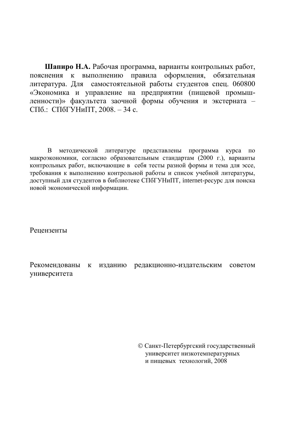 В методической литературе представлены программа курса по макроэкономики, согласно образовательным стандартам (2000 г.), варианты контрольных работ, включающие в себя тесты разной формы и тема для эссе, требования к выполнению контрольной работы и список учебной литературы, доступный для студентов в библиотеке СПбГУНиПТ, internet-ресурс для поиска новой экономической информации.