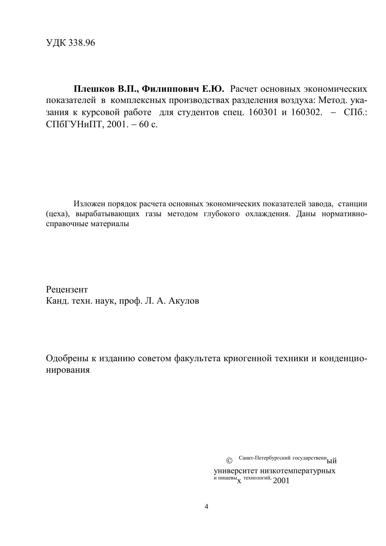 Расчет основных экономических показателей в комплексных производствах разделения воздуха: Методические указания к курсовой работе для студентов спец. 160301 и 160302