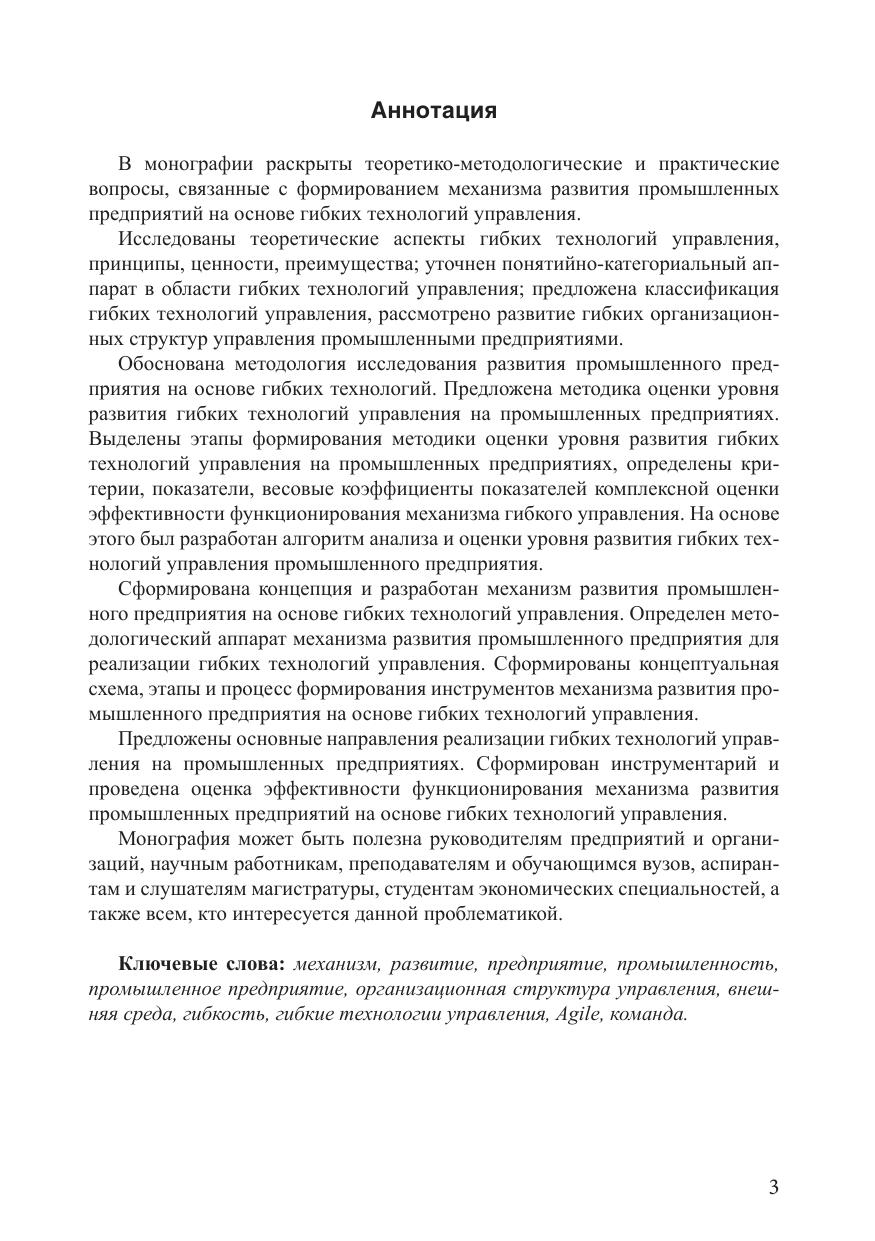 Предложены основные направления реализации гибких технологий управления на промышленных предприятиях. Сформирован инструментарий и проведена оценка эффективности функционирования механизма развития промышленных предприятий на основе гибких технологий управления. Монография может быть полезна руководителям предприятий и организаций, научным работникам, преподавателям и обучающимся вузов, аспирантам и слушателям магистратуры, студентам экономических специальностей, а также всем, кто интересуется данной проблематикой.