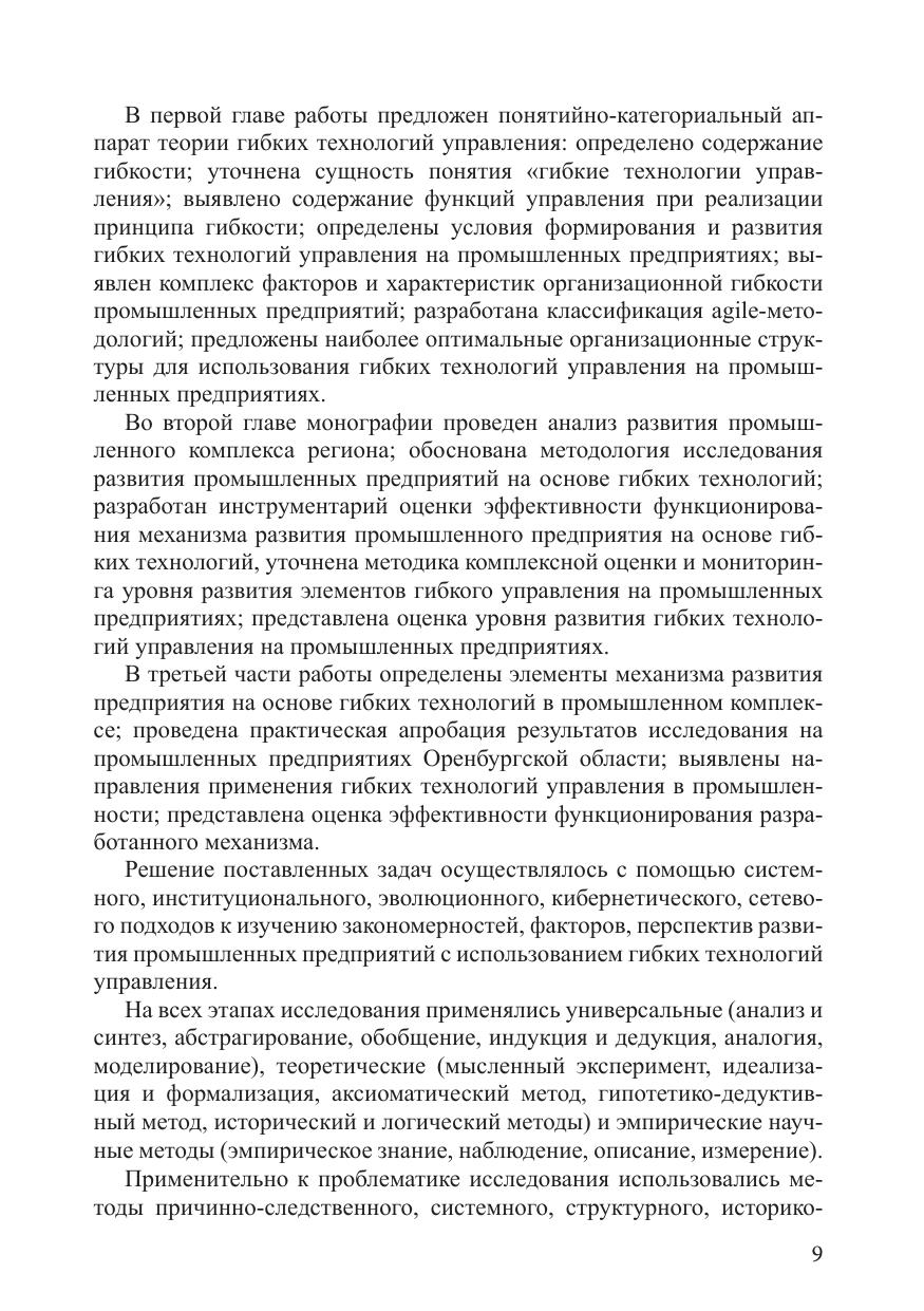 Исследованы теоретические аспекты гибких технологий управления, принципы, ценности, преимущества; уточнен понятийно-категориальный аппарат в области гибких технологий управления; предложена классификация гибких технологий управления, рассмотрено развитие гибких организационных структур управления промышленными предприятиями. Обоснована методология исследования развития промышленного предприятия на основе гибких технологий. Предложена методика оценки уровня развития гибких технологий управления на промышленных предприятиях. Выделены этапы формирования методики оценки уровня развития гибких технологий управления на промышленных предприятиях, определены критерии, показатели, весовые коэффициенты показателей комплексной оценки эффективности функционирования механизма гибкого управления. На основе этого был разработан алгоритм анализа и оценки уровня развития гибких технологий управления промышленного предприятия. Сформирована концепция и разработан механизм развития промышленного предприятия на основе гибких технологий управления. Определен методологический аппарат механизма развития промышленного предприятия для реализации гибких технологий управления. Сформированы концептуальная схема, этапы и процесс формирования инструментов механизма развития промышленного предприятия на основе гибких технологий управления.