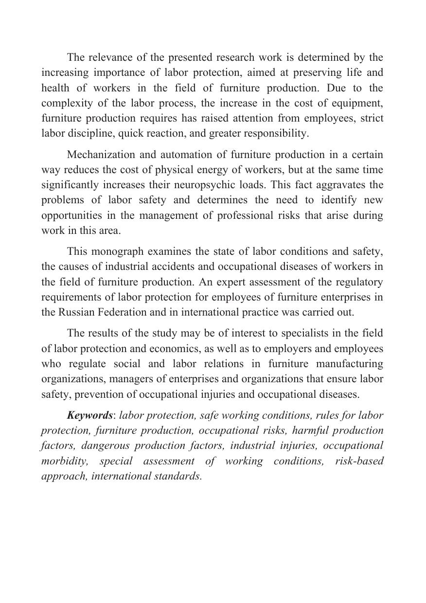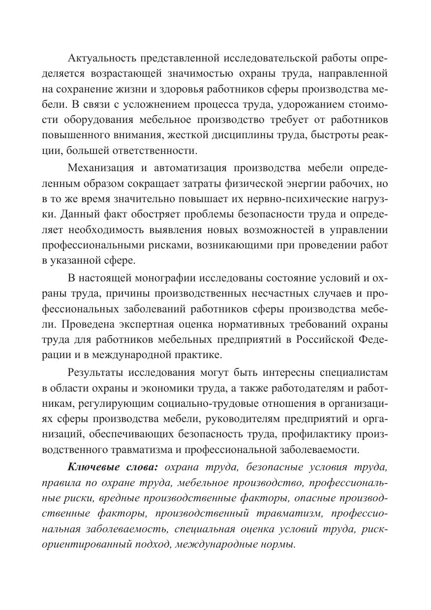 В настоящей монографии исследованы состояние условий и охраны труда, причины производственных несчастных случаев и профессиональных заболеваний работников сферы производства мебели. Проведена экспертная оценка нормативных требований охраны труда для работников мебельных предприятий в Российской Федерации и в международной практике.