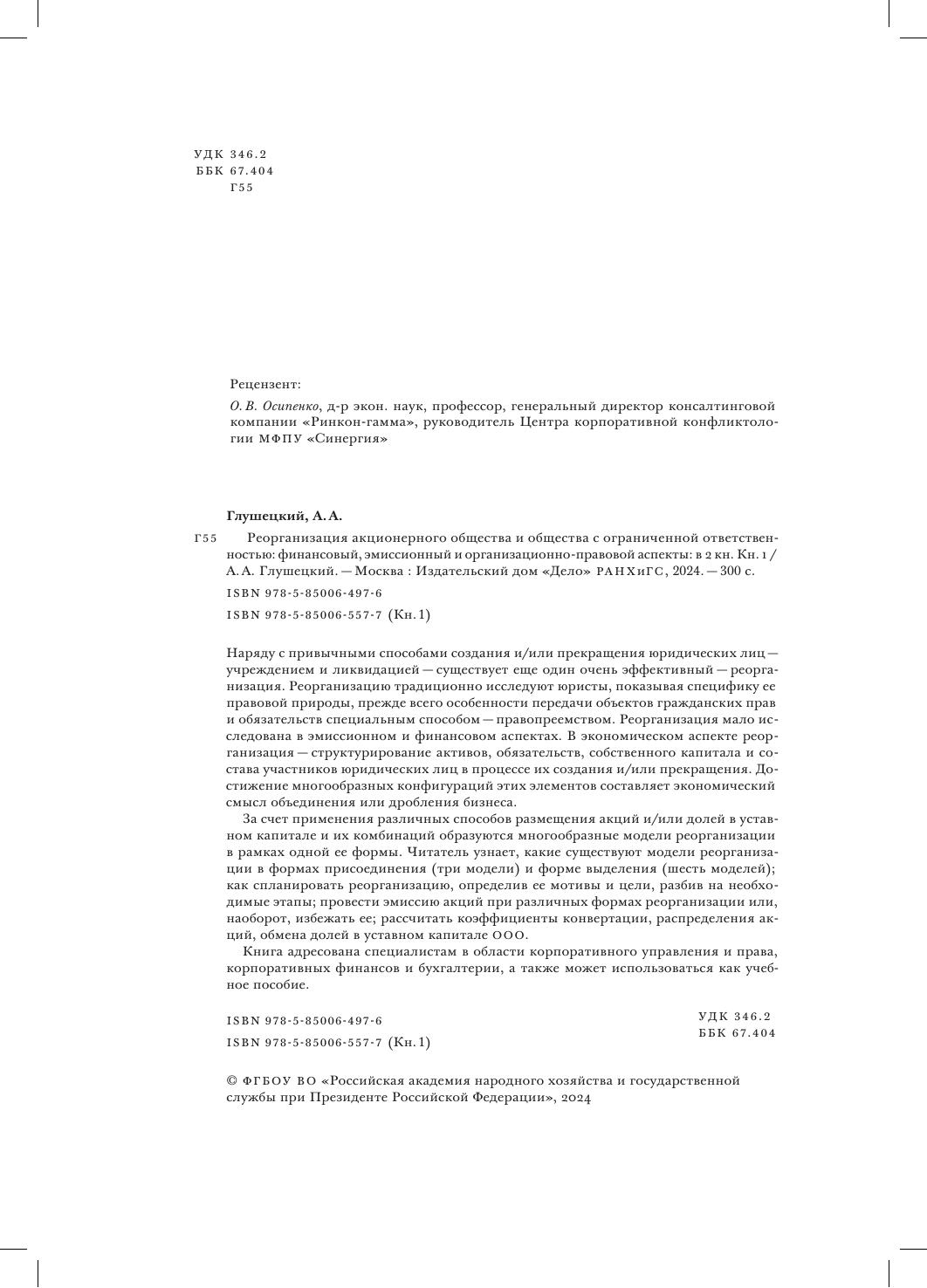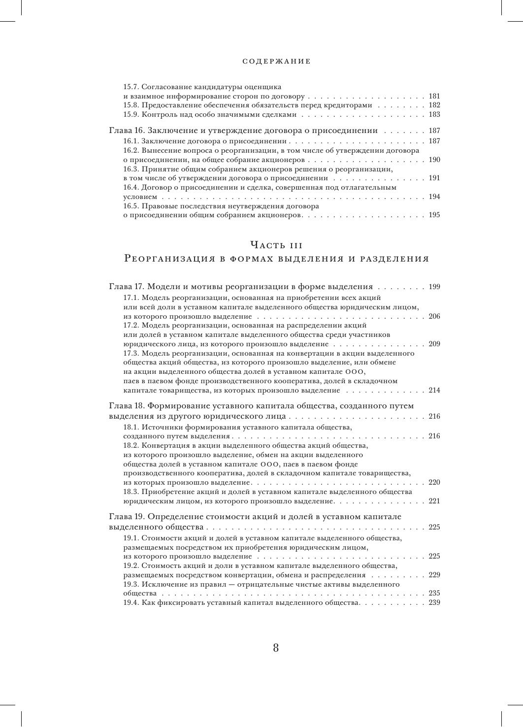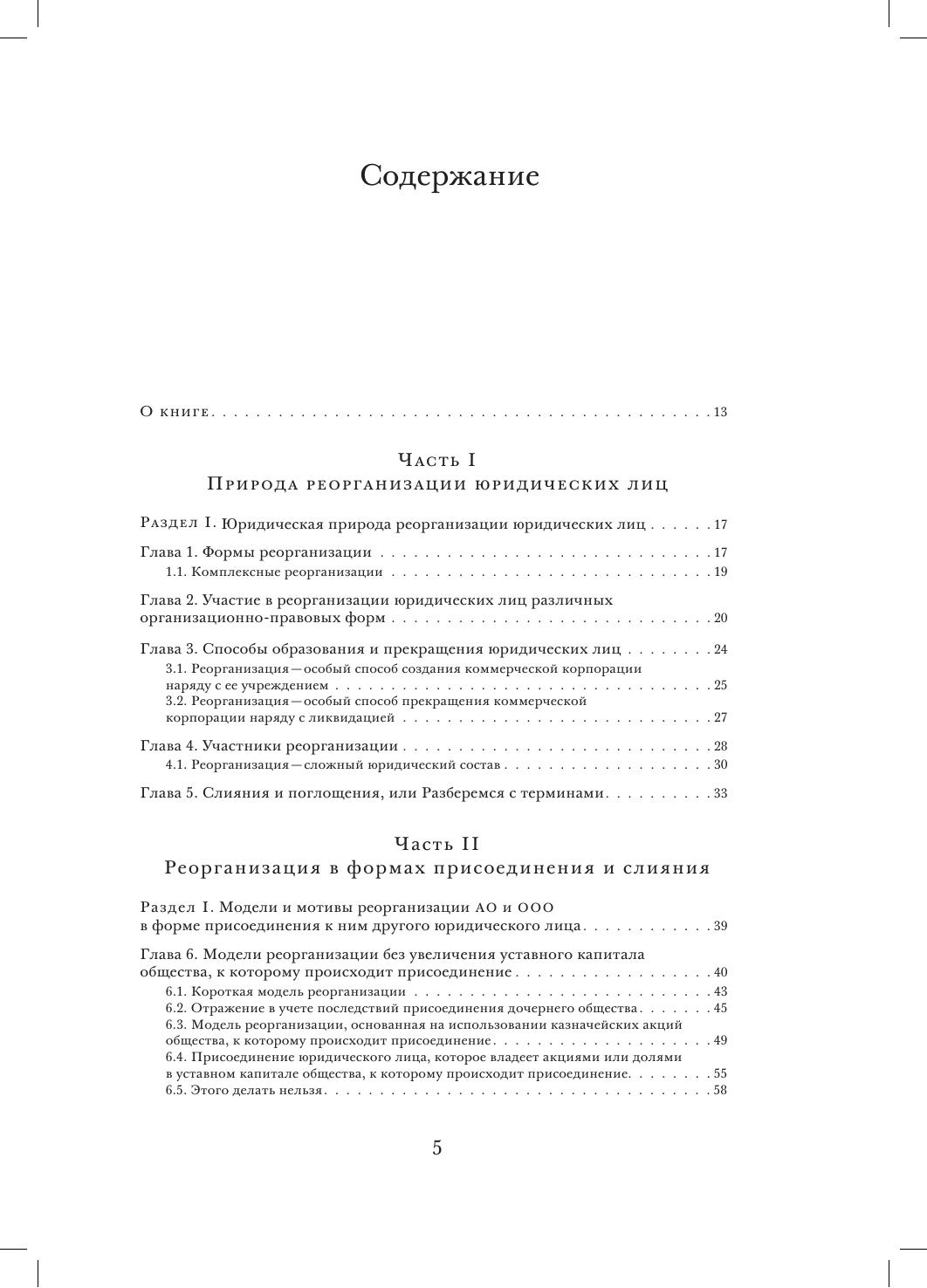 смысл объединения или дробления бизнеса. За счет применения различных способов размещения акций и/или долей в уставном капитале и их комбинаций образуются многообразные модели реорганизации в рамках одной ее формы. Читатель узнает, какие существуют модели реорганизации в формах присоединения (три модели) и форме выделения (шесть моделей); как спланировать реорганизацию, определив ее мотивы и цели, разбив на необходимые этапы; провести эмиссию акций при различных формах реорганизации или, наоборот, избежать ее; рассчитать коэффициенты конвертации, распределения акций, обмена долей в уставном капитале ООО. Книга адресована специалистам в области корпоративного управления и права, корпоративных финансов и бухгалтерии, а также может использоваться как учебное пособие.