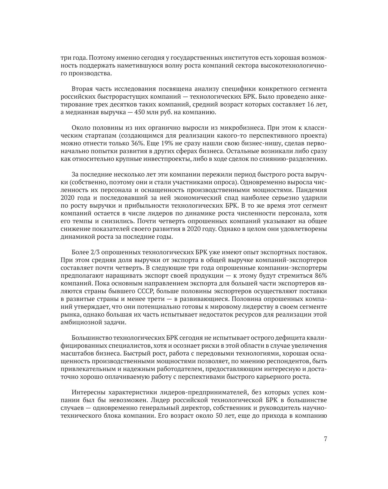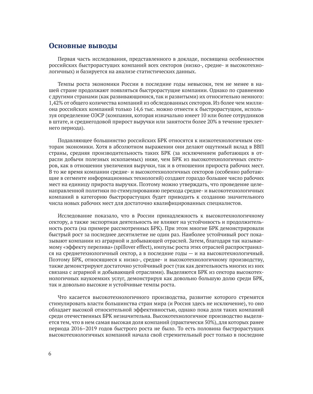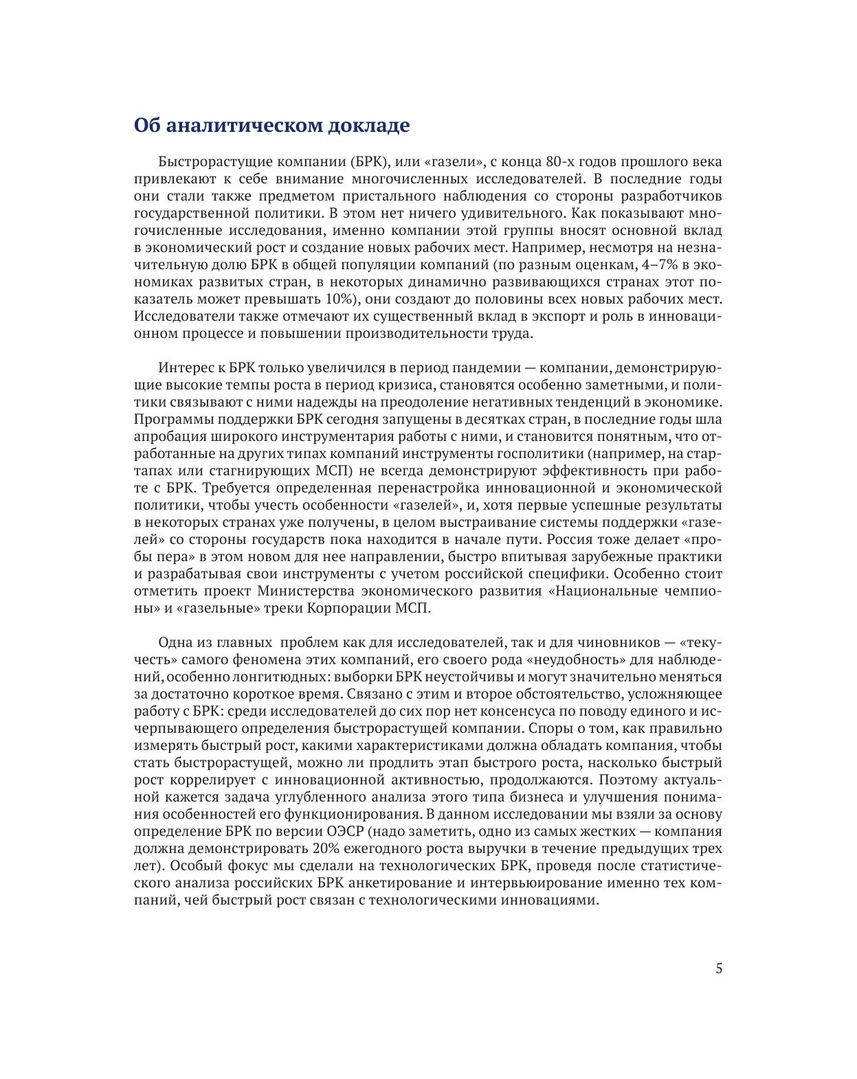 Быстрорастущие компании (БРК), или «газели» (англ. high-growth firms; gazelles), по данным многих исследований, вносят значительный вклад в экономический рост, создание новых рабочих мест, экспорт и развитие инноваций. Настоящий доклад включает обзор публикаций по теме БРК; на базе анализа большого массива статистических данных и данных налоговой отчетности выявлены характерные черты российских БРК. На основе анкетирования компаний, относящихся к одному из наиболее экономически перспективных сегментов компаний этого типа, — технологических БРК — показаны особенности этих компаний. Обобщены данные о траекториях роста, факторах успеха, портрете лидера — собственника российских технологических БРК. Проанализированы используемые этими компаниями инструменты государственной поддержки и запросы на расширение разнообразия и охвата таких инструментов.