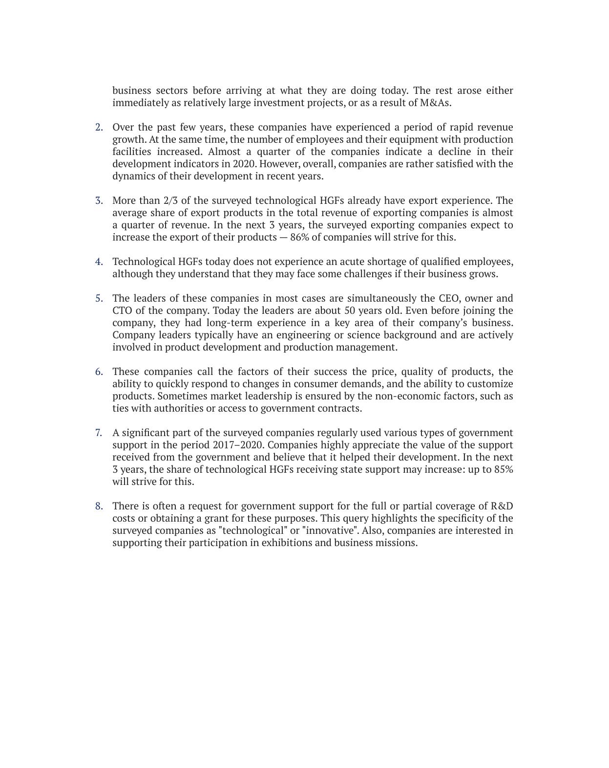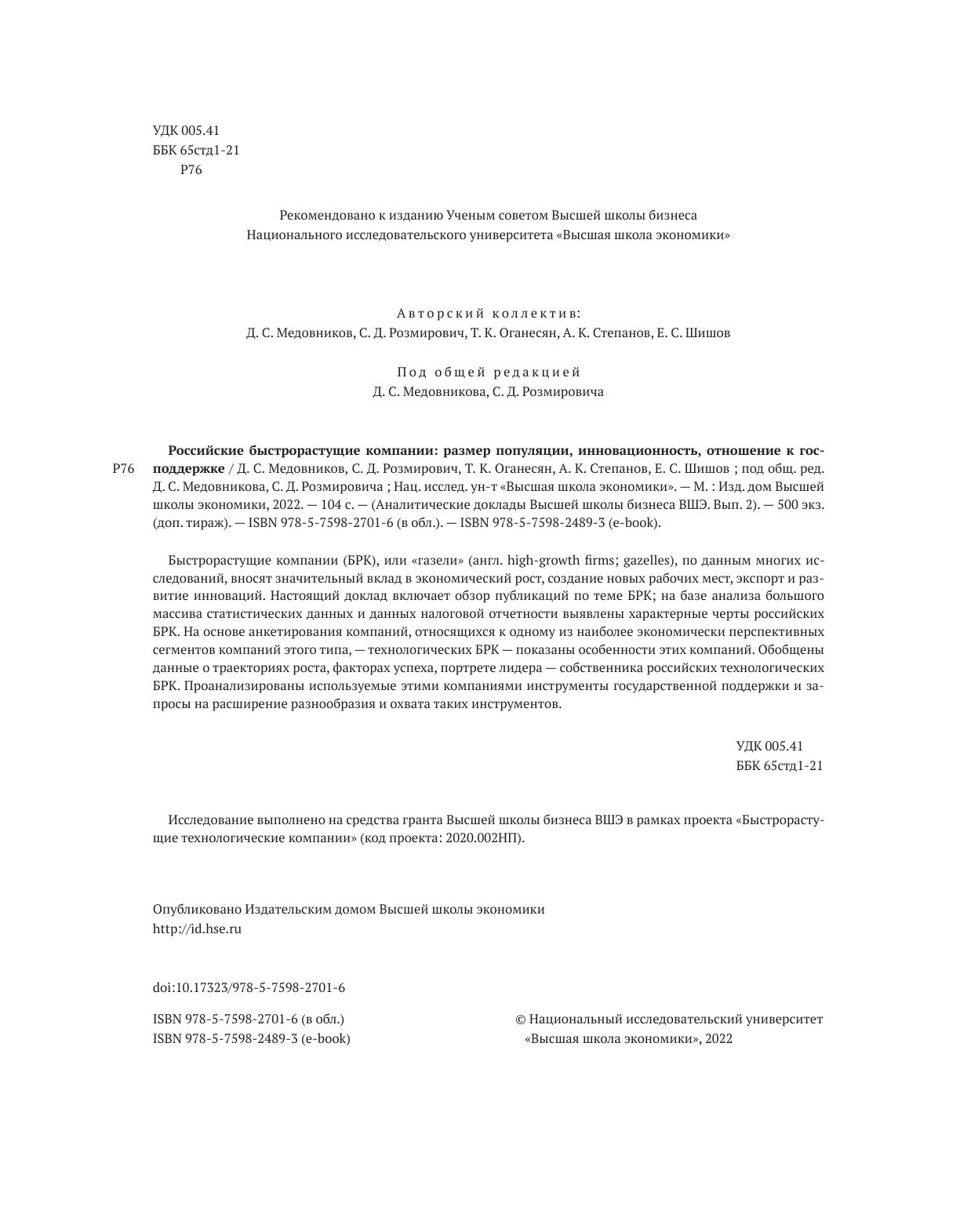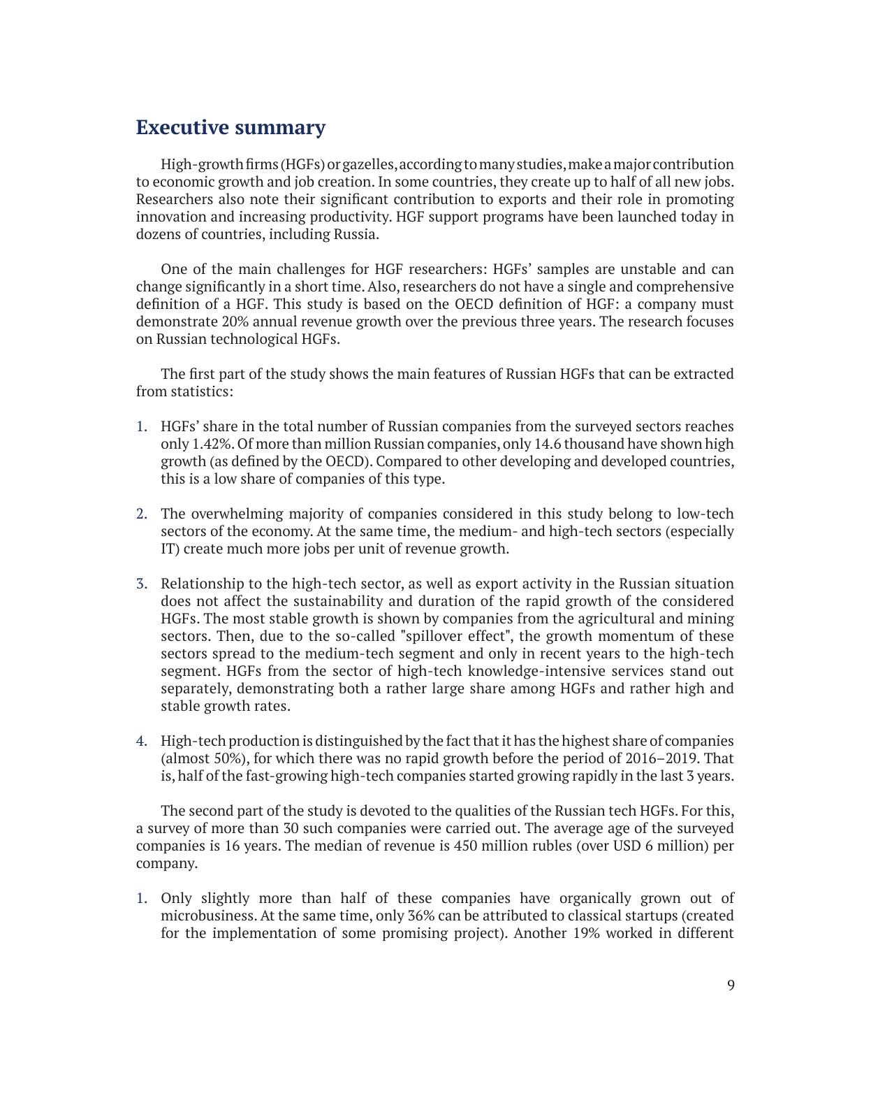 Быстрорастущие компании (БРК), или «газели» (англ. high-growth firms; gazelles), по данным многих исследований, вносят значительный вклад в экономический рост, создание новых рабочих мест, экспорт и развитие инноваций. Настоящий доклад включает обзор публикаций по теме БРК; на базе анализа большого массива статистических данных и данных налоговой отчетности выявлены характерные черты российских БРК. На основе анкетирования компаний, относящихся к одному из наиболее экономически перспективных сегментов компаний этого типа, — технологических БРК — показаны особенности этих компаний. Обобщены данные о траекториях роста, факторах успеха, портрете лидера — собственника российских технологических БРК. Проанализированы используемые этими компаниями инструменты государственной поддержки и запросы на расширение разнообразия и охвата таких инструментов.