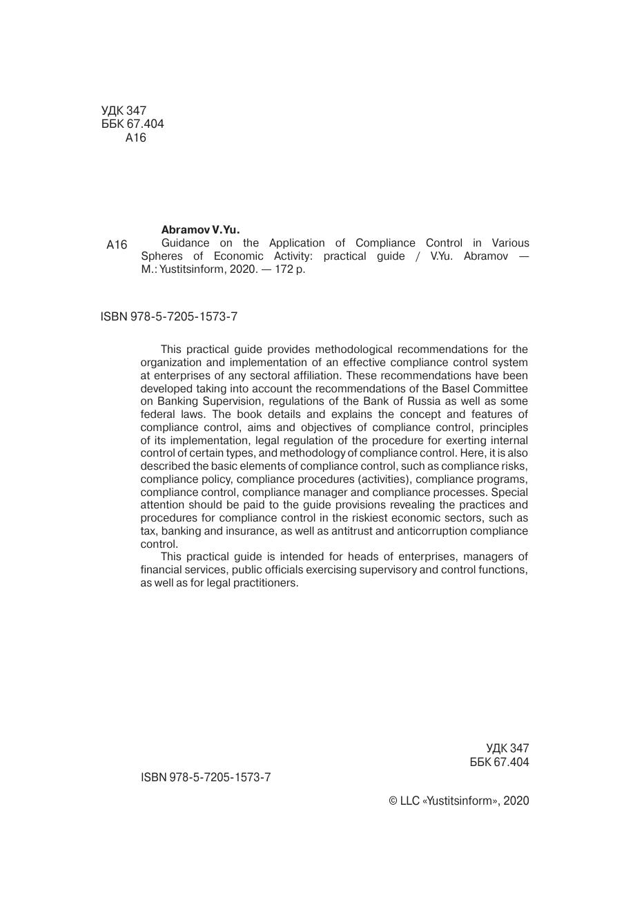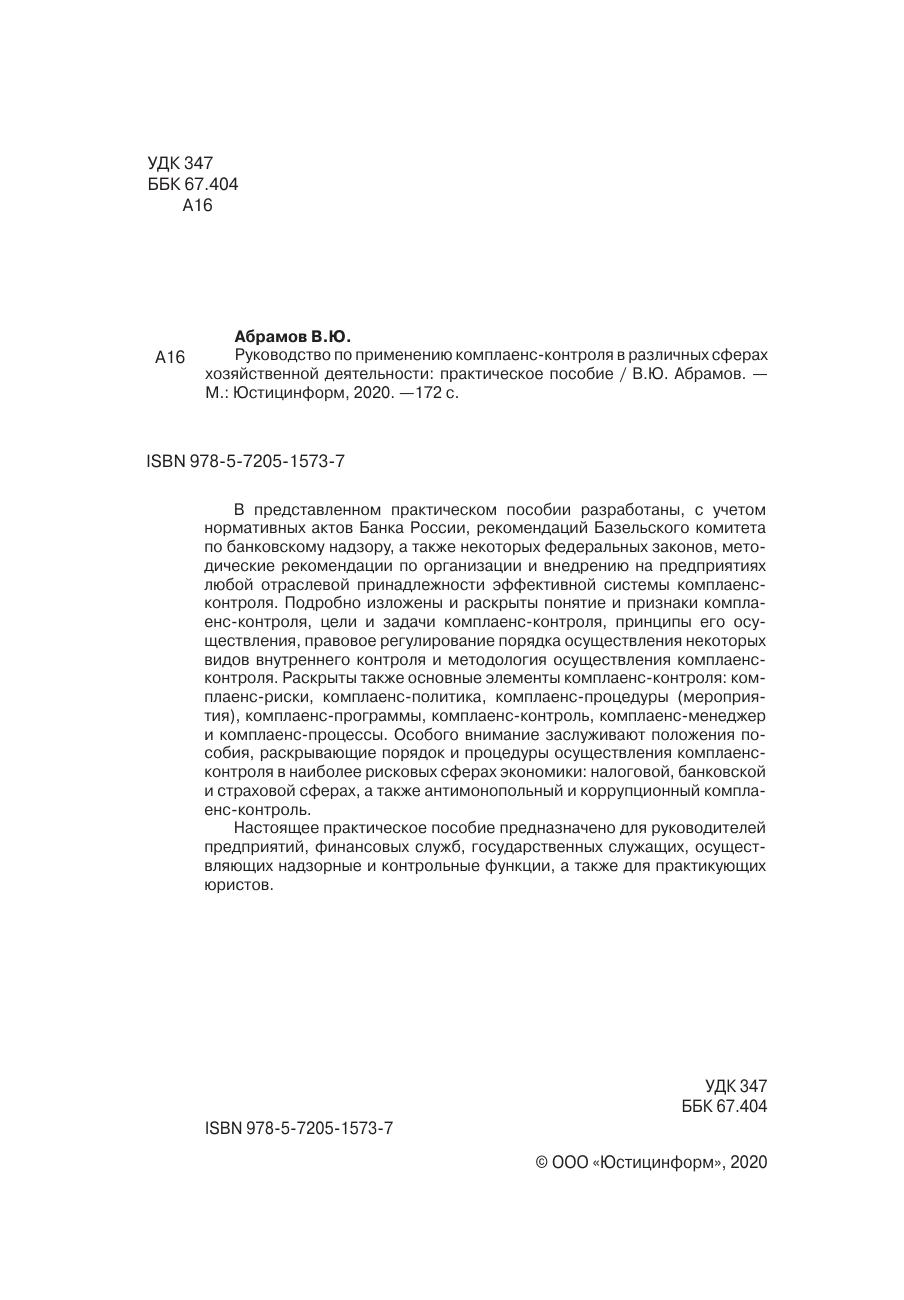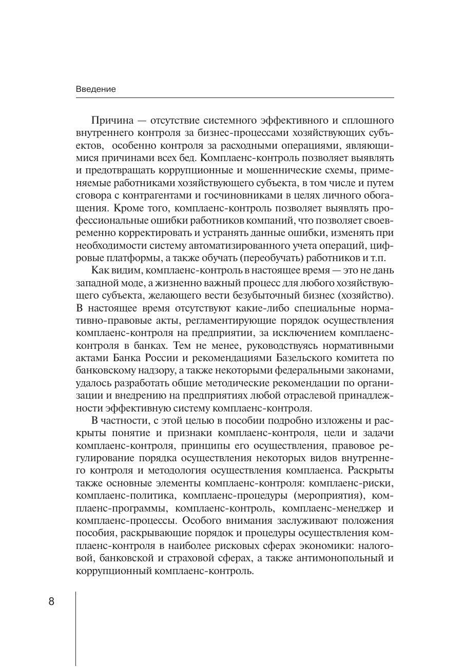 В представленном практическом пособии разработаны, с учетом нормативных актов Банка России, рекомендаций Базельского комитета по банковскому надзору, а также некоторых федеральных законов, методические рекомендации по организации и внедрению на предприятиях любой отраслевой принадлежности эффективной системы комплаенс-контроля. Подробно изложены и раскрыты понятие и признаки комплаенс-контроля, цели и задачи комплаенс-контроля, принципы его осуществления, правовое регулирование порядка осуществления некоторых видов внутреннего контроля и методология осуществления комплаенс-контроля. Раскрыты также основные элементы комплаенс-контроля: комплаенс-риски, комплаенс-политика, комплаенс-процедуры (мероприятия), комплаенс-программы, комплаенс-контроль, комплаенс-менеджер и комплаенс-процессы. Особого внимание заслуживают положения пособия, раскрывающие порядок и процедуры осуществления комплаенс-контроля в наиболее рисковых сферах экономики: налоговой, банковской и страховой сферах, а также антимонопольный и коррупционный комплаенс-контроль.