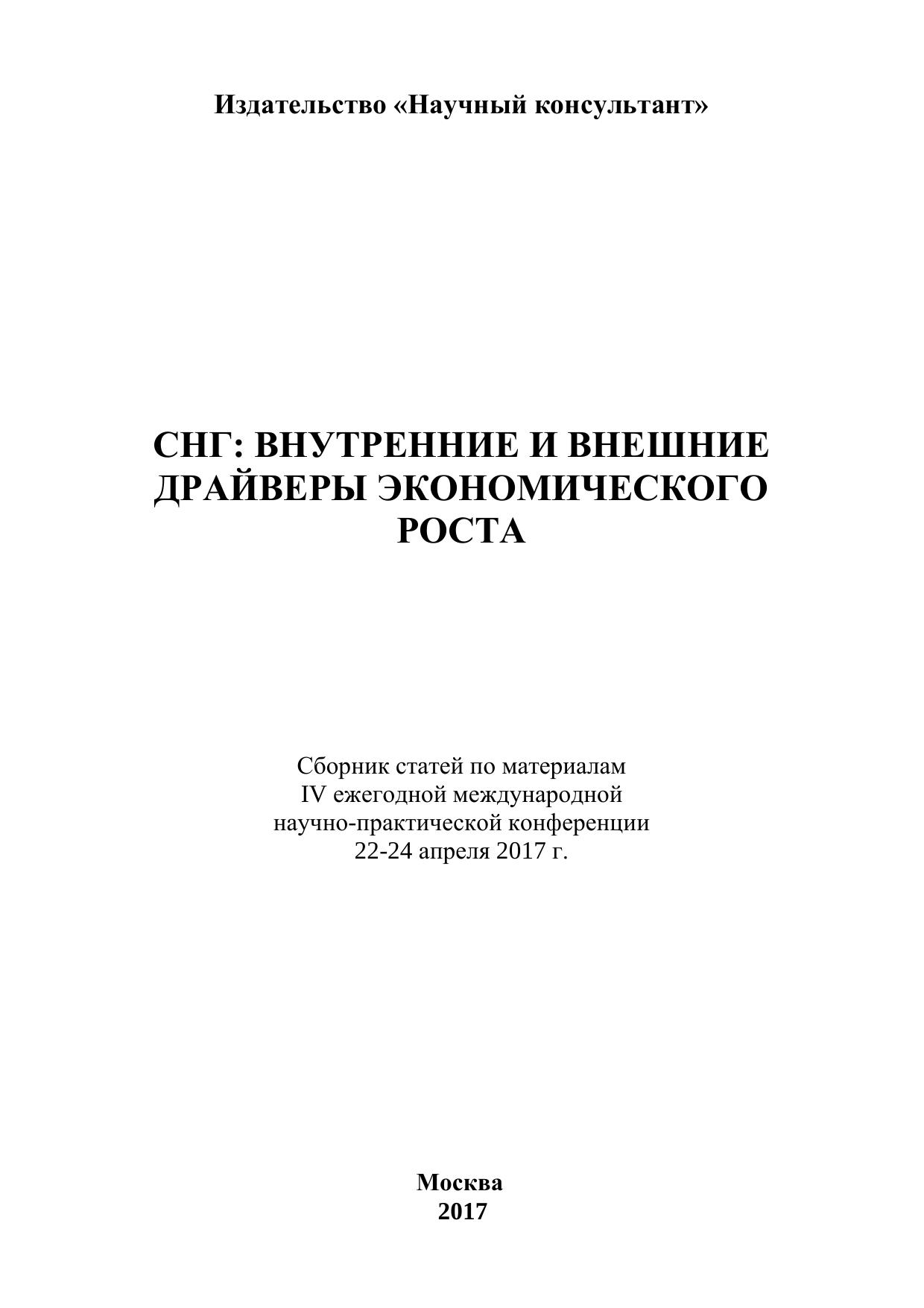 Настоящий сборник содержит материалы IV ежегодной международной научно-практической конференции «СНГ: внутренние и внешние драйверы экономического роста» состоявшейся 22-24 апреля 2017 г. (г. Москва). Исследования, представленные в сборнике, отражают современный научно-практический взгляд на различные актуальные направления - от экономических гуманитарных. Сборник предназначается для научных работников, студентов и преподавателей высших учебных заведений, руководителей предприятий разных форм собственности, а так же может использоваться в качестве дополнительного учебного пособия в процессе обучения магистрантов и аспирантов соответствующих направлений.