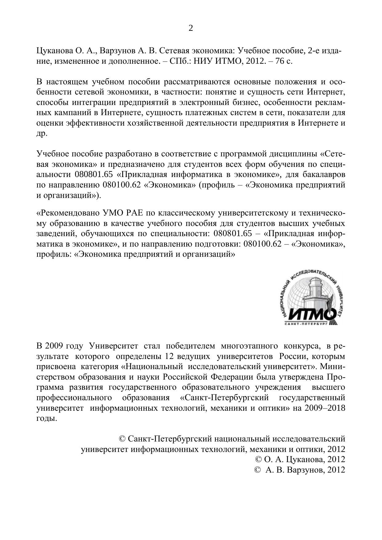 В настоящем учебном пособии рассматриваются основные положения и особенности сетевой экономики, в частности: понятие и сущность сети Интернет, способы интеграции предприятий в электронный бизнес, особенности рекламных кампаний в Интернете, сущность платежных систем в сети, показатели для оценки эффективности хозяйственной деятельности предприятия в Интернете и др. Учебное пособие разработано в соответствие с программой дисциплины «Сетевая экономика» и предназначено для студентов всех форм обучения по специальности 080801.65 «Прикладная информатика в экономике», для бакалавровпо направлению 080100.62 «Экономика» (профиль – «Экономика предприятий и организаций»).
