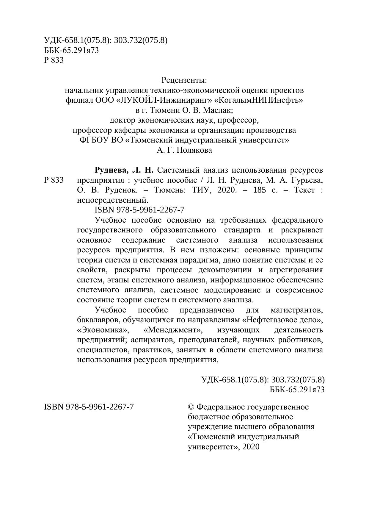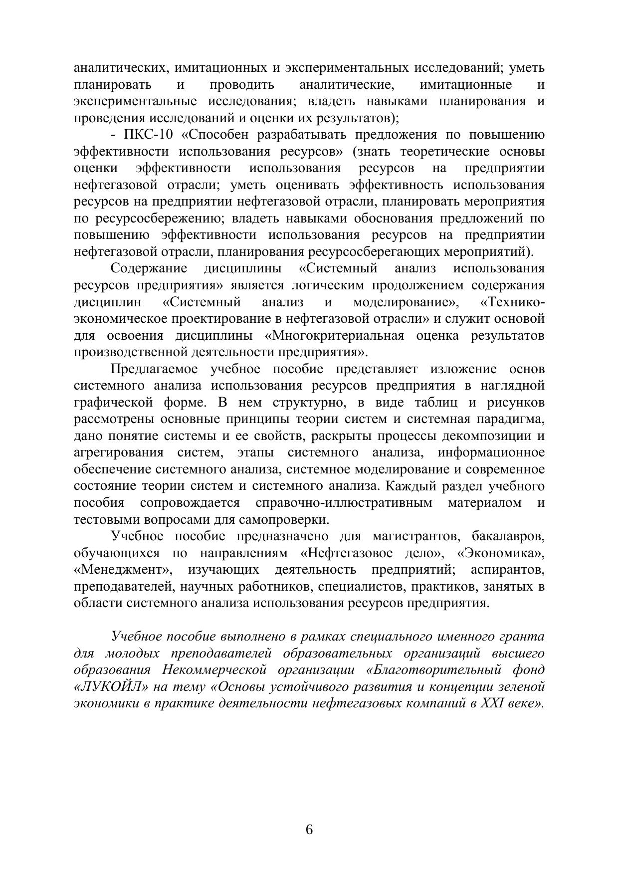 Учебное пособие основано на требованиях федерального государственного образовательного стандарта и раскрывает основное содержание системного анализа использования ресурсов предприятия. В нем изложены: основные принципы теории систем и системная парадигма, дано понятие системы и ее свойств, раскрыты процессы декомпозиции и агрегирования систем, этапы системного анализа, информационное обеспечение системного анализа, системное моделирование и современное состояние теории систем и системного анализа. Учебное пособие предназначено для магистрантов, бакалавров, обучающихся по направлениям «Нефтегазовое дело», «Экономика», «Менеджмент», изучающих деятельность предприятий; аспирантов, преподавателей, научных работников, специалистов, практиков, занятых в области системного анализа использования ресурсов предприятия.