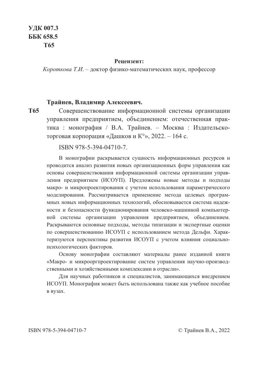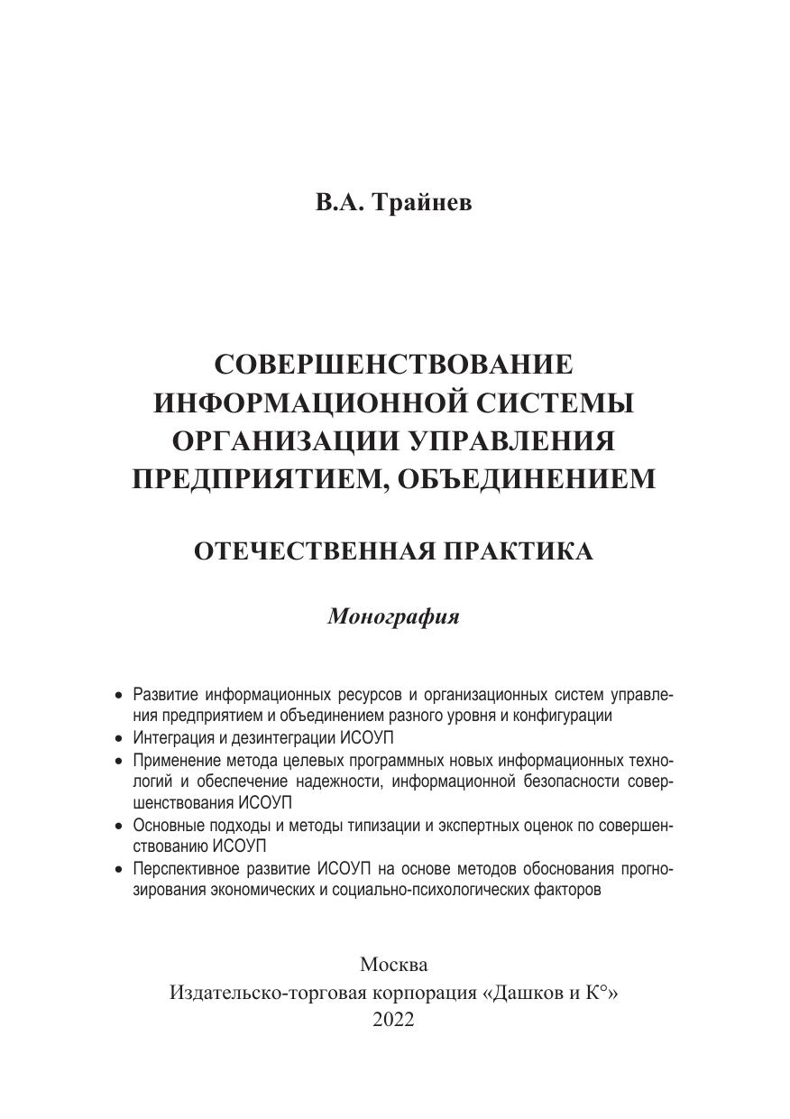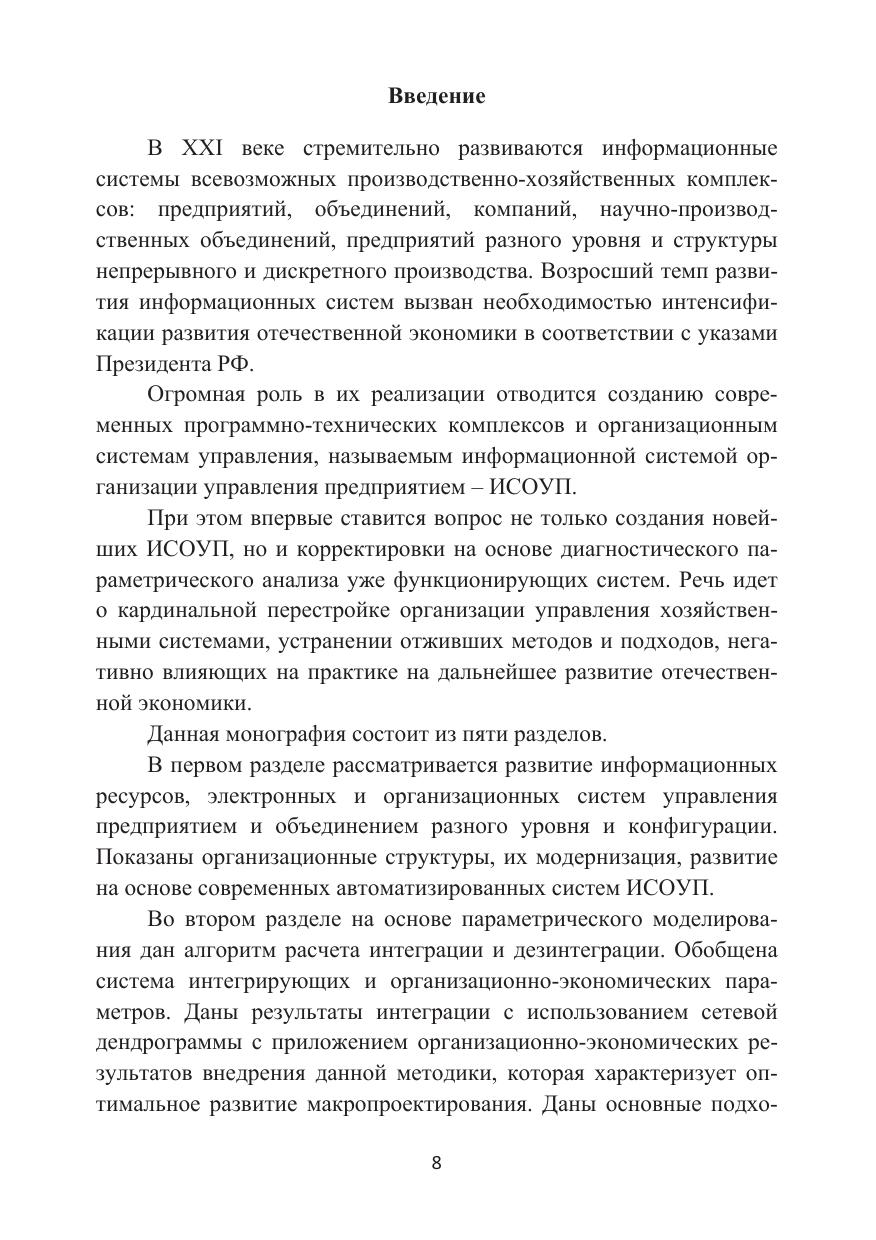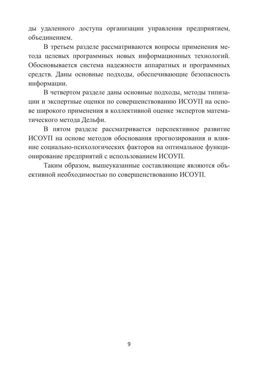 В монографии раскрывается сущность информационных ресурсов и проводится анализ развития новых организационных форм управления как основы совершенствования информационной системы организации управ-ления предприятием (ИСОУП). Предложены новые методы и подходы макро- и микропроектирования с учетом использования параметрического моделирования. Рассматривается применение метода целевых програм-мных новых информационных технологий, обосновывается система надеж-ности и безопасности функционирования человеко-машинной компьютер-ной системы организации управления предприятием, объединением. Рас-крываются основные подходы, методы типизации и экспертные оценки по совершенствованию ИСОУП с использованием метода Дельфи. Характери-зуются перспективы развития ИСОУП с учетом влияния социально-психологических факторов.