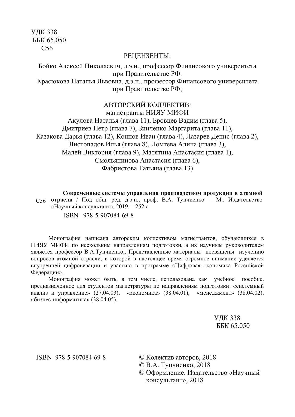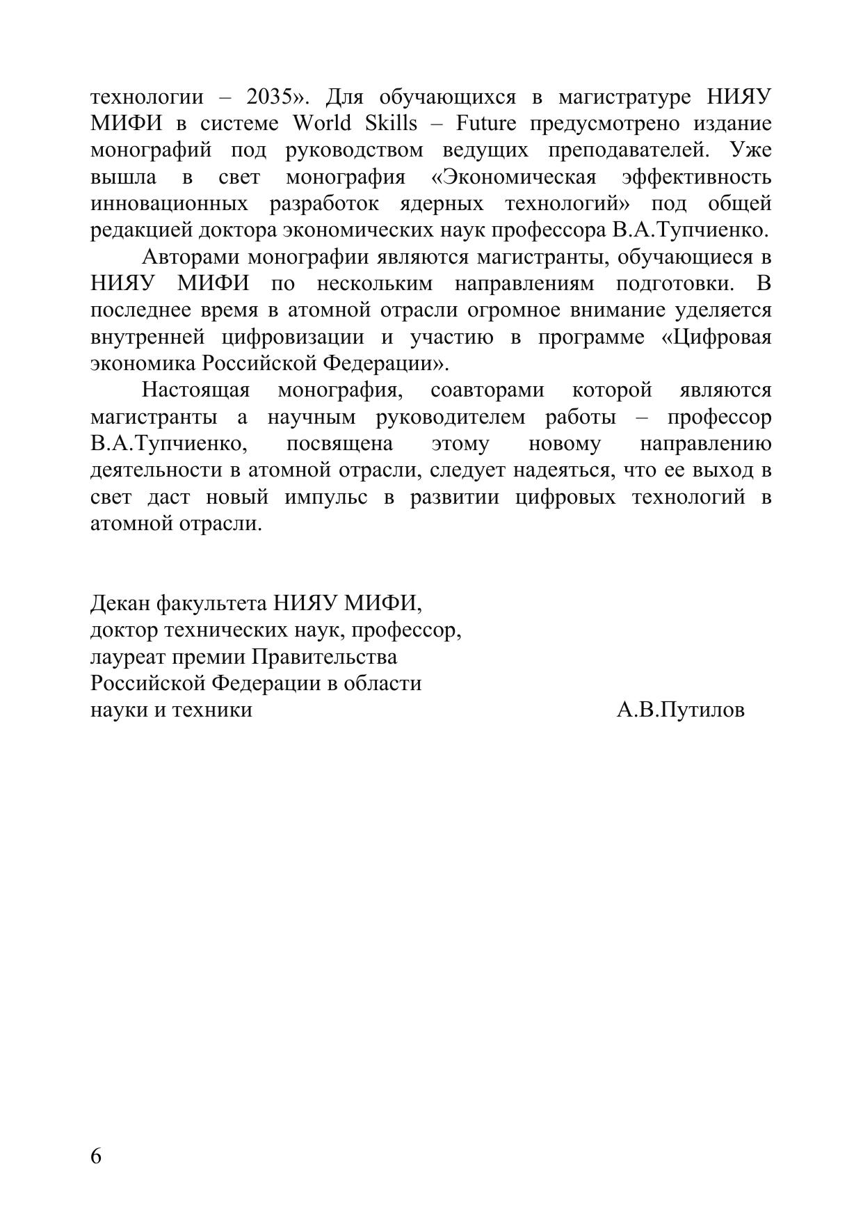 Монография написана авторским коллективом магистрантов, обучающихся в НИЯУ МИФИ по нескольким направлениям подготовки, а их научным руководителем является профессор В.А.Тупчиенко. Представленные материалы посвящены изучению вопросов атомной отрасли, в которой в настоящее время огромное внимание уделяется внутренней цифровизации и участию в программе «Цифровая экономика Российской Федерации».