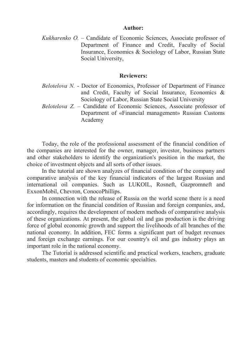 В учебном пособии проведен анализ финансового состояния компаний и сравнительный анализ основных финансовых показателей крупнейших российских и международных нефтяных компании. Таких как, ПАО «ЛУКОЙЛ», ОАО «НК «Роснефть», ПАО «Газпром нефть» и ExxonMobil, Chevron, ConocoPhillips.
