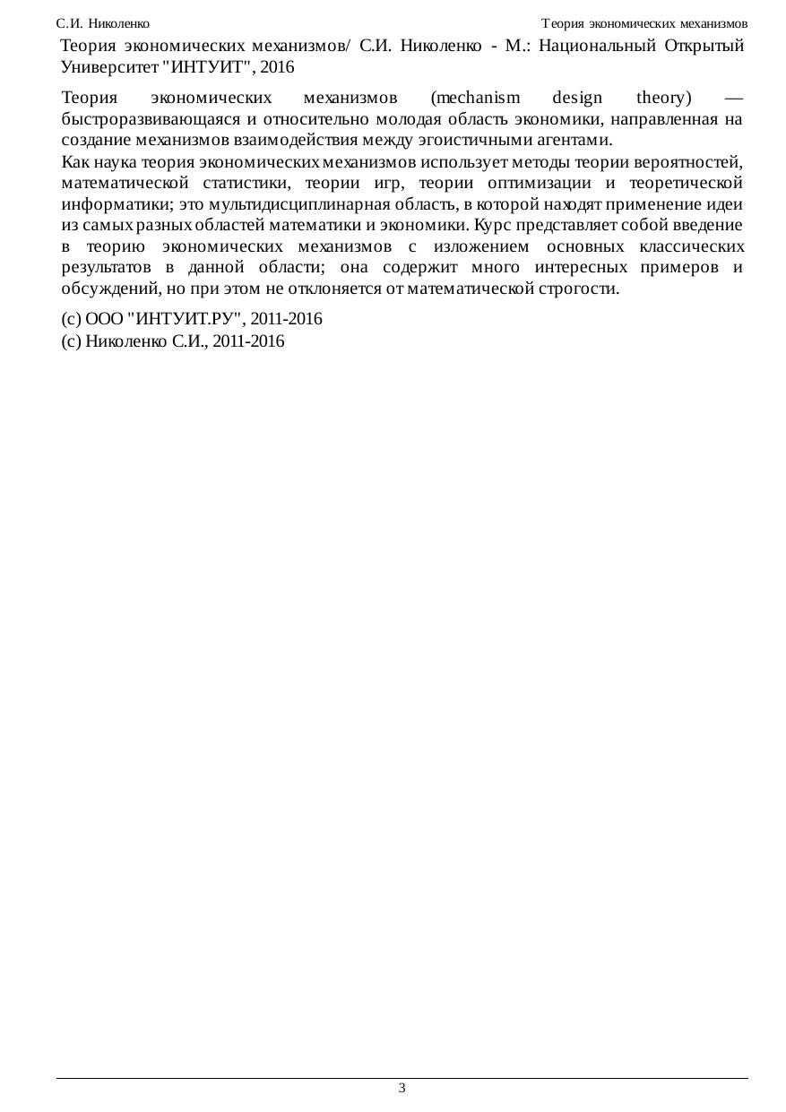 Теория экономических механизмов (mechanism design theory) — быстроразвивающаяся и относительно молодая область экономики, направленная на создание механизмов взаимодействия между эгоистичными агентами. Как наука теория экономических механизмов использует методы теории вероятностей, математической статистики, теории игр, теории оптимизации и теоретической информатики; это мультидисциплинарная область, в которой находят применение идеи из самых разных областей математики и экономики. Курс представляет собой введение в теорию экономических механизмов с изложением основных классических результатов в данной области; она содержит много интересных примеров и обсуждений, но при этом не отклоняется от математической строгости.