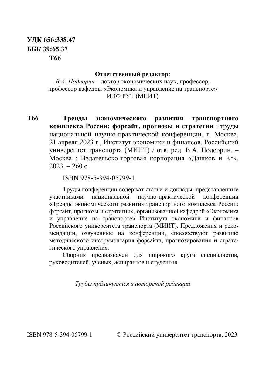 Тренды экономического развития транспортного комплекса России: форсайт, прогнозы и стратегии: Труды национальной научно-практической конференции 21 апреля 2023г.