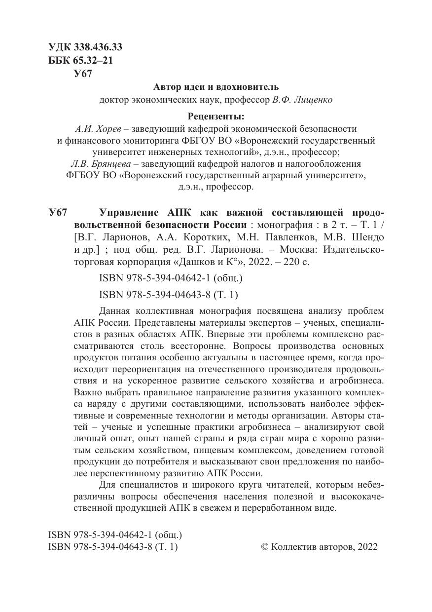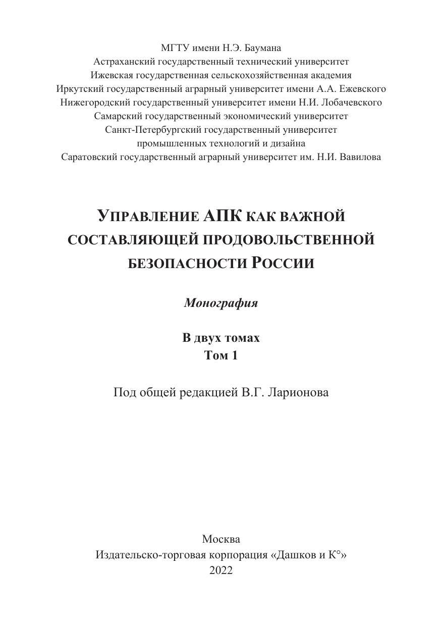 Управление АПК как важной составляющей продовольственной безопасности России, в 2-х томах. Том 1
