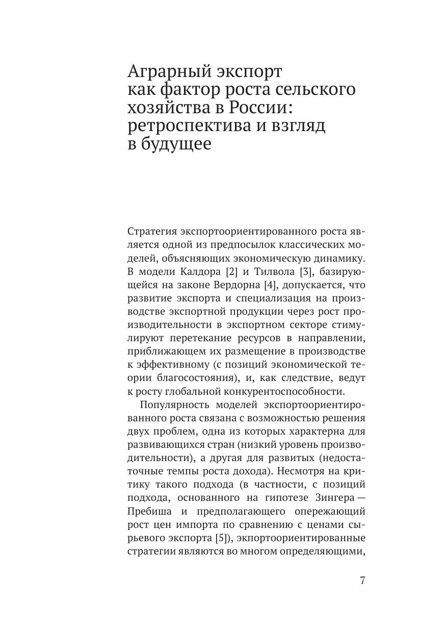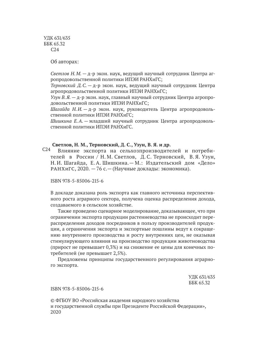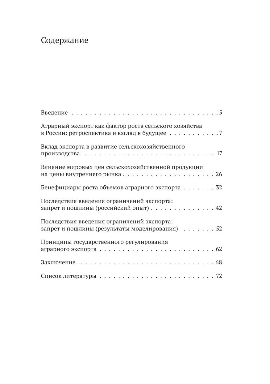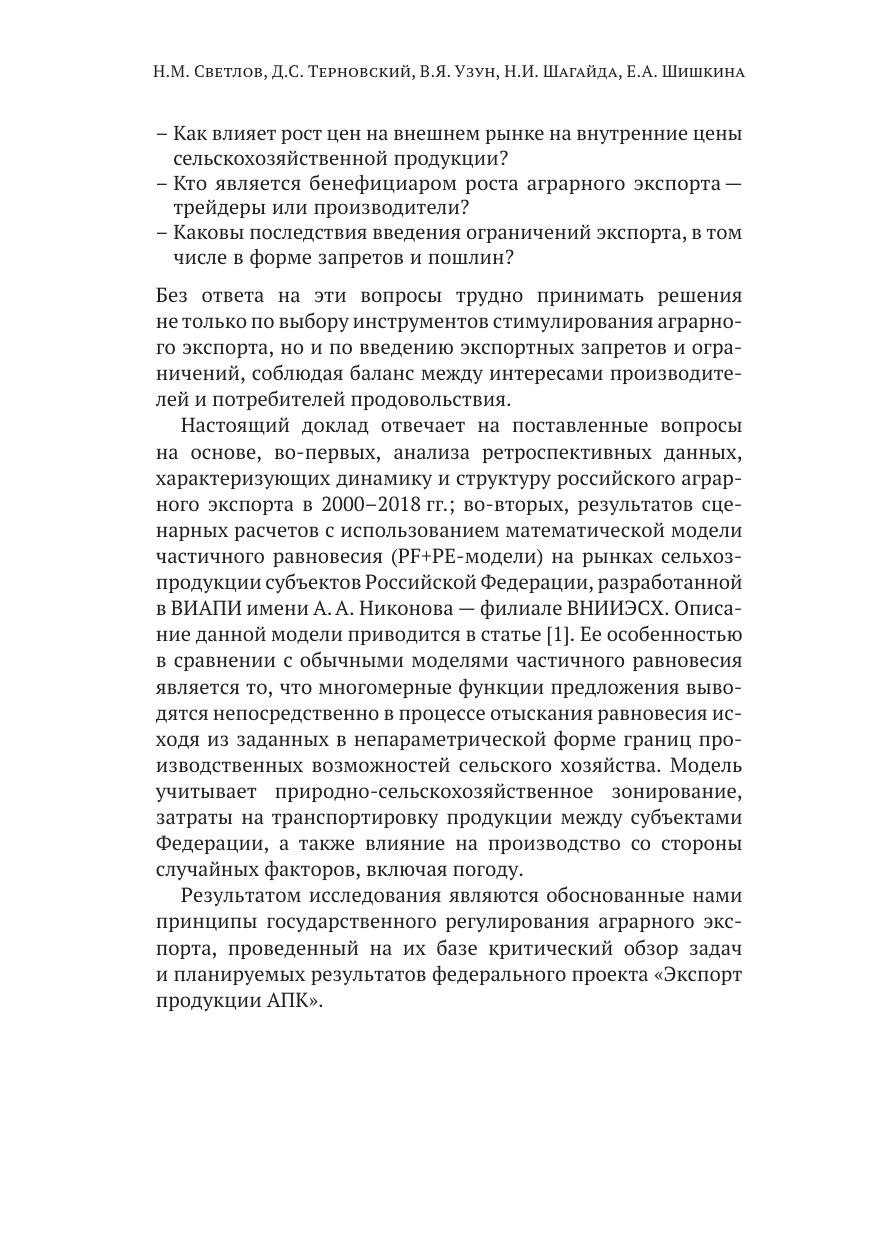 В докладе доказана роль экспорта как главного источника перспектив- ного роста аграрного сектора, получена оценка распределения дохода, создаваемого в сельском хозяйстве. Также проведено сценарное моделирование, доказывающее, что при ограничении экспорта продукции растениеводства не происходит перераспределения доходов посредников в пользу производителей продукции, а ограничения экспорта и экспортные пошлины ведут к сокращению внутреннего производства и росту внутренних цен, не оказывая стимулирующего влияния на производство продукции животноводства (прирост не превышает 0,3%) и на снижение ее цены для конечных потребителей (не превышает 2,5%). Предложены принципы государственного регулирования аграрного экспорта.