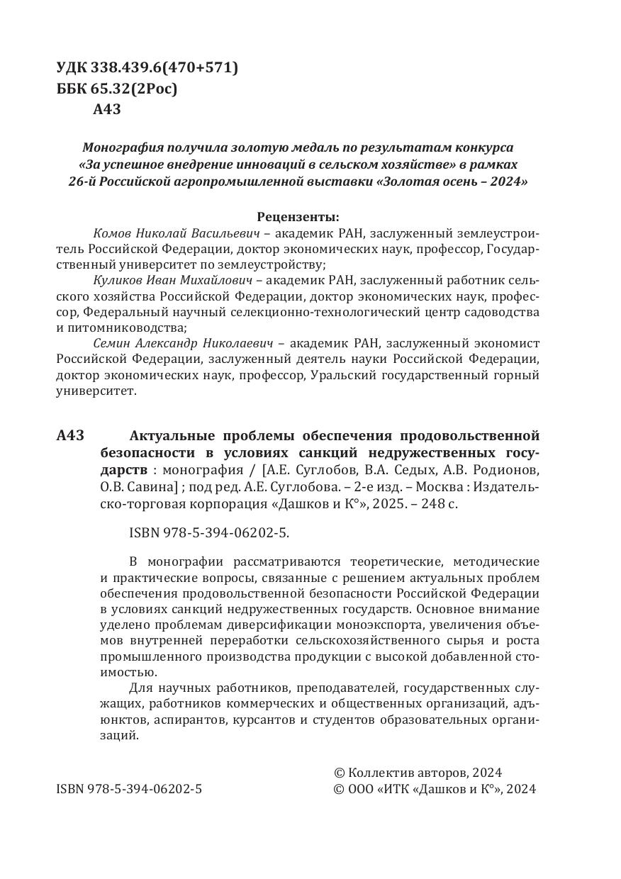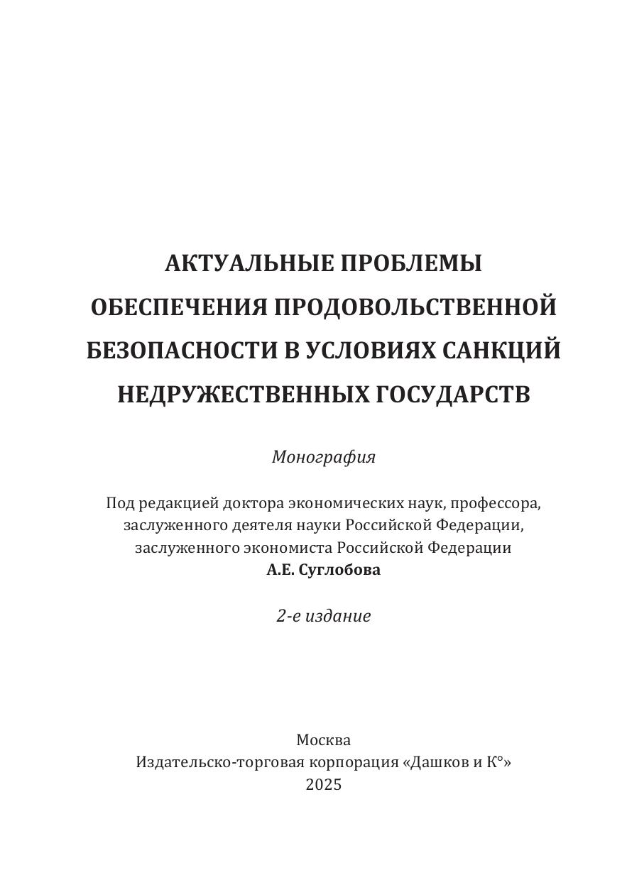 В монографии рассматриваются теоретические, методические и практические вопросы, связанные с решением актуальных проблем обеспечения продовольственной безопасности Российской Федерации в условиях санкций недружественных государств. Основное внимание уделено проблемам диверсификации моноэкспорта, увеличения объемов внутренней переработки сельскохозяйственного сырья и роста промышленного производства продукции с высокой добавленной стоимостью.