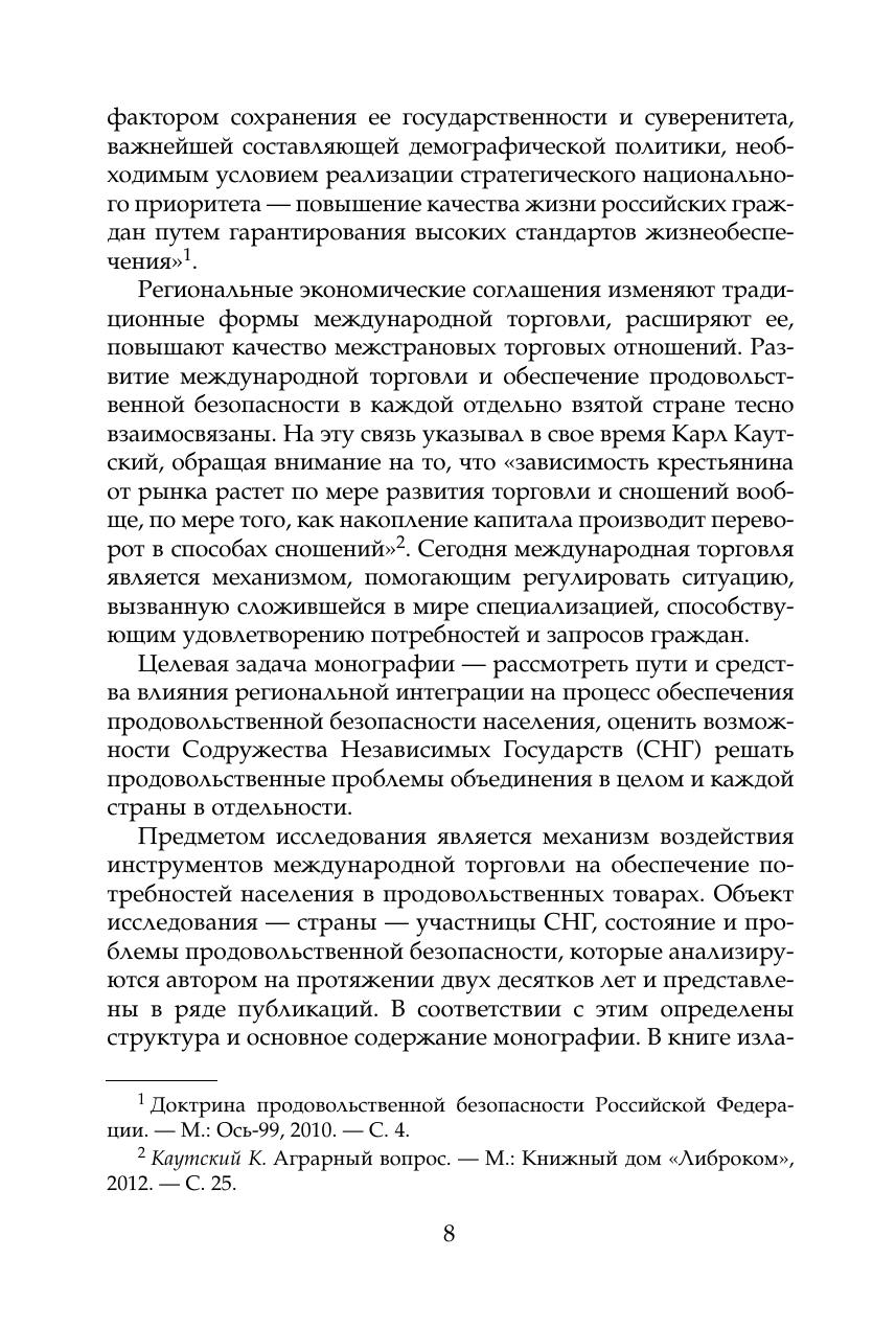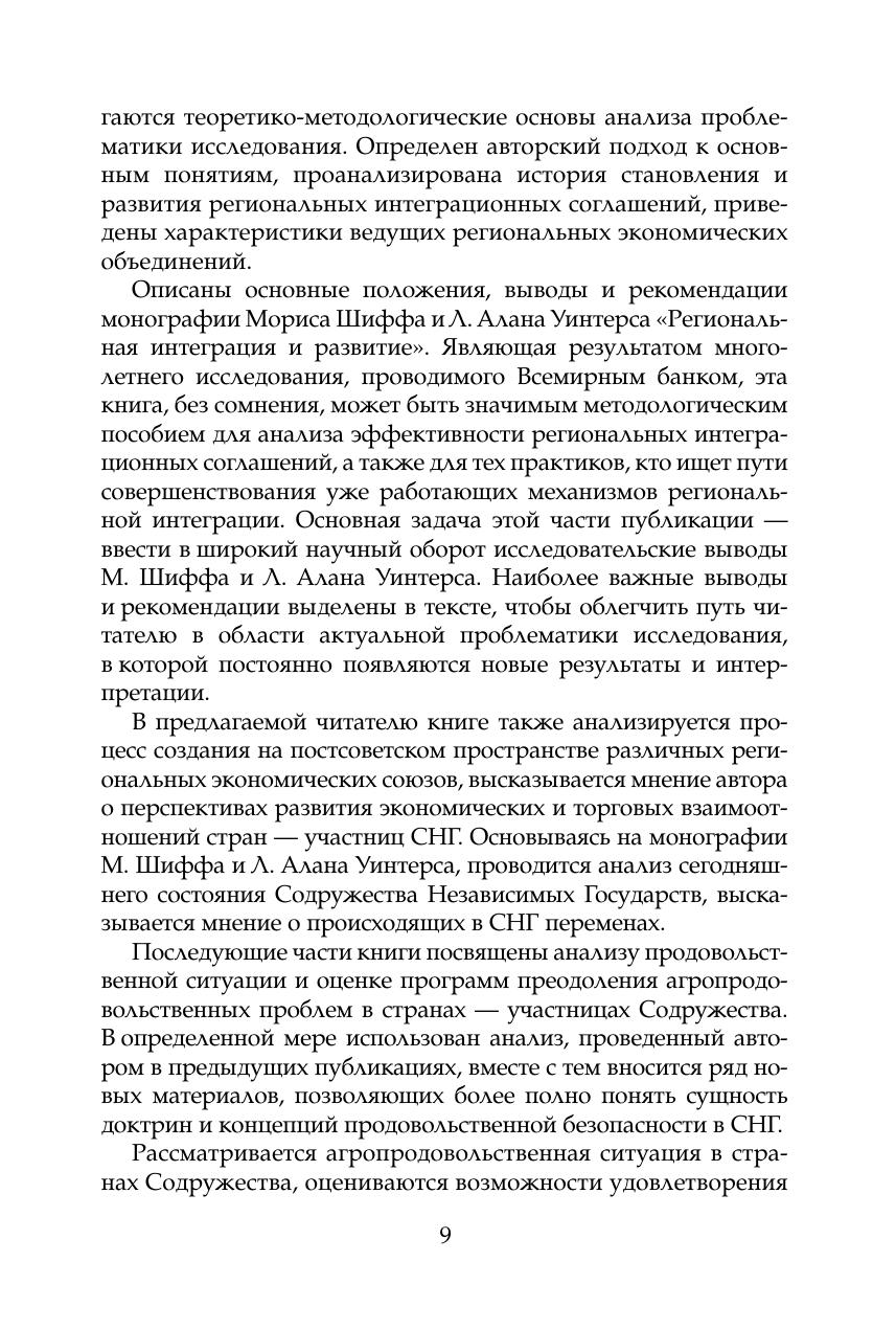 Исследование основывается на теоретико методологической базе, разработанной автором в ряде предыдущих публикаций. Несомненную значимость для исследователей данной проблематики имеет про веденный автором подробный анализ монографии Мориса Шиффа и Л. Алена Уинтерса «Региональная интеграция и развитие», являющейся итогом научно исследовательского проекта, осуществленного Всемирным банком. Эта монография рассматривается как важнейшее методологическое пособие для анализа региональных интеграционных соглашений. Книга может быть полезна всем, кто исследует проблемы развития экономических отношений на постсоциалистическом пространстве, интересуется проблемами продовольственной безопасности, вопросами улучшения снабжения населения продовольствием, в том числе и с помощью международной торговли.