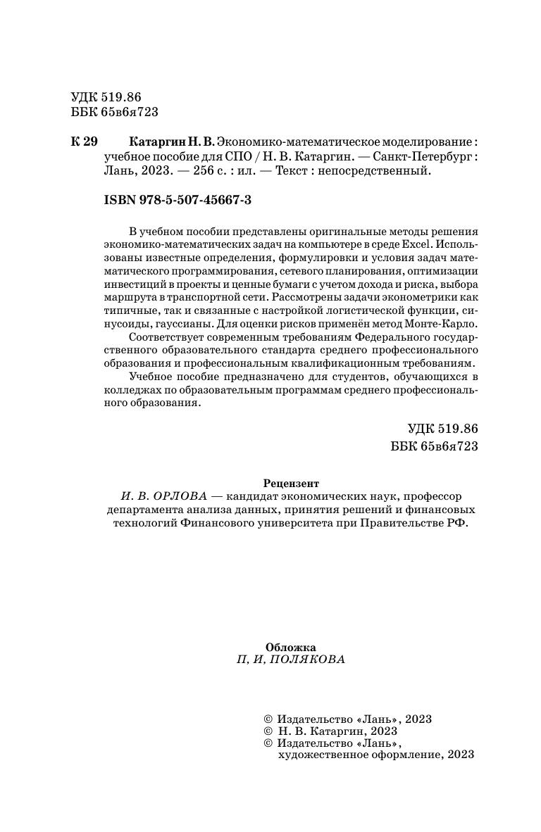 В учебном пособии представлены оригинальные методы решения экономико-математических задач на компьютере в среде Excel. Использованы известные определения, формулировки и условия задач математического программирования, сетевого планирования, оптимизации инвестиций в проекты и ценные бумаги с учетом дохода и риска, выбора маршрута в транспортной сети. Рассмотрены задачи эконометрики как типичные, так и связанные с настройкой логистической функции, синусоиды, гауссианы. Для оценки рисков применён метод Монте-Карло. Соответствует современным требованиям Федерального государственного образовательного стандарта среднего профессионального образования и профессиональным квалификационным требованиям. Учебное пособие предназначено для студентов, обучающихся в колледжах по образовательным программам среднего профессионального образования.