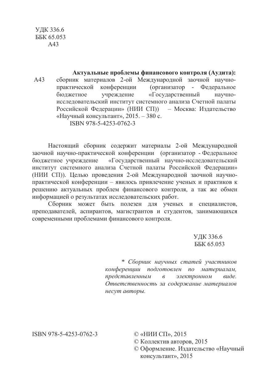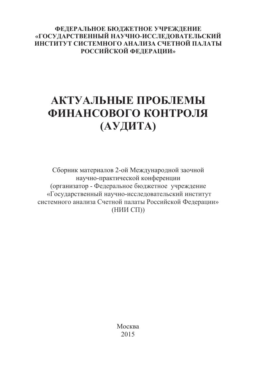 Настоящий сборник содержит материалы 2-ой Международной заочной научно-практической конференции (организатор - Федеральное бюджетное учреждение «Государственный научно-исследовательский институт системного анализа Счетной палаты Российской Федерации» (НИИ СП)). Целью проведения 2-ой Международной заочной научно-практической конференции - явилось привлечение ученых и практиков к решению актуальных проблем финансового контроля, а так же обмен информацией о результатах исследовательских работ.