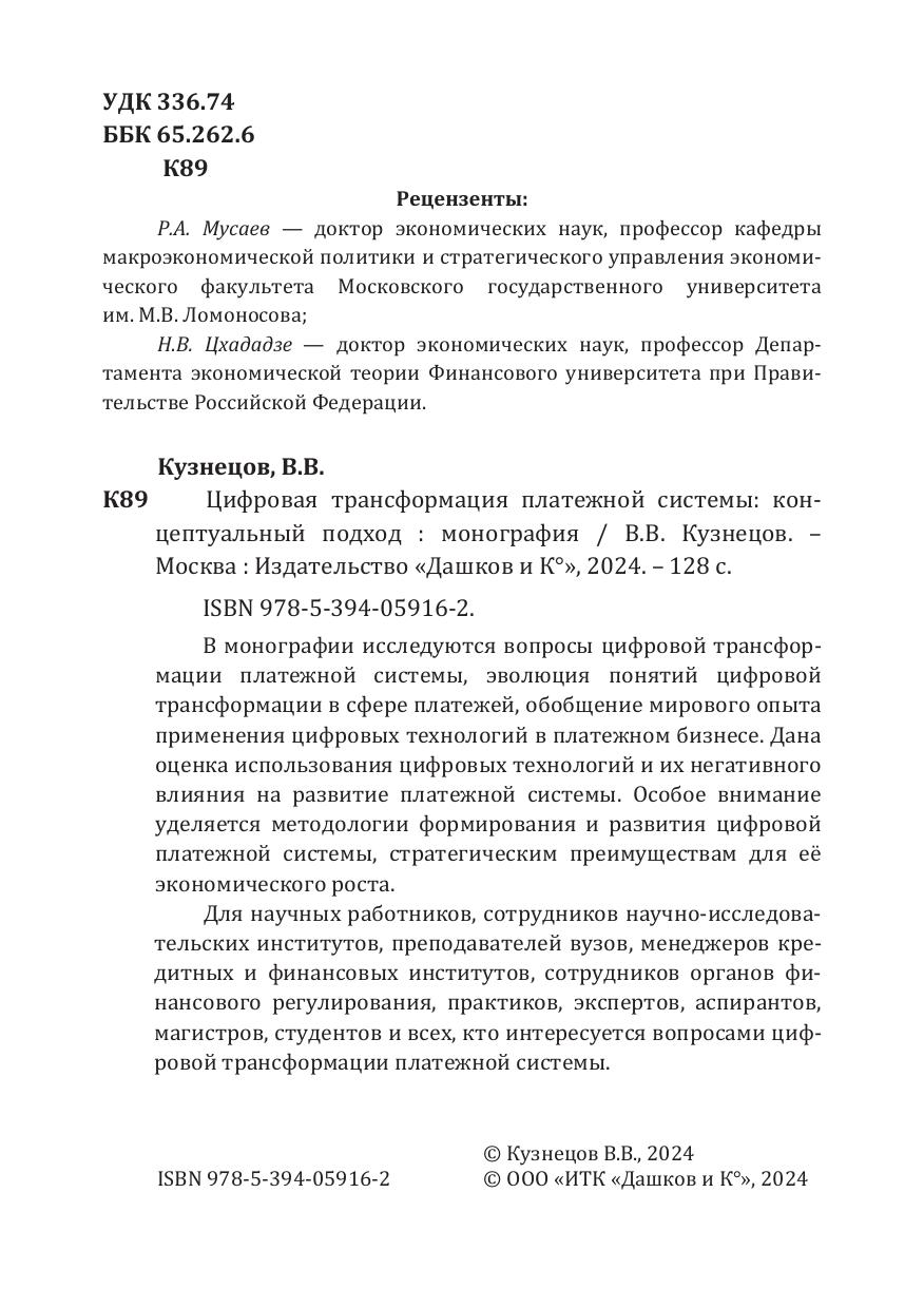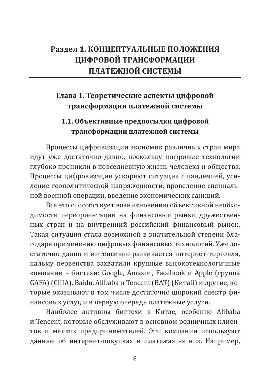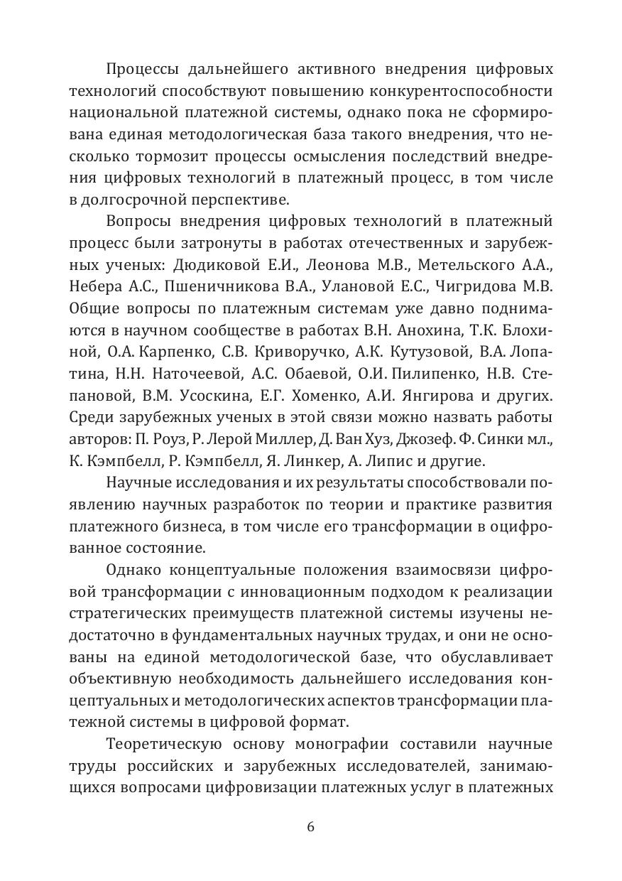 В монографии исследуются вопросы цифровой трансформации платежной системы, эволюция понятий цифровой трансформации в сфере платежей, обобщение мирового опыта применения цифровых технологий в платежном бизнесе. Дана оценка использования цифровых технологий и их негативного влияния на развитие платежной системы. Особое внимание уделяется методологии формирования и развития цифровой платежной системы, стратегическим преимуществам для её экономического роста.