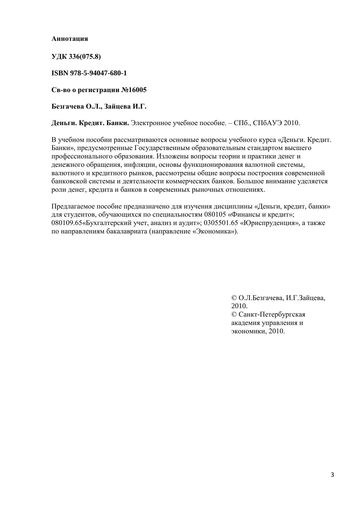 В учебном пособии рассматриваются основные вопросы учебного курса «Деньги. Кредит. Банки», предусмотренные Государственным образовательным стандартом высшего профессионального образования. Изложены вопросы теории и практики денег и денежного обращения, инфляции, основы функционирования валютной системы, валютного и кредитного рынков, рассмотрены общие вопросы построения современной банковской системы и деятельности коммерческих банков. Большое внимание уделяется роли денег, кредита и банков в современных рыночных отношениях. Предлагаемое пособие предназначено для изучения дисциплины «Деньги, кредит, банки» для студентов, обучающихся по специальностям 080105 «Финансы и кредит» 080109.65«Бухгалтерский учет, анализ и аудит» 0305501.65 «Юриспруденция», а также по направлениям бакалавриата (направление «Экономика»). Электронное учебное пособие для дистанционного обучения