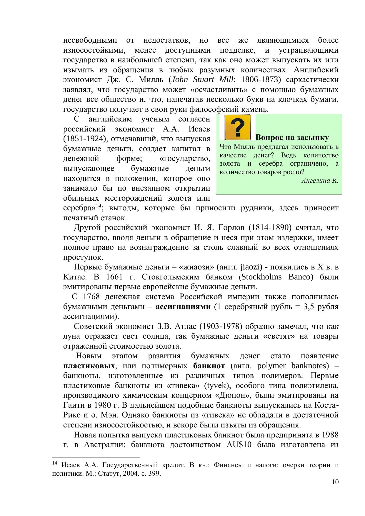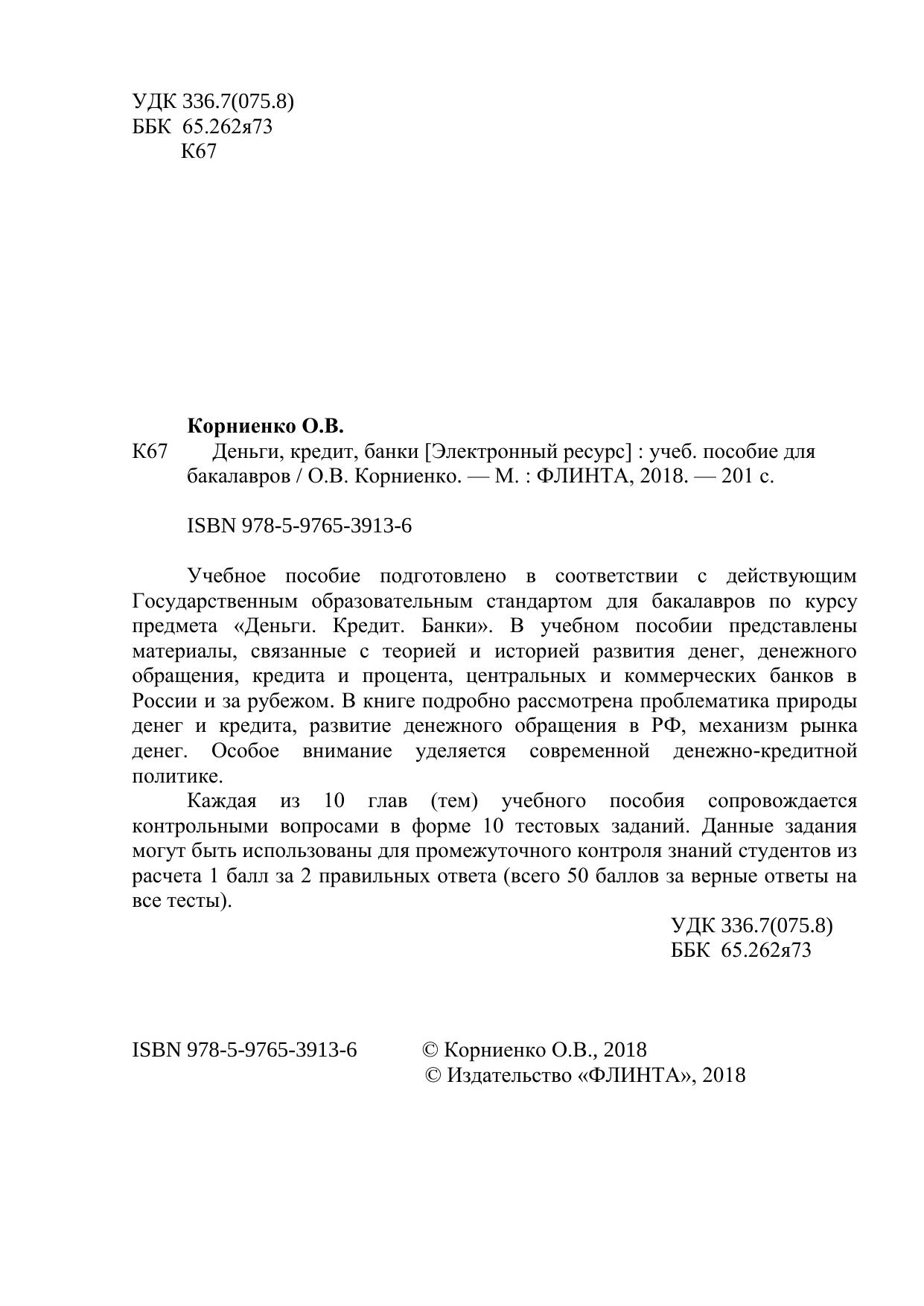 денег. Особое внимание уделяется современной денежно-кредитной политике. Каждая из 10 глав (тем) учебного пособия сопровождается контрольными вопросами в форме 10 тестовых заданий. Данные задания могут быть использованы для промежуточного контроля знаний студентов из расчета 1 балл за 2 правильных ответа (всего 50 баллов за верные ответы на все тесты).