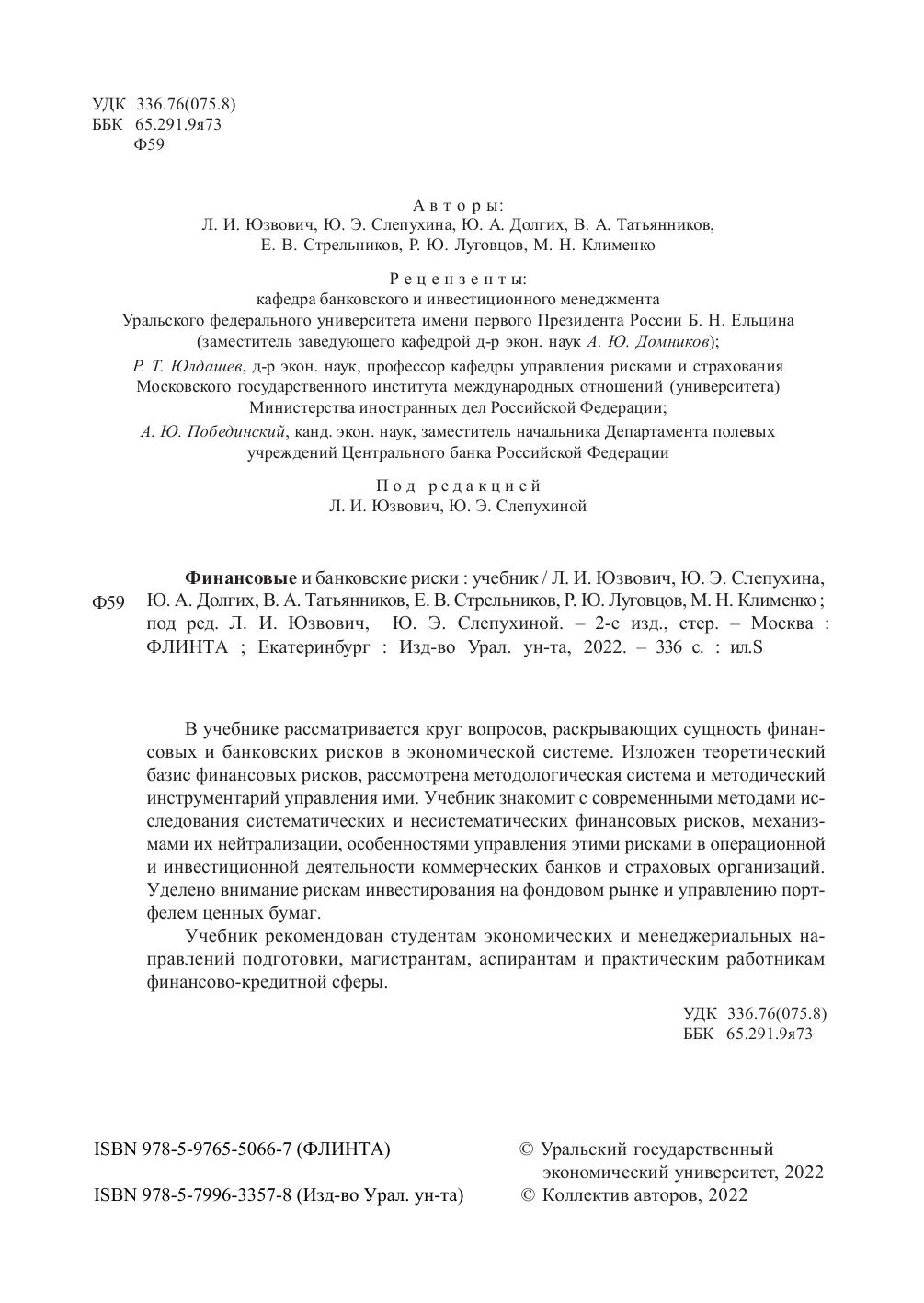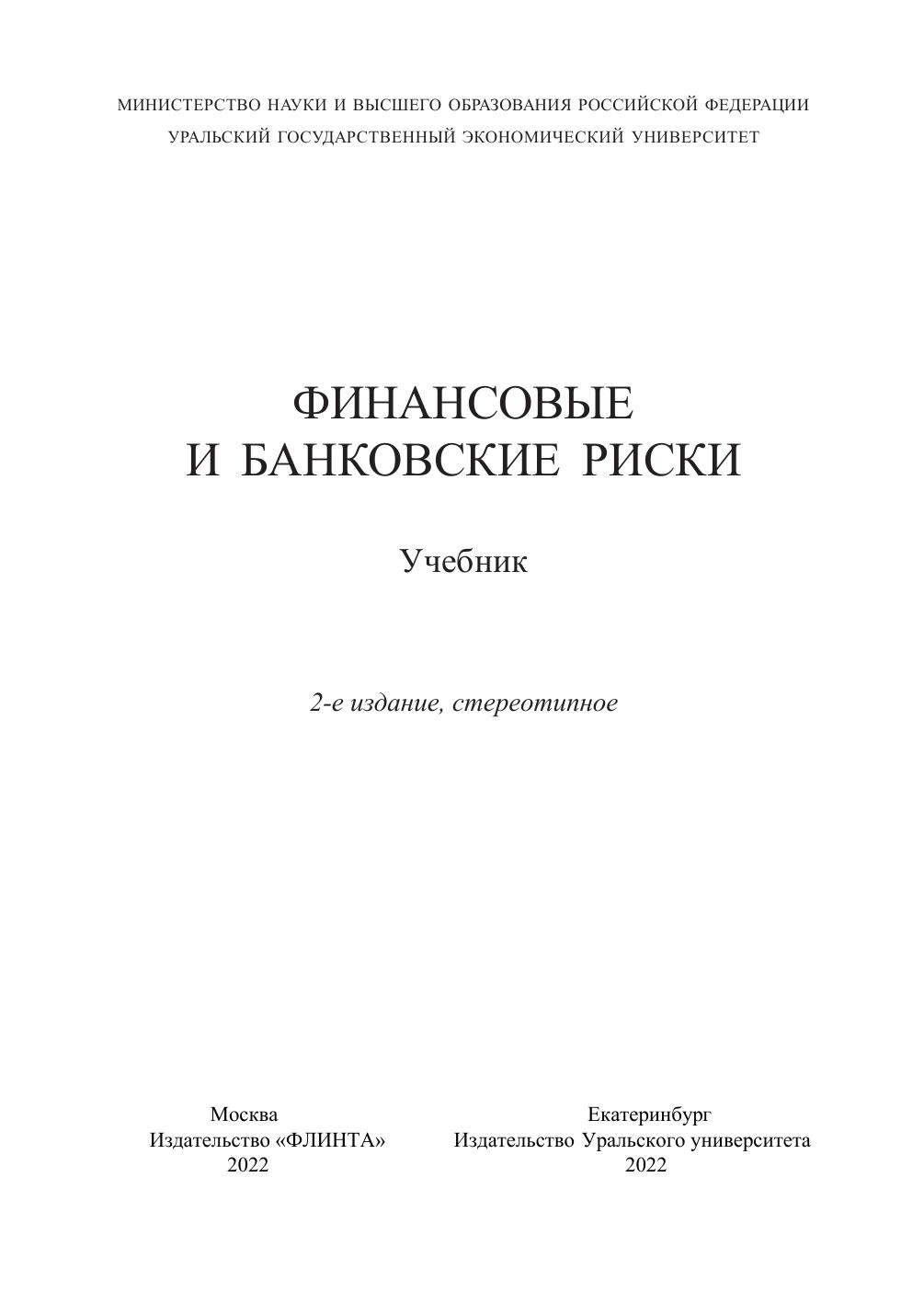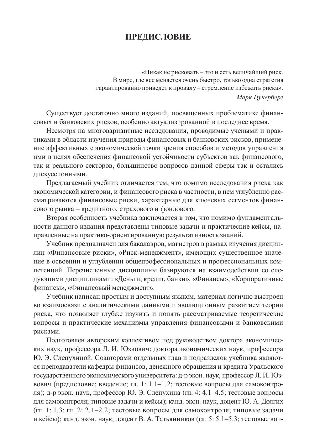 В учебнике рассматривается круг вопросов, раскрывающих сущность финансовых и банковских рисков в экономической системе. Изложен теоретический базис финансовых рисков, рассмотрена методологическая система и методический инструментарий управления ими. Учебник знакомит с современными методами исследования систематических и несистематических финансовых рисков, механизмами их нейтрализации, особенностями управления этими рисками в операционной и инвестиционной деятельности коммерческих банков и страховых организаций. Уделено внимание рискам инвестирования на фондовом рынке и управлению портфелем ценных бумаг.